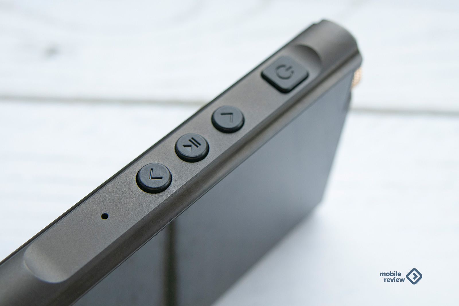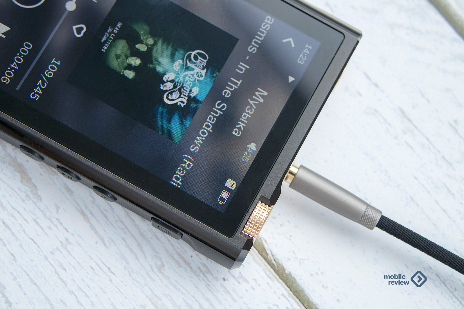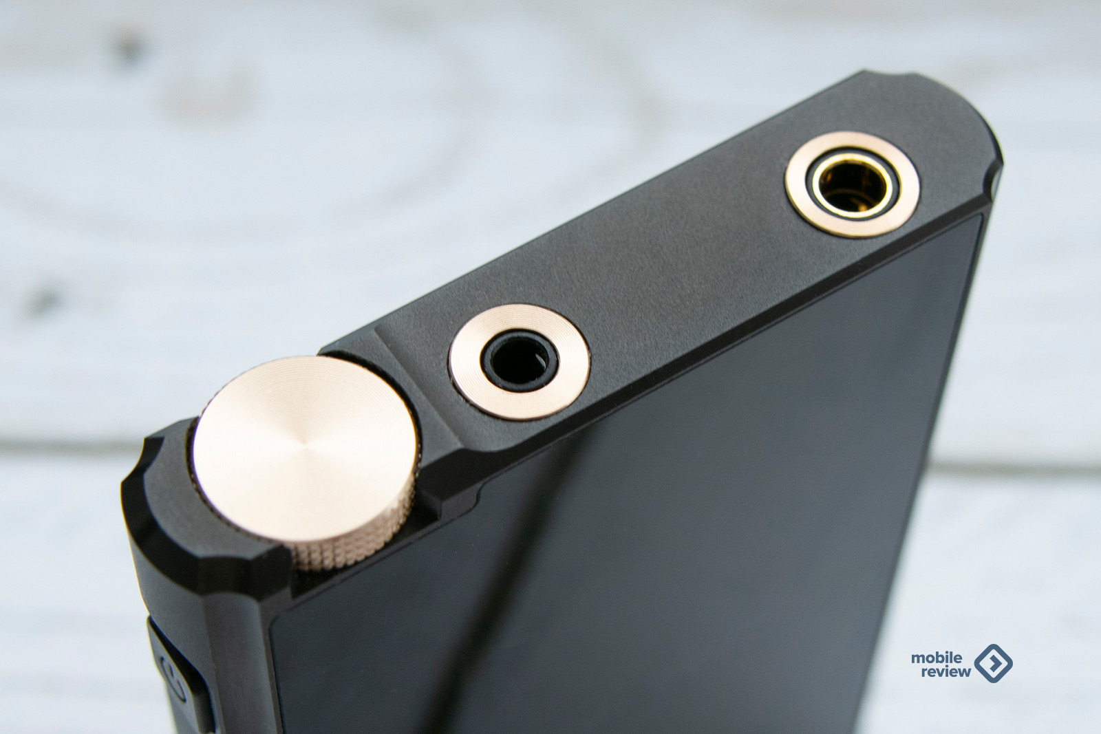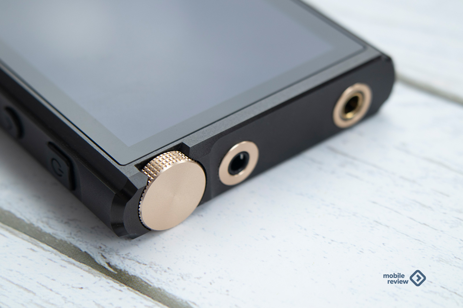 Выходы на наушники (небалансный 3.5 мм и балансный 4.4 мм) сверху, там же расположен энкодер-крутилка, с помощью которого регулируется громкость. Крутить легко и удобно, но долго: градаций много, за одно движение получается переключить не так много «единиц громкости» из-за особенностей конструкции. С одной стороны, точность подстройки высокая, с другой – если надо сделать заметно громче, придётся крутить активно. Металлические кольца вокруг разъёмов выполняют чисто декоративную функцию, да и про энкодер сказать особенно нечего: он довольно легко поворачивается, но зато отлично контролируется пальцами за счёт хорошей насечки, высокие «рамки» корпуса не дают ему самостоятельно крутиться в карманах или сумках, требуя «вдумчивого» хвата — для регулировки надо полноценно взять в руку плеер, а не просто задеть пальцем по касательной.