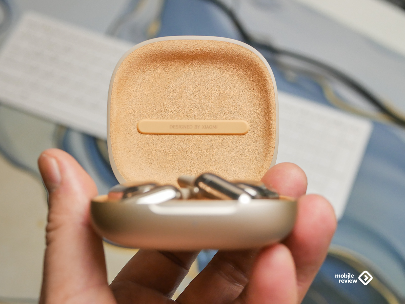 Внутри крышка отделана мягкой бархаткой, на которой аккуратно выпуклой дорожкой выбито Designed by Xiaomi.