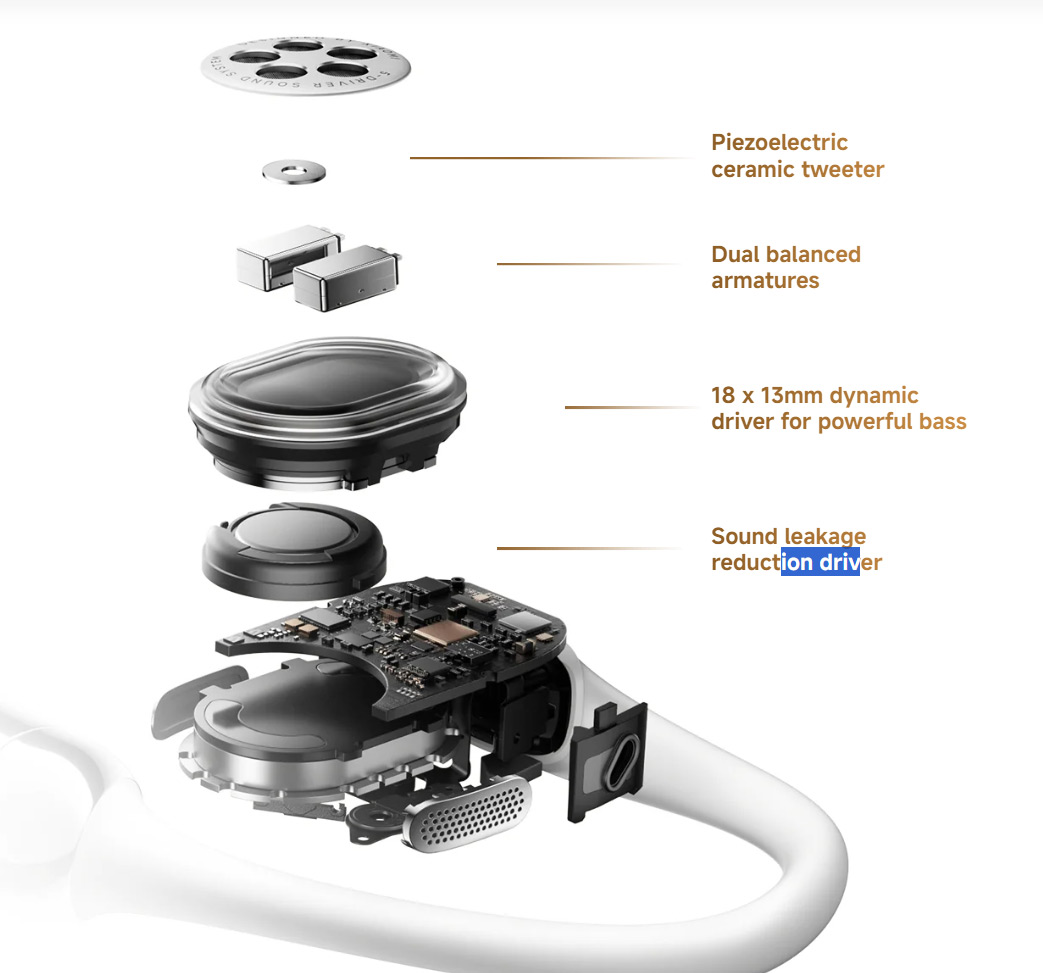 Мне кажется, главная фишка этих наушников в том, что Xiaomi решила подойти к открытой акустике не просто «как обычно», а прямо заморочиться. Здесь довольно необычная многодрайверная схема: большой овальный динамик отвечает за низы, два балансных якоря тянут середину, а на верхние частоты работает отдельный пьезоэлемент.