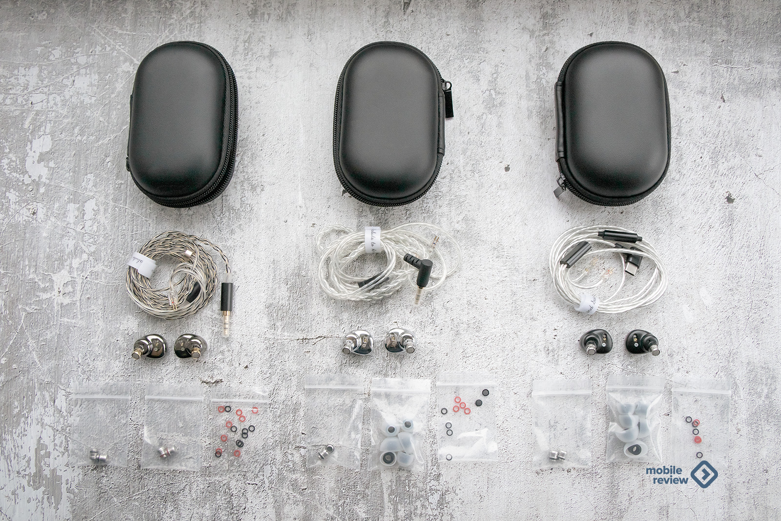 Так как наушники — представители одной серии, содержимое их коробок тоже практически идентично. У каждой модели есть фирменный плотный чехол-кофр на молнии, сменный кабель из посеребрённой меди (или меди высокой очистки OFC у EA500 LM), сменные звуководы-фильтры, комплект запасных резиновых уплотнительных колец для звуководов чёрного и красного цветов, пакетик с резиновыми амбушюрами трёх размеров и бумажки-инструкции. Отличия же кроются в кабелях и звуководах. У EA500 и EA500 LM кабели оканчиваются 3.5 мм джеками, а у EA500 DSP — разъёмом USB-C, плюс разделительная муфта большего размера, так как внутри неё скрыт ЦАП-усилитель, а на правом проводе висит чёрный тонкий микрофон с кнопкой. Также у модели EA500 LM есть не два набора звуководов — серебристые с чёрной и красной резинками, а три: добавлен ещё латунный с красными уплотнителями.