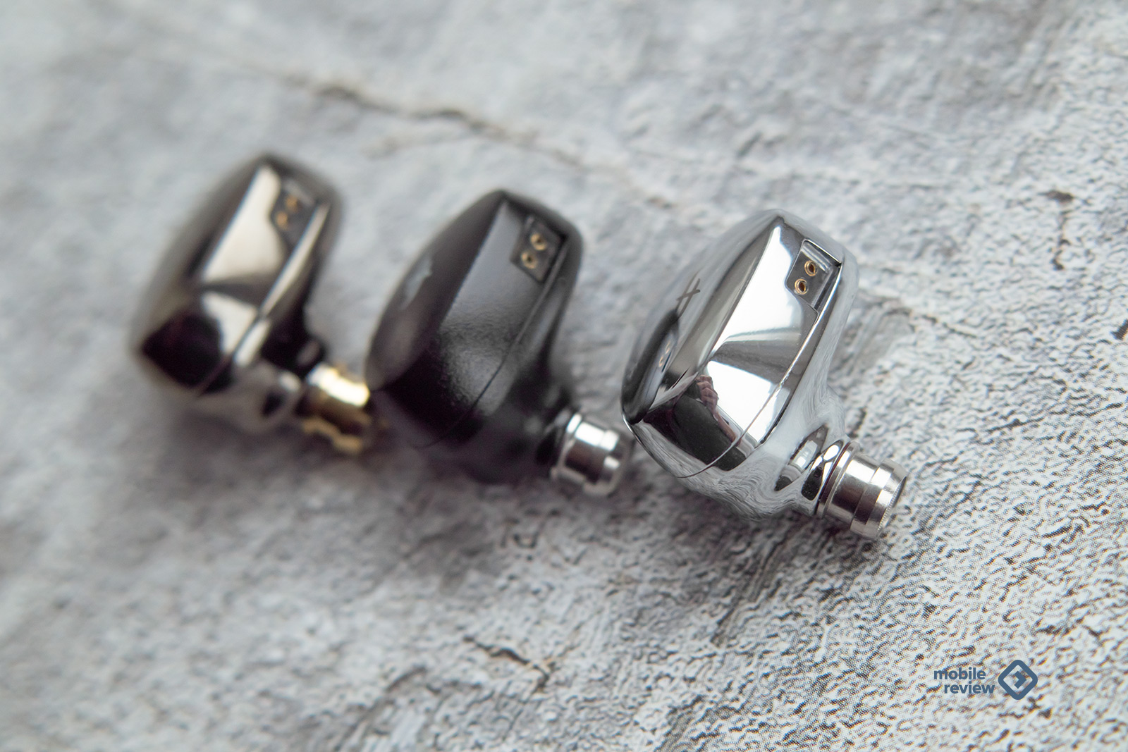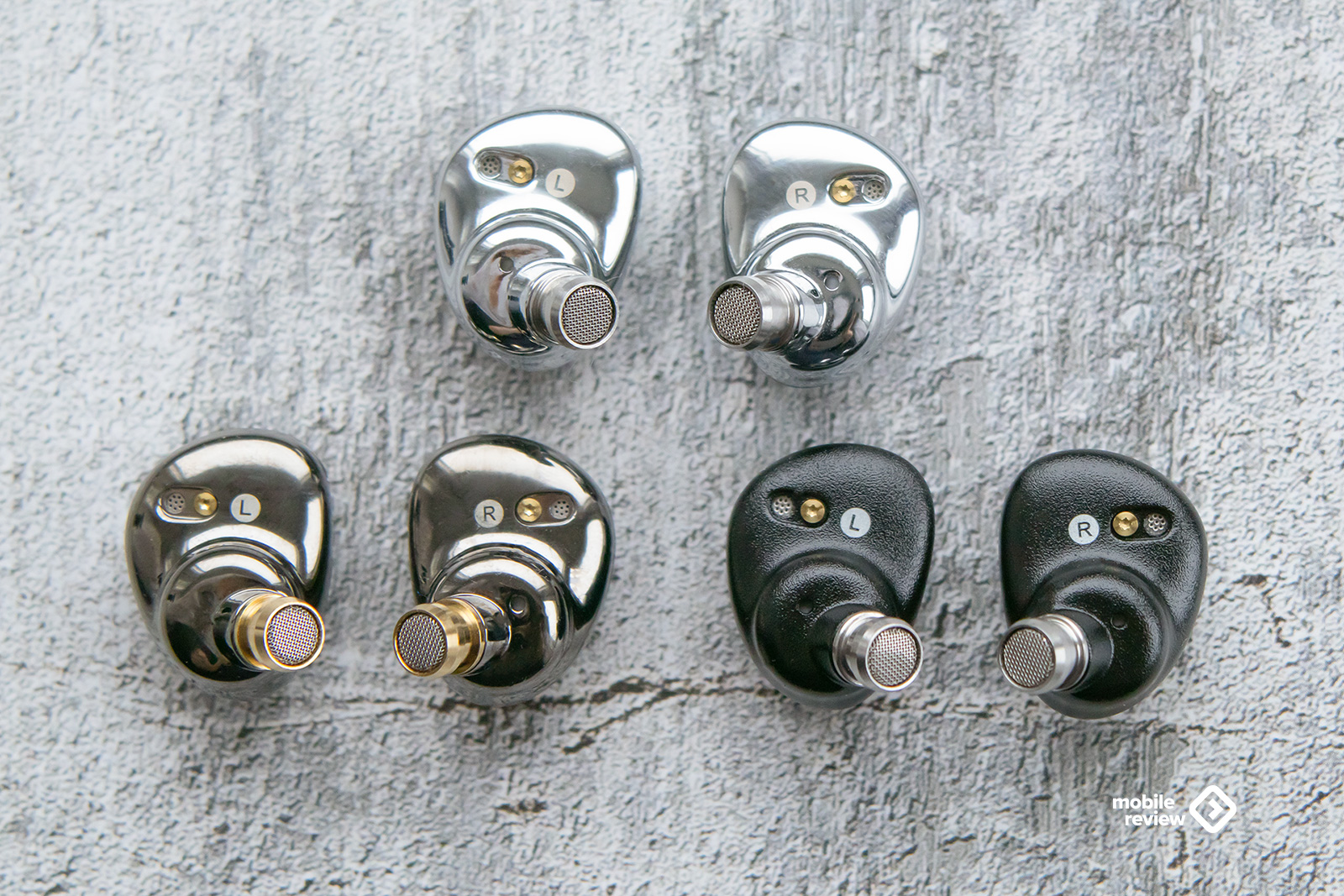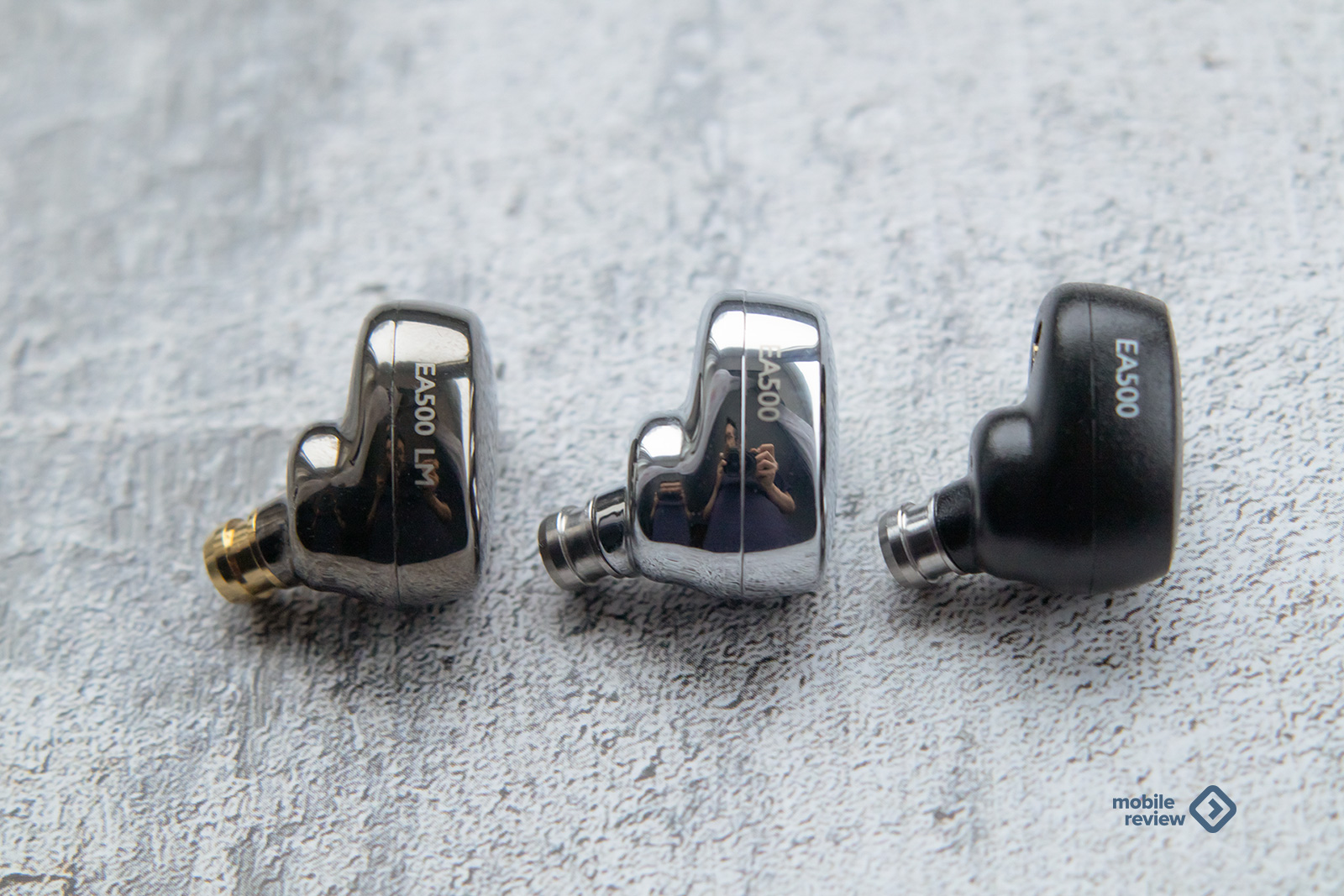 Наушники хоть и выглядят по-разному, все отлиты из металла и обработаны на ЧПУ-станке. У обычных EA500 светлый корпус отполирован до зеркального блеска, EA500 LM выглядят более матовыми и темными, а «цифровые» EA500 DSP имеют чёрное матовое песочное покрытие. На внешних сторонах корпусов нанесены логотипы, внутренние же части двухуровневые, с компенсационными акустическими отверстиями, рядом с которыми есть маркировка правого и левого каналов. Подключаются наушники к кабелю стандартным разъёмом типа «микровилка» 0.78 мм, так что остаётся возможность замены на любимый кастомный кабель и, таким образом, апгрейда-изменения звука (да, кабели действительно влияют на звук!). Звуководы наклонены в сторону ушного канала и просто вкручиваются в корпус руками: никаких особых усилий, никаких сложностей, всё мягко, точно, соединение дополнительно фиксируется маленьким резиновым колечком у основания резьбы. Я ходил с наушниками, доставал-убирал в чехол, менял амбушюры — ноль проблем, резьба не раскрутилась ни на йоту.