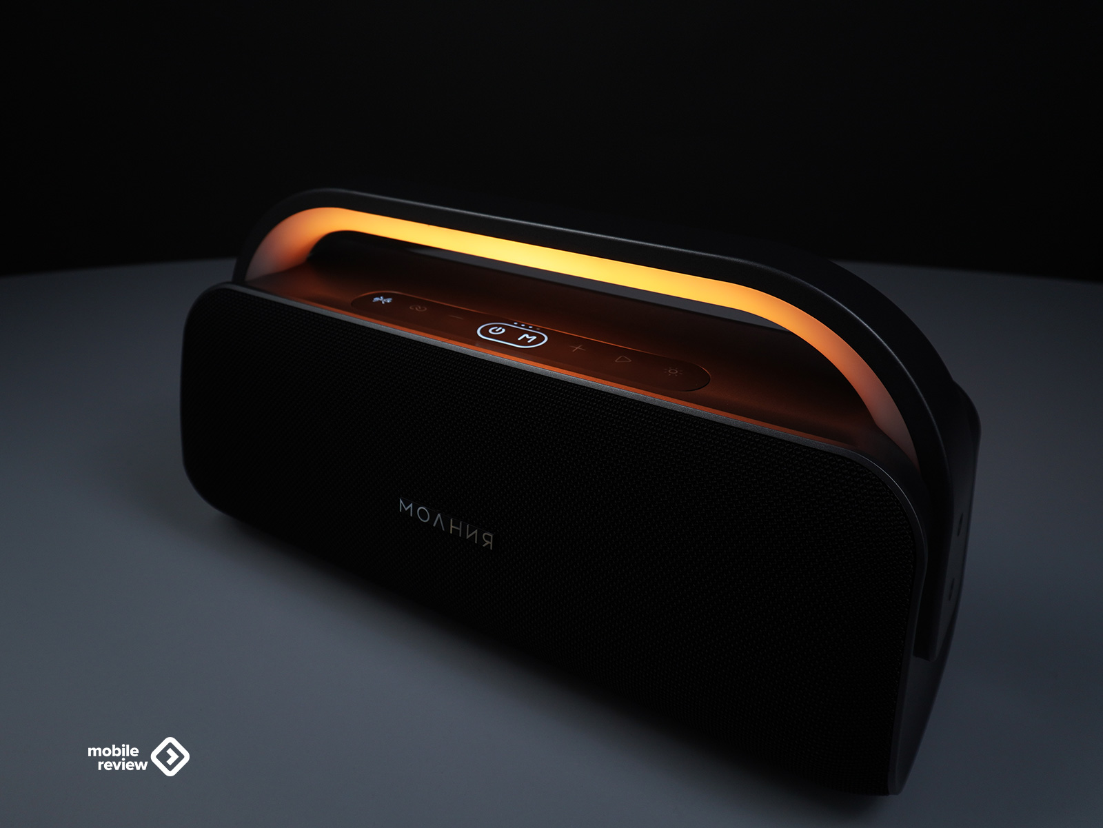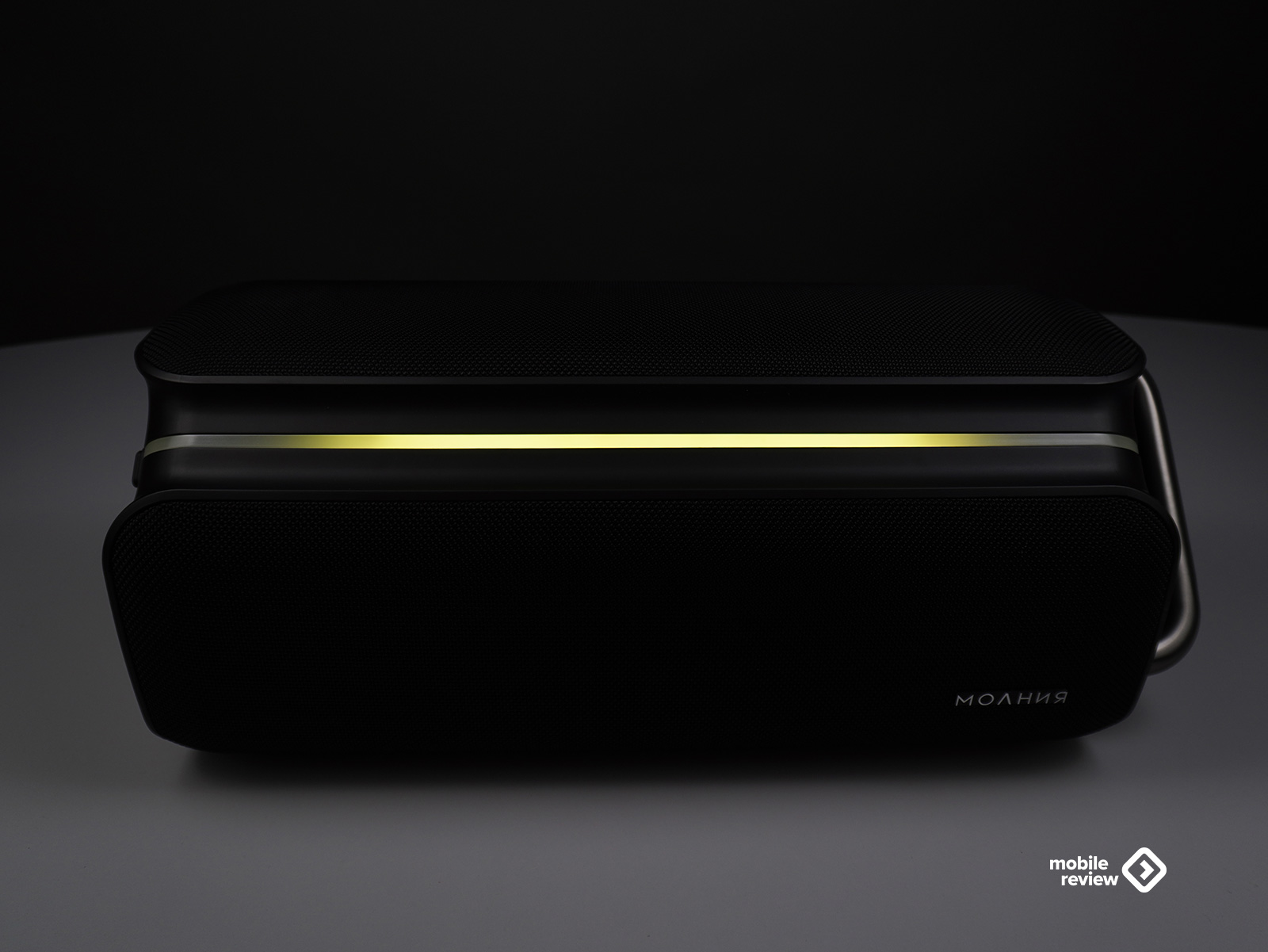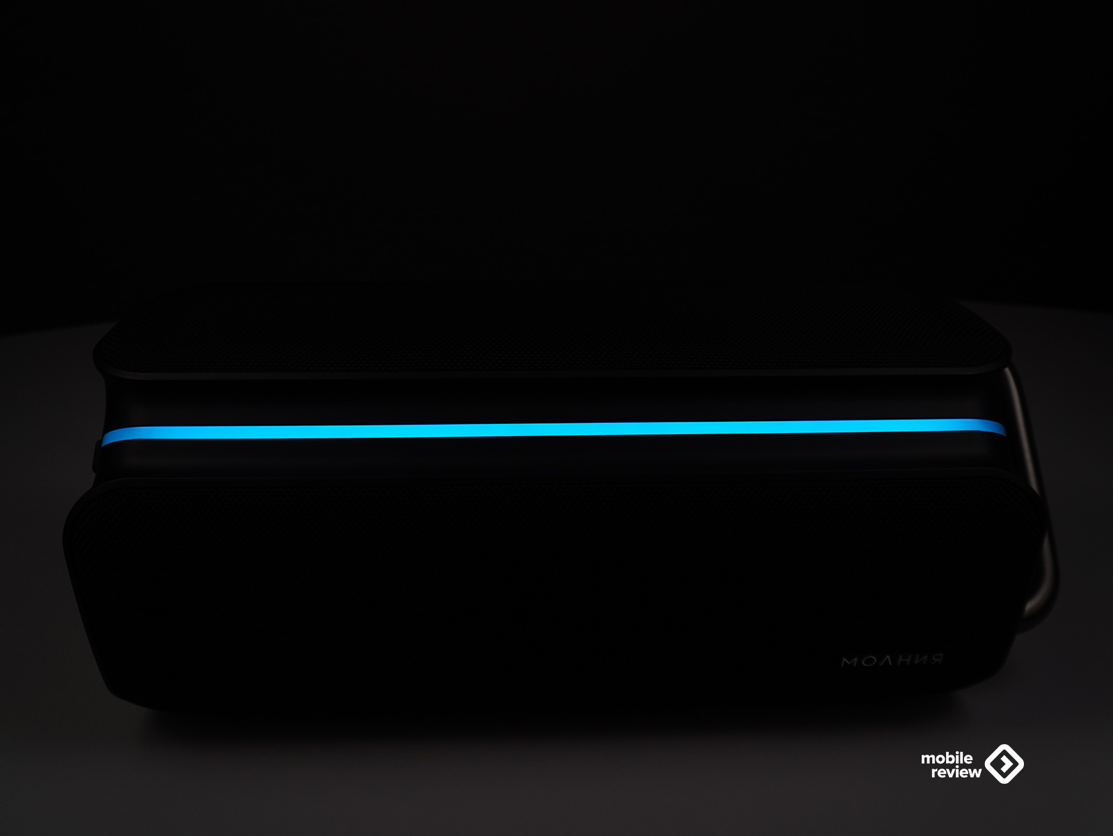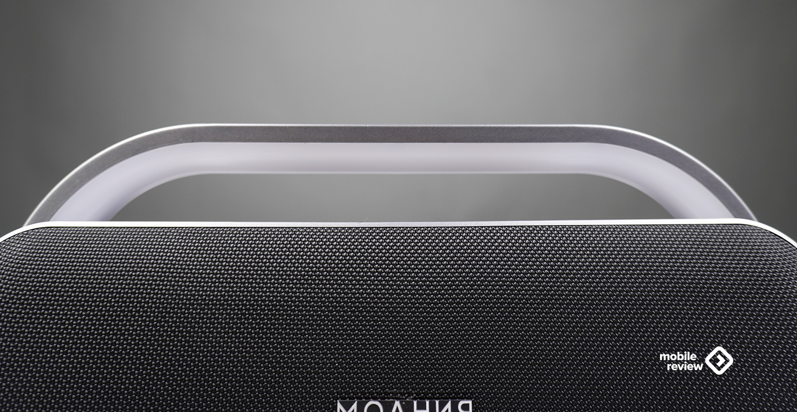 А вот «Молния Кварк», наоборот, имеет большую полупрозрачную полосу в нижней части рукояти переноски, которая отражается в самой колонке. Так что света получается заметно больше. Верх колонки буквально светится при включении.