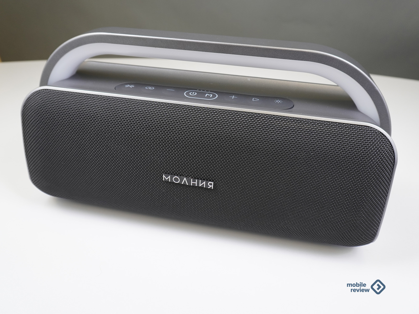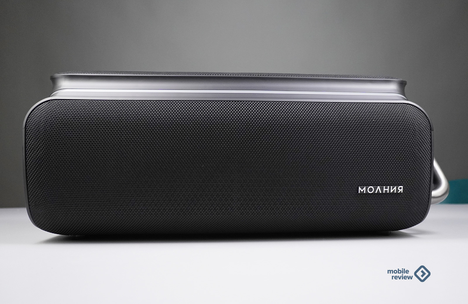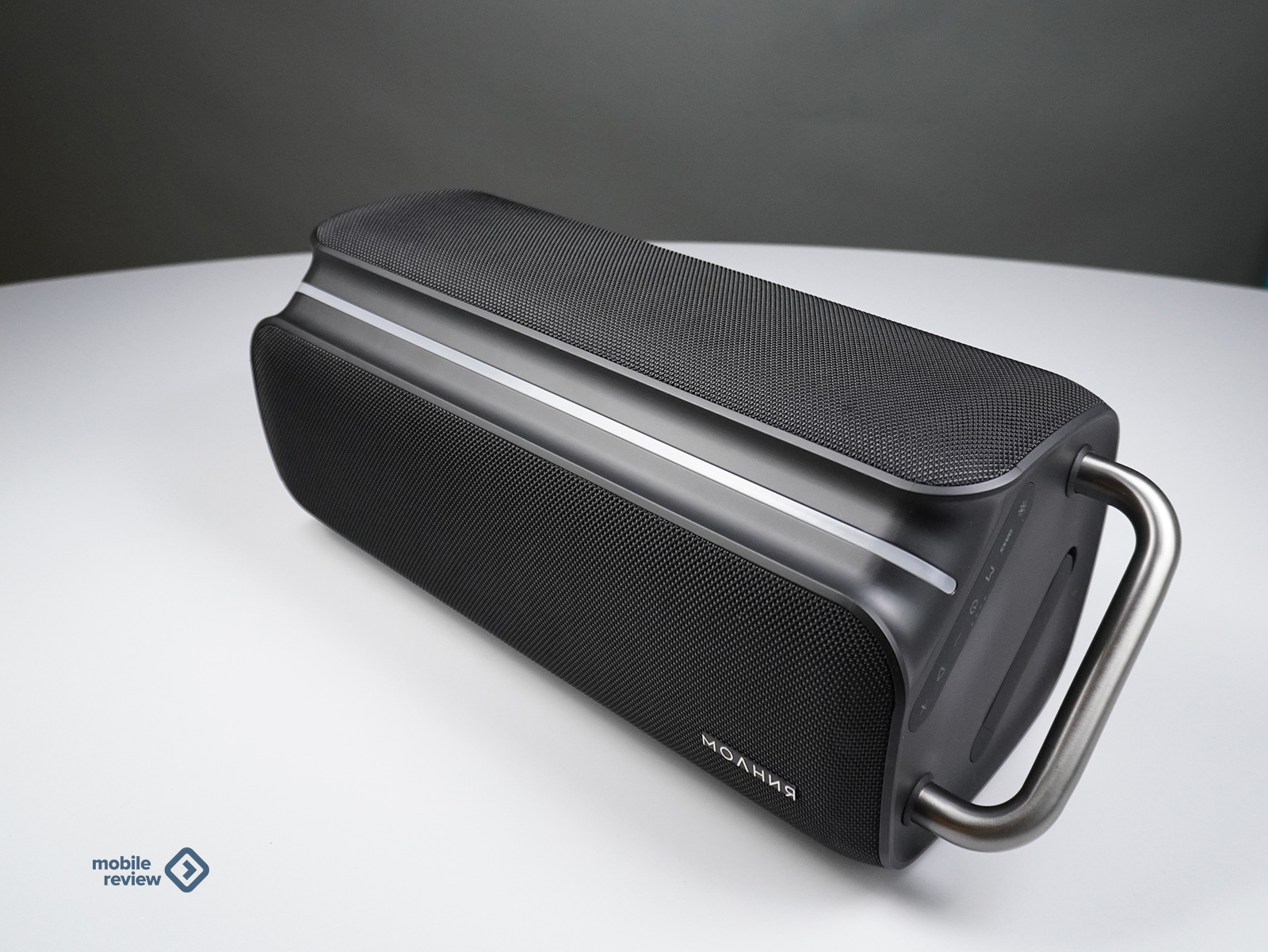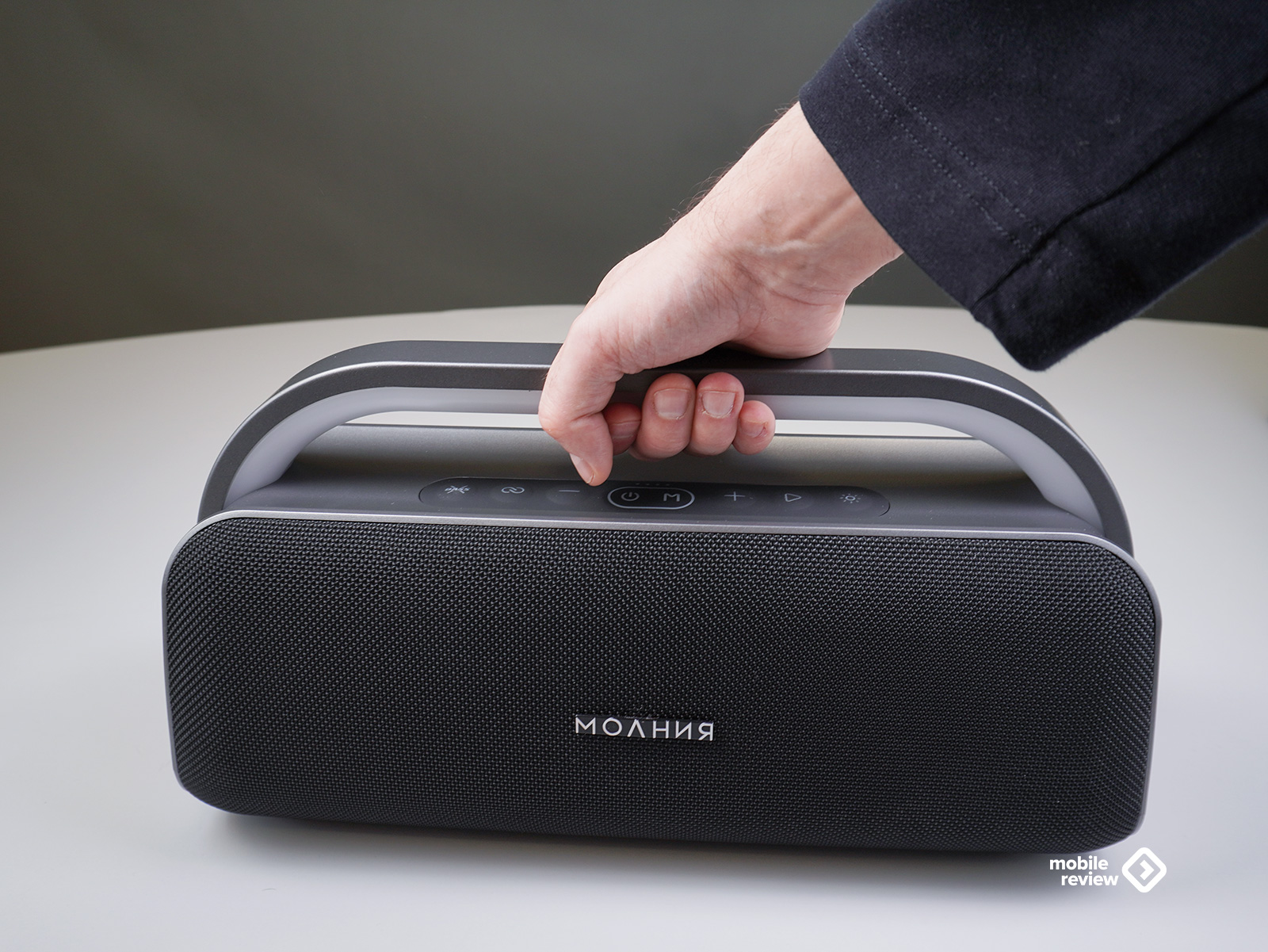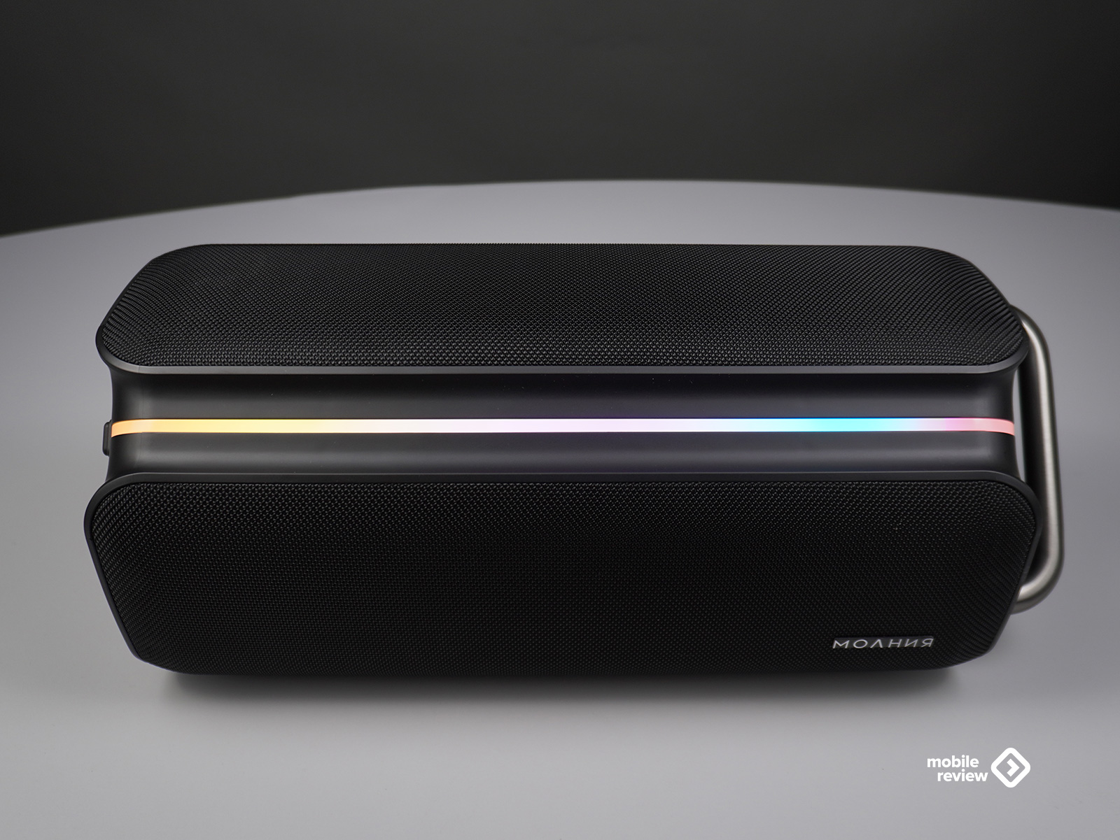 А вот «Молния Кварк», наоборот, имеет большую полупрозрачную полосу в нижней части рукояти переноски, которая отражается в самой колонке. Так что света получается заметно больше. Верх колонки буквально светится при включении.