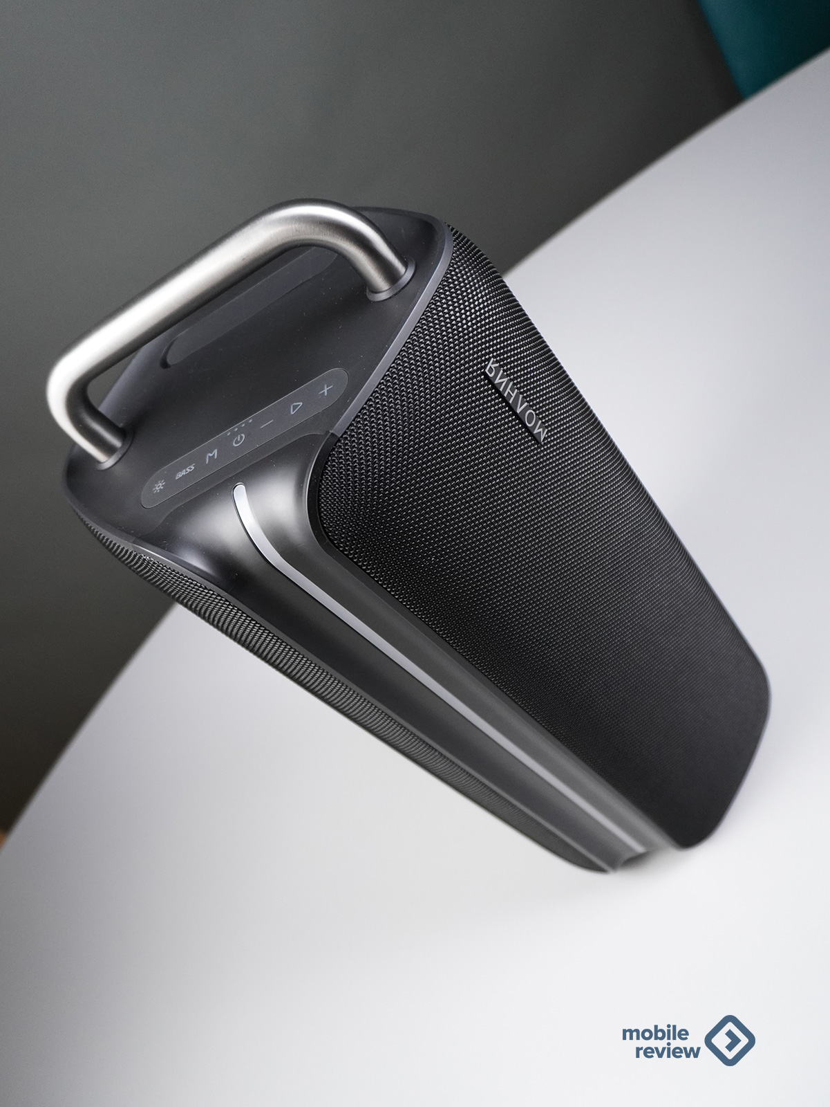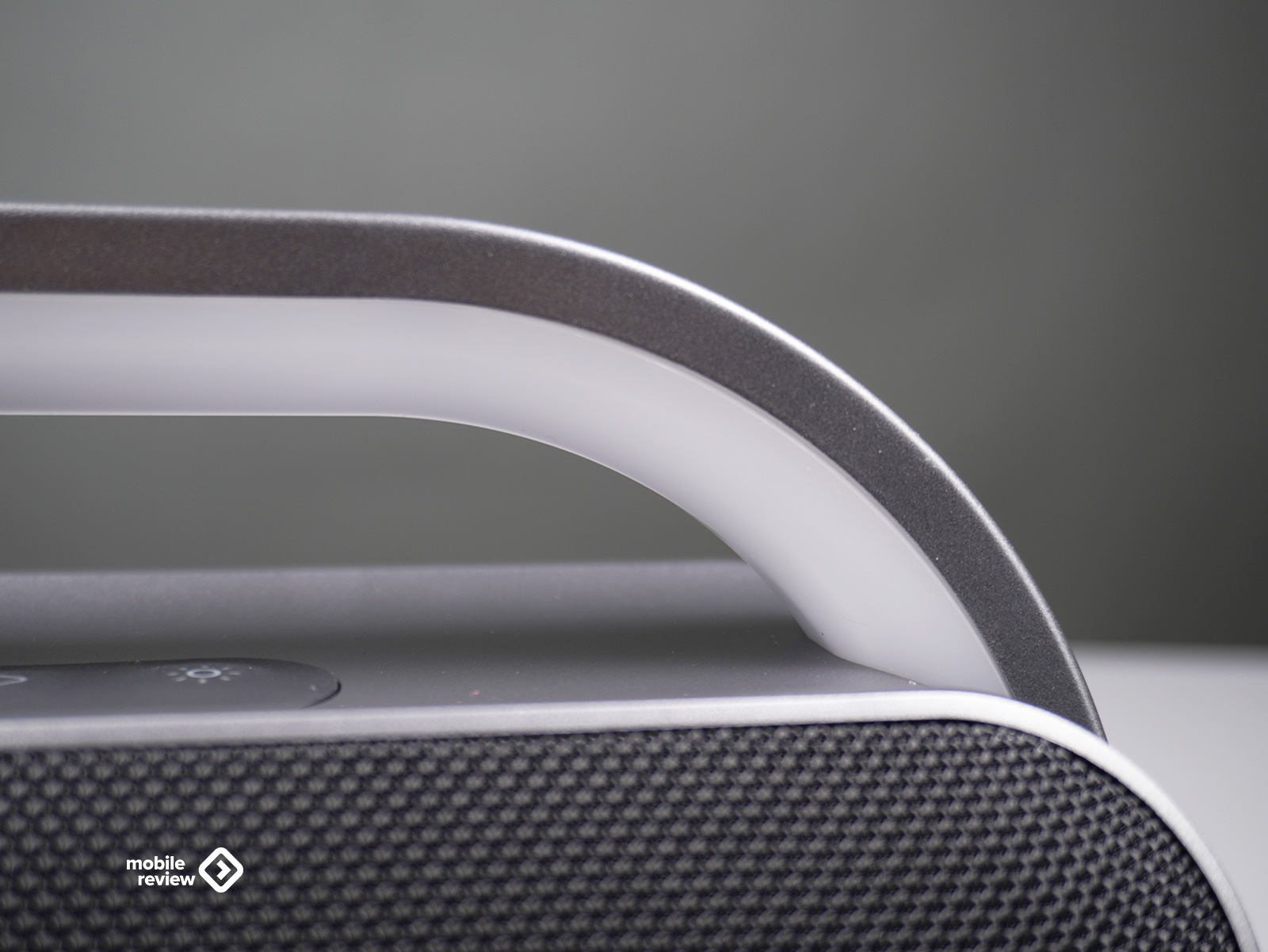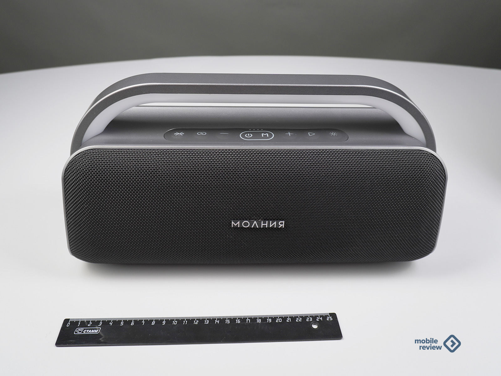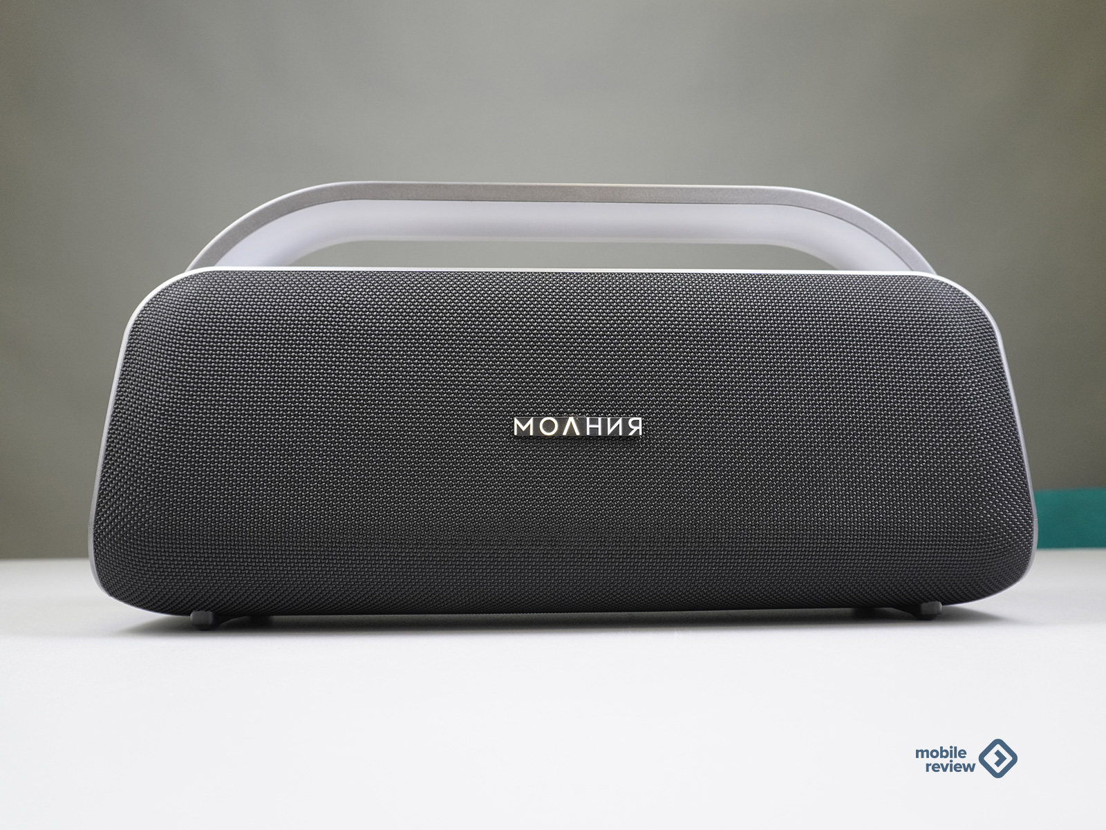 А вот «Молния Кварк», наоборот, имеет большую полупрозрачную полосу в нижней части рукояти переноски, которая отражается в самой колонке. Так что света получается заметно больше. Верх колонки буквально светится при включении.