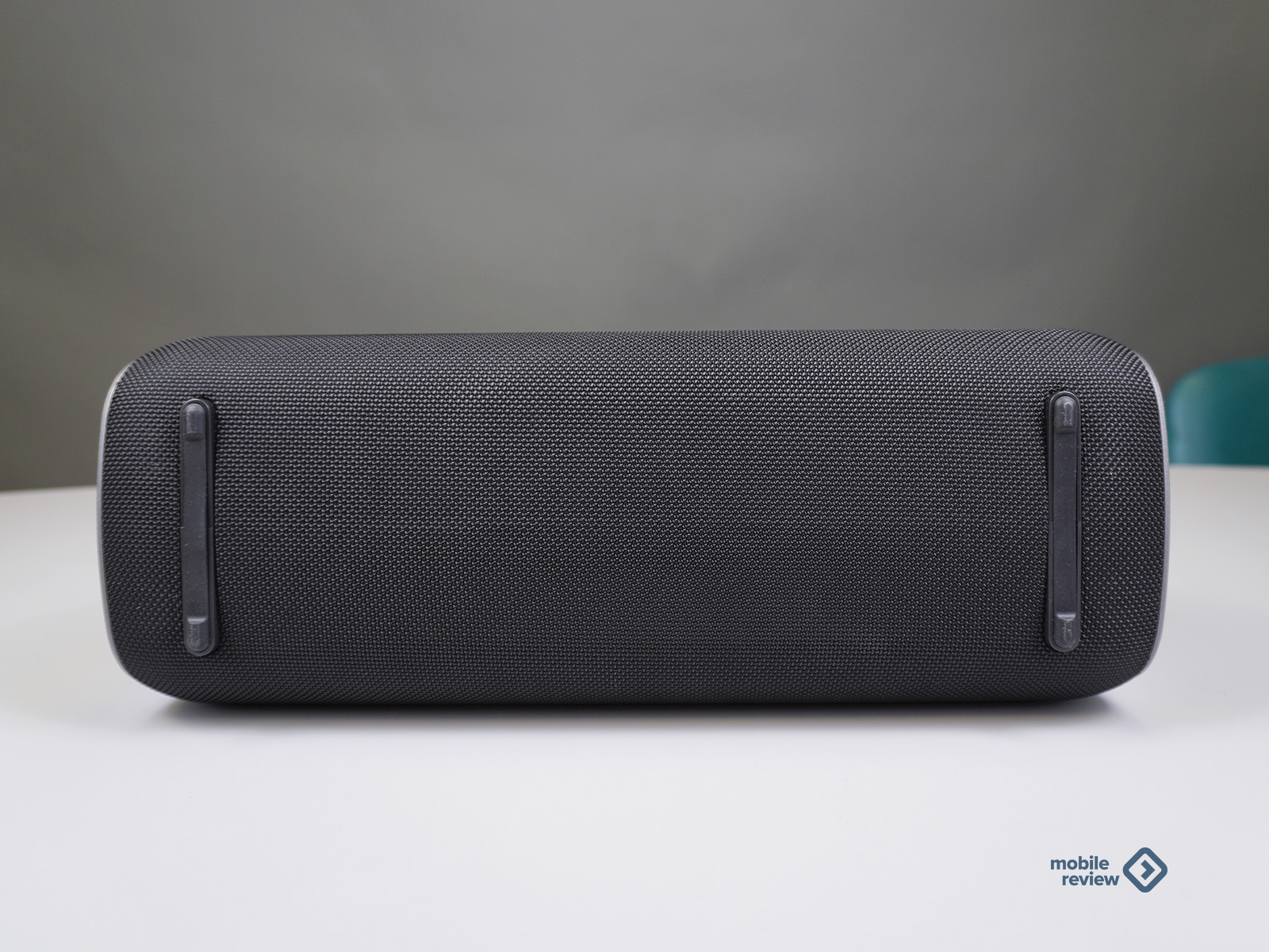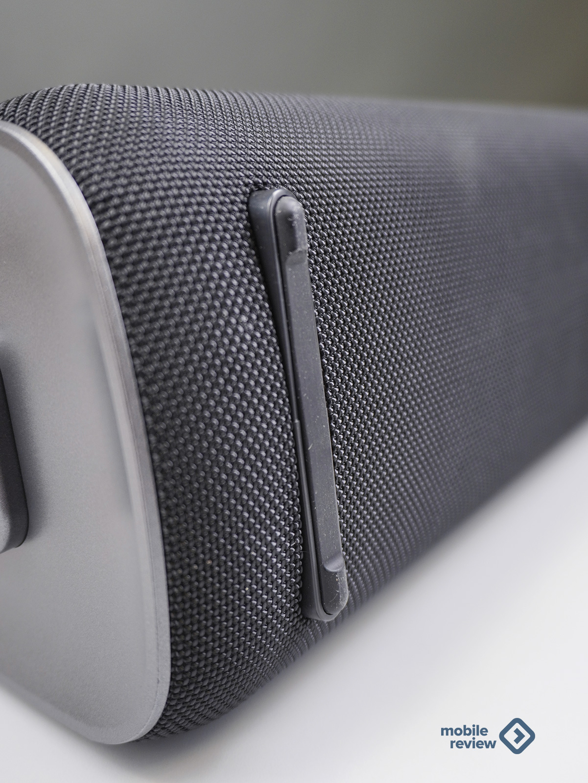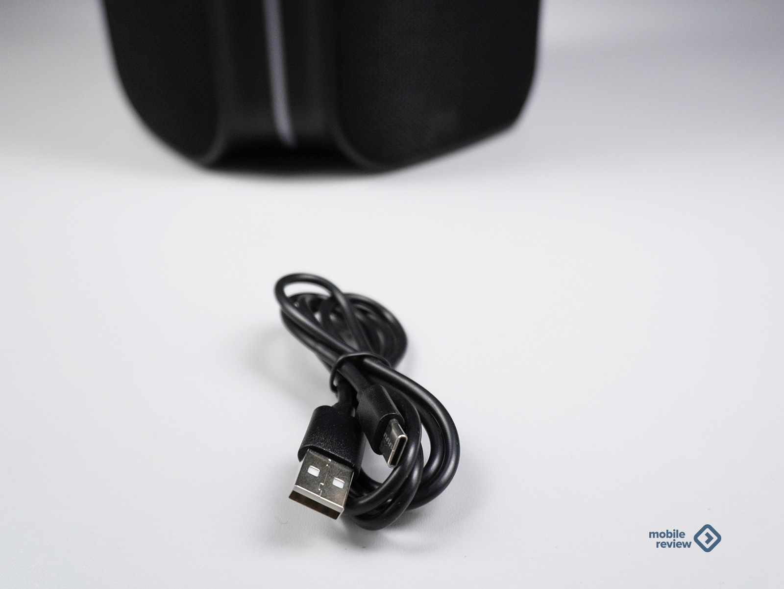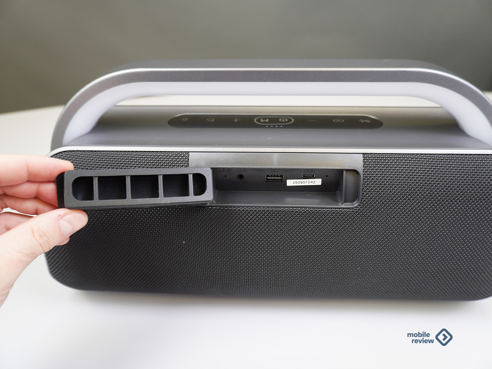 Единственное, что хотелось бы отметить, так это нюанс с подключениями в положении стоя. Доступ к портам выходит отличный, но как только речь заходит о том, чтобы заряжать устройтсво от USB, всплывает нюанс. Не всякий кабель без проблем дотянется от розетки до порта, либо вам придется ставить колонку почти вплотную к стене. А эта идея не очень хороша. Дело в том, что, несмотря на то, что нигде в описании и характеристиках не сказано о наличии пассивных излучателей, они имеются – на стороне, обратной той, где расположены активные динамики (на которой логотип). Соответственно, оказавшись слишком сильно прижатыми к вертикальной поверхности, они начнут работать некорректно, а если вы еще и включите функцию усиления низких частот и выкрутите громкость, музыкальная картина будет безнадежно испорчена. В общем, я бы советовал использовать не штатный кабель, а длиной хотя бы метра полтора. Благо обычный USB-C сейчас найти не проблема.