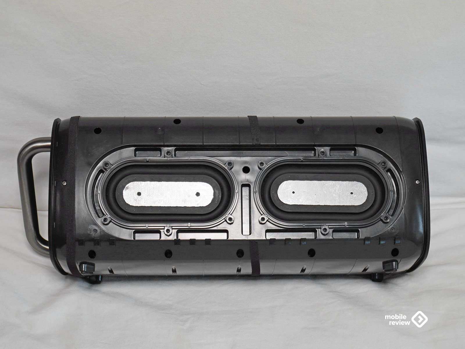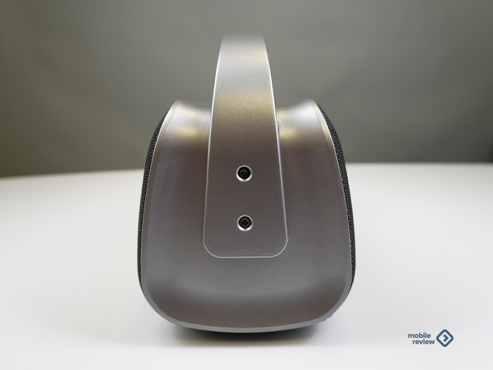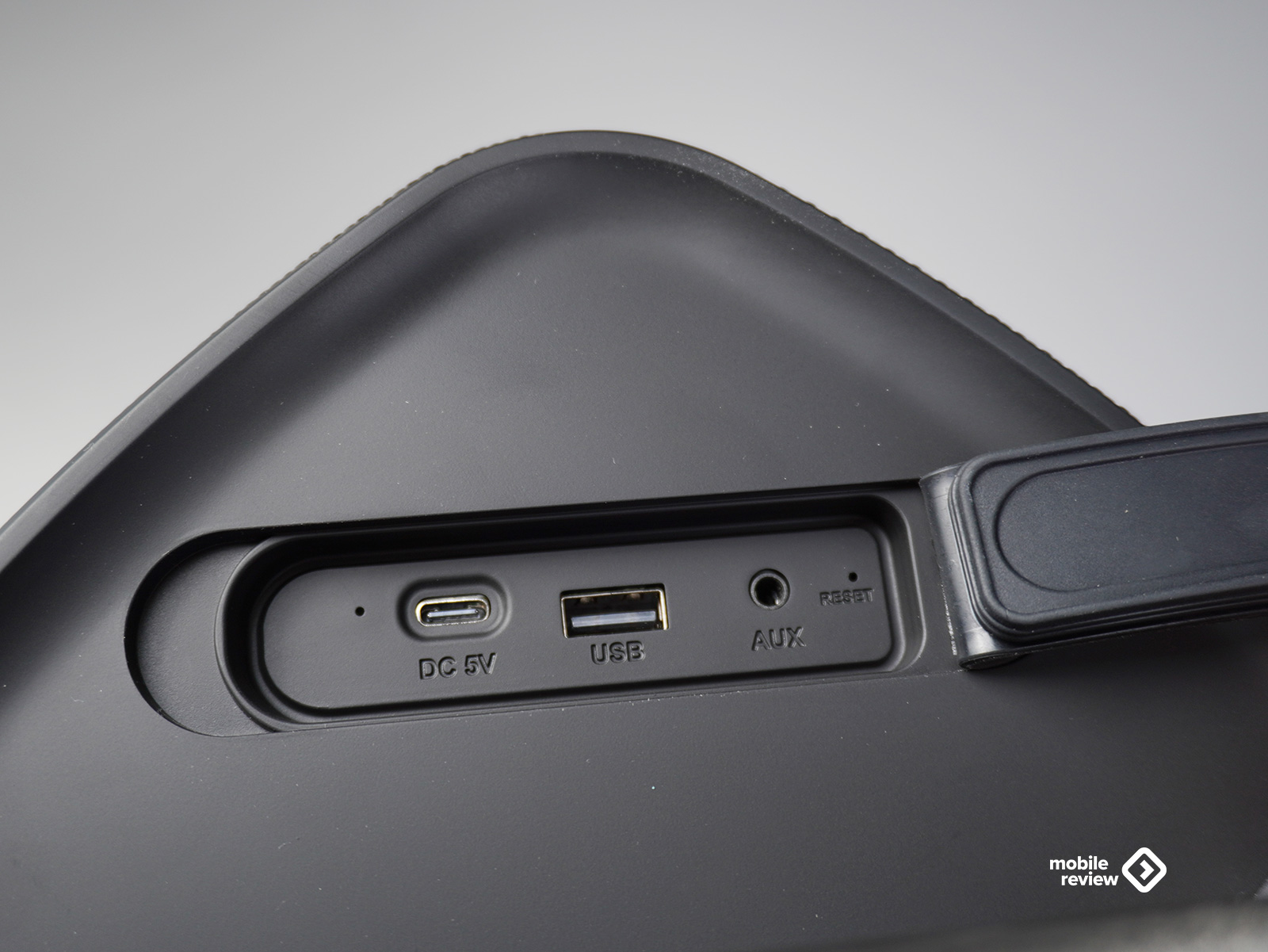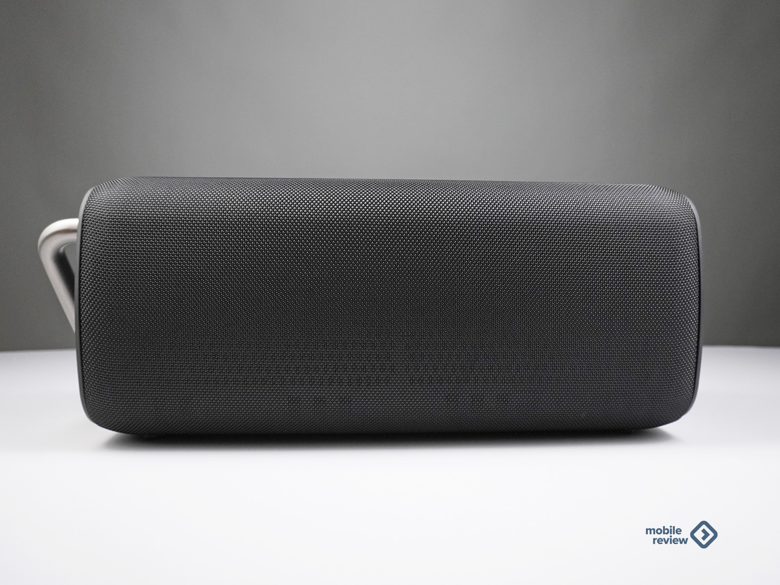 Единственное, что хотелось бы отметить, так это нюанс с подключениями в положении стоя. Доступ к портам выходит отличный, но как только речь заходит о том, чтобы заряжать устройтсво от USB, всплывает нюанс. Не всякий кабель без проблем дотянется от розетки до порта, либо вам придется ставить колонку почти вплотную к стене. А эта идея не очень хороша. Дело в том, что, несмотря на то, что нигде в описании и характеристиках не сказано о наличии пассивных излучателей, они имеются – на стороне, обратной той, где расположены активные динамики (на которой логотип). Соответственно, оказавшись слишком сильно прижатыми к вертикальной поверхности, они начнут работать некорректно, а если вы еще и включите функцию усиления низких частот и выкрутите громкость, музыкальная картина будет безнадежно испорчена. В общем, я бы советовал использовать не штатный кабель, а длиной хотя бы метра полтора. Благо обычный USB-C сейчас найти не проблема.