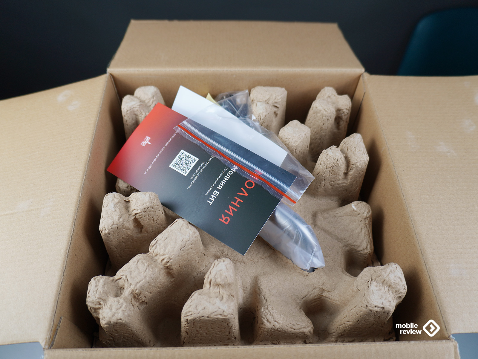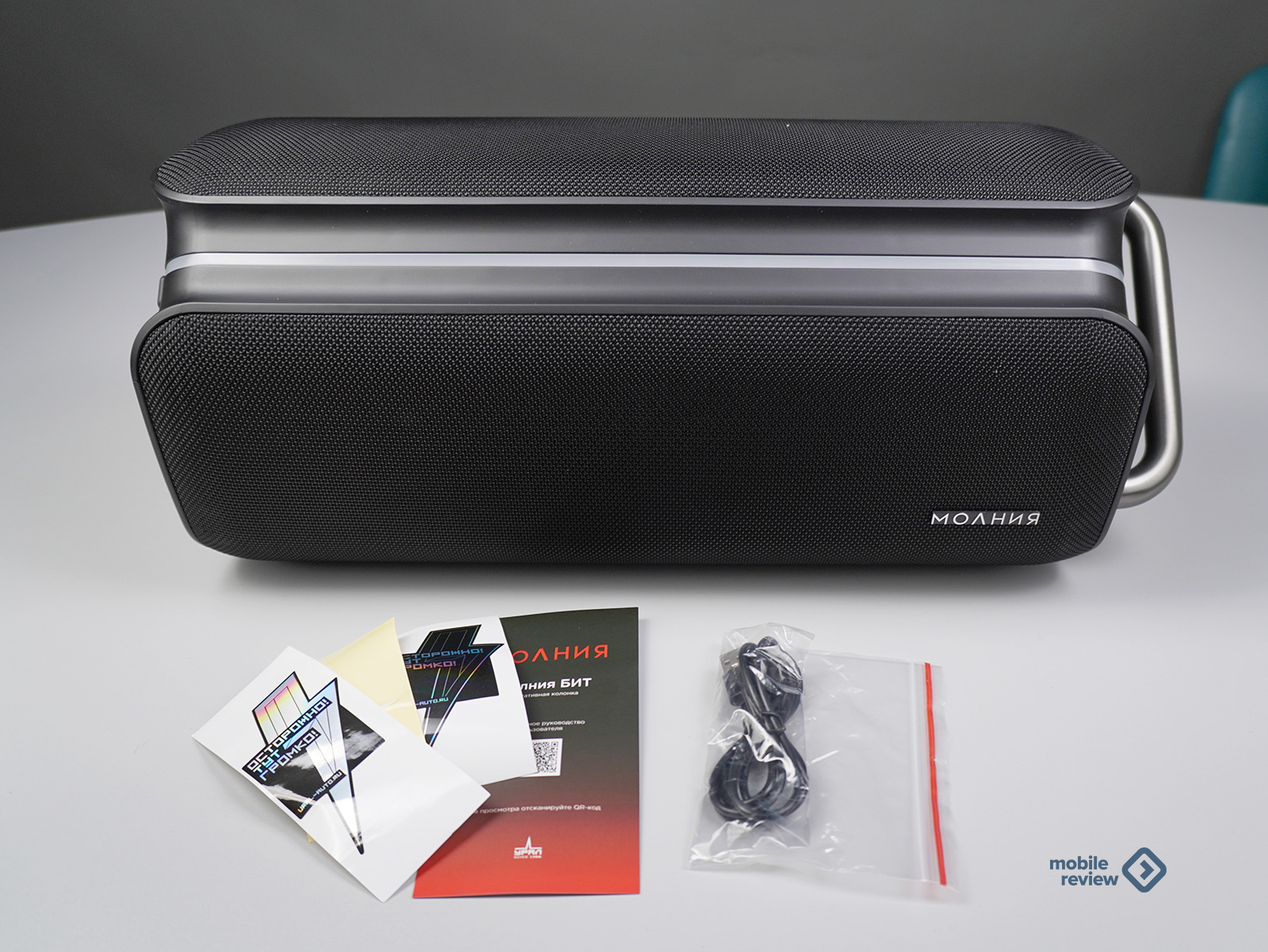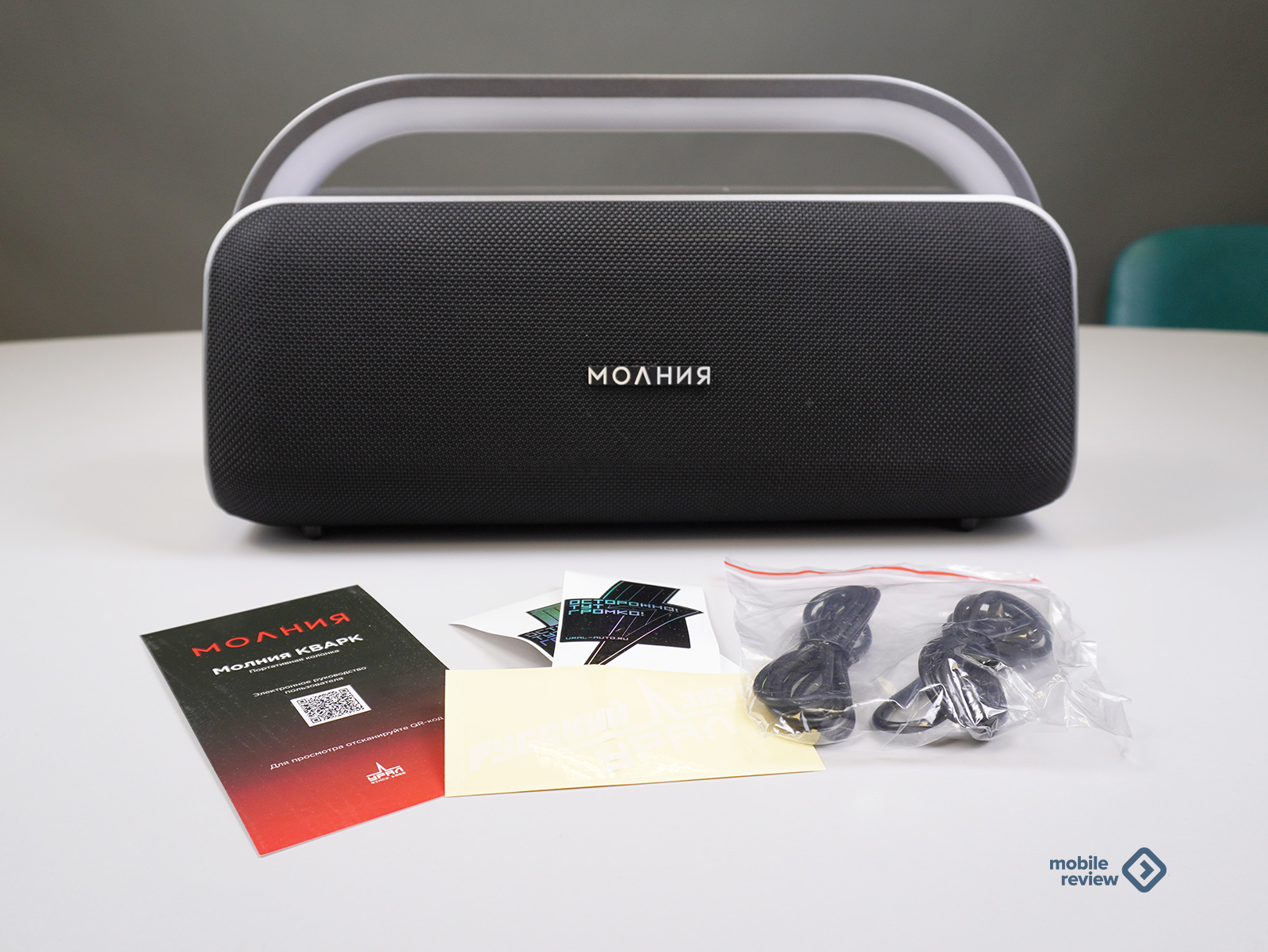 Упакованы колонки, можно сказать, идентично. Черная коробка с хорошей полиграфией и списком основных характеристик на боку. Внутри экологичный переработанный картон, какой-то такой же экологичный пакет, в который помещены сама колонка и гарантийный талон в виде картонки, на которой есть QR-код для скачивания инструкции. Единственное различие – в пакетике с проводами. К «Молнии Кварк» положили не только метровый кабель USB-A/USB-C, но и AUX-кабель длиной 1,2 метра. «Молния Бит» почему-то довольствуется только USB-кабелем. И еще момент, в силу размеров колонки метровый кабель питания для «Бита» выглядит минимально необходимым, иначе уже были бы вопросы, как его заряжать в вертикальном положении.