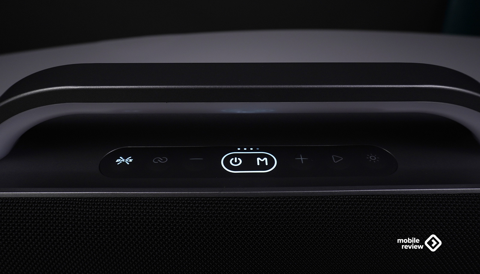 Также на панели управления есть индикатор заряда. Это четыре светодиода по центру над кнопками. Нетрудно догадаться, что шаг заряда должен быть 25%. Этого, в целом, достаточно для понимания оставшегося заряда, но надо учитывать, что 50% заряда не означают, что на них колонка проработает столько же, сколько и на первых 50%. Хотя бы по причине того, что на 5% произойдет отключение, чтобы предотвратить глубокий разряд аккумулятора.