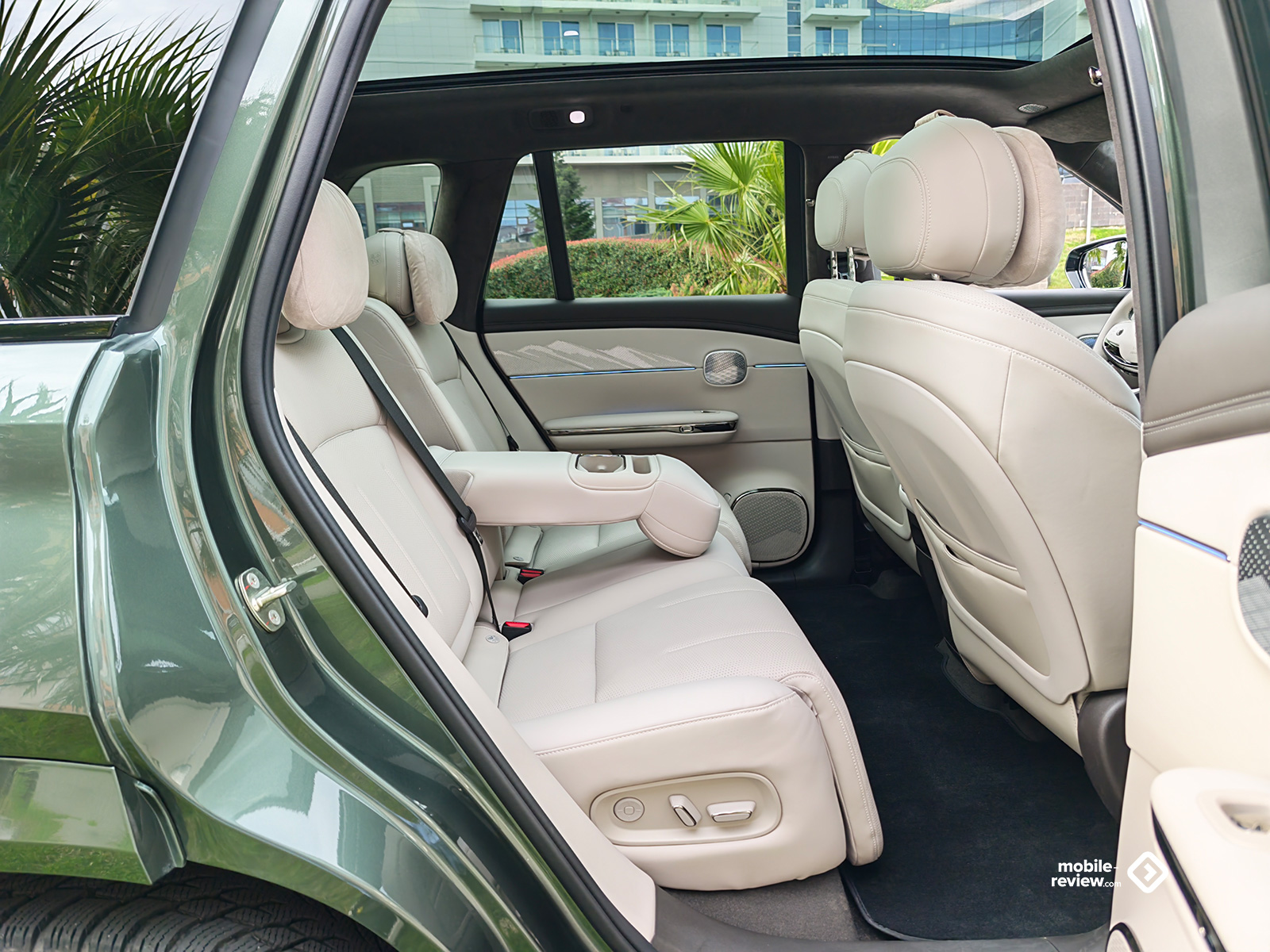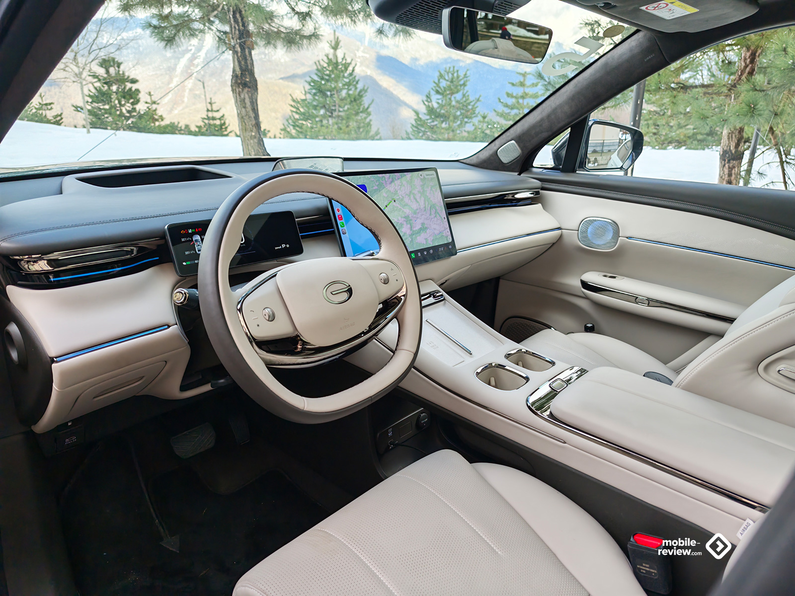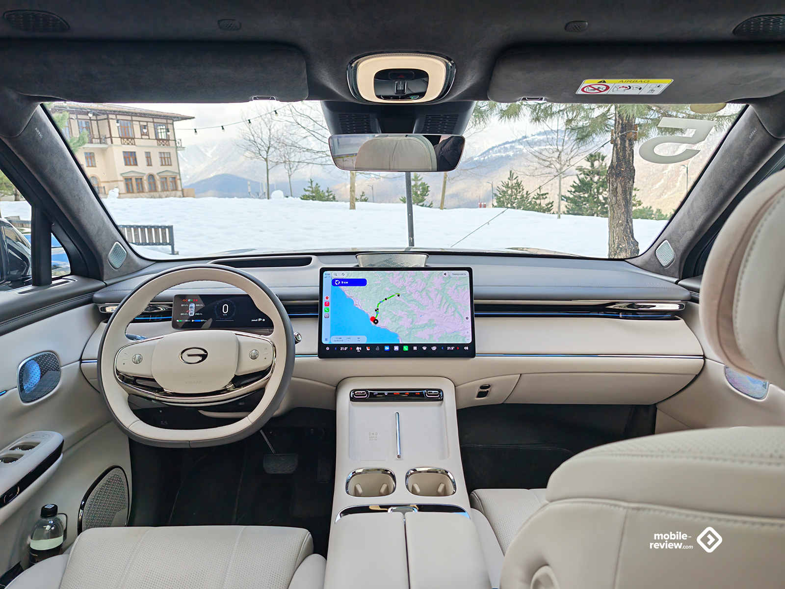 Посадка в автомобиль что спереди, что сзади свободная, а все двери оснащены доводчиками. Интерьер GAC S7 современный – с парящими подлокотниками, многослойной передней панелью, на которой отдельными элементами установлены дисплеи, и широким центральным тоннелем, где разместили площадку под два смартфона, правая ещё и с 50 Вт беспроводной зарядкой. Хорошо сюда вписываются и объемные, а главное, удобные кресла с мягкими подушечками на подголовниках. Стойки и потолок обшиты алькантарой, а если убрать автоматическую шторку с помощью сенсора, не самого удобного элемента управления, то над головой откроется просто бесконечная панорамная крыша. Интересно, что последняя начинается где-то от макушек водителя и переднего пассажира и для них просто добавляет больше света, но вот для пассажиров сзади она начинается за головами и уходит куда-то далеко вперед, открывая просто прекрасные виды.