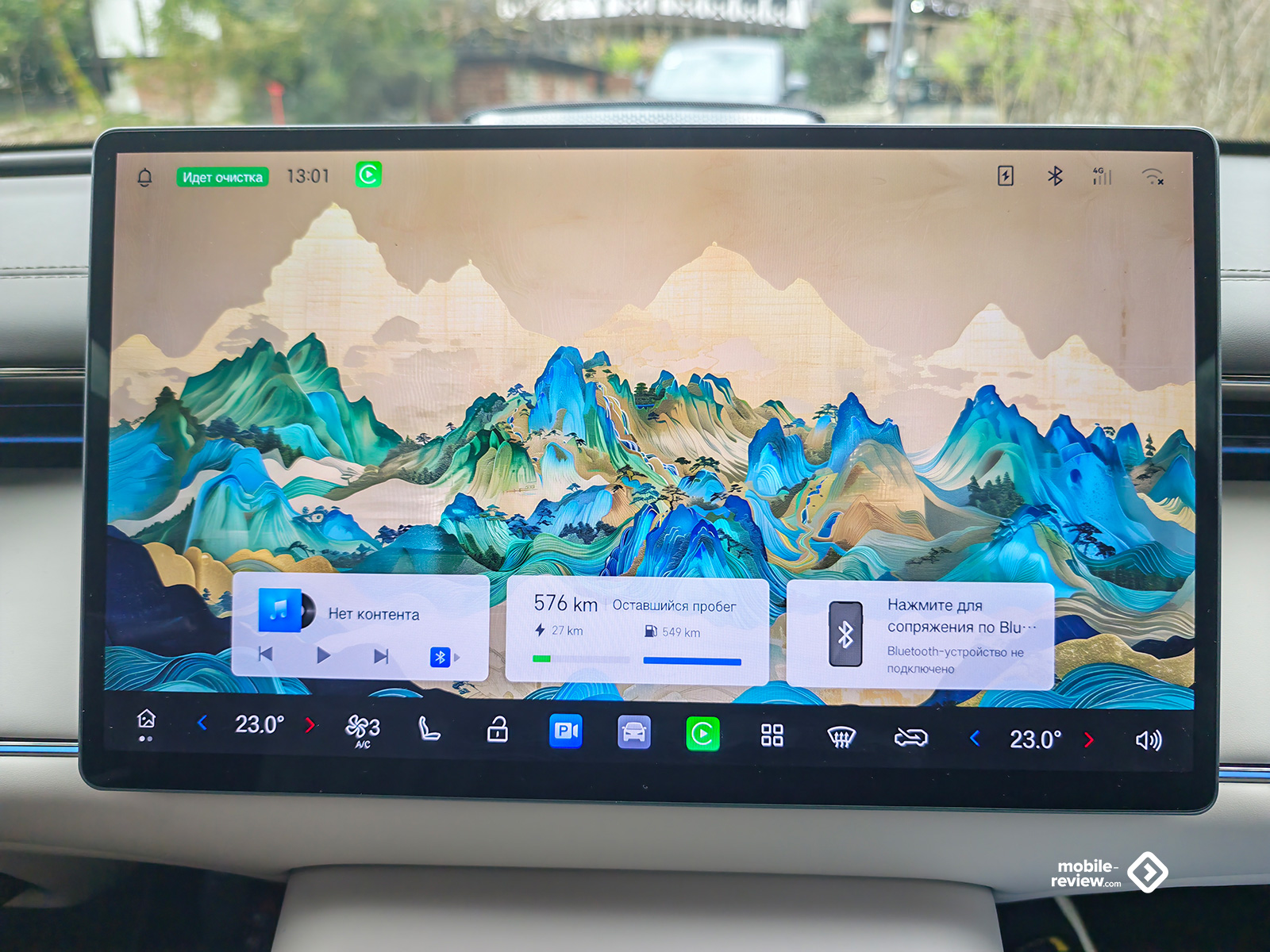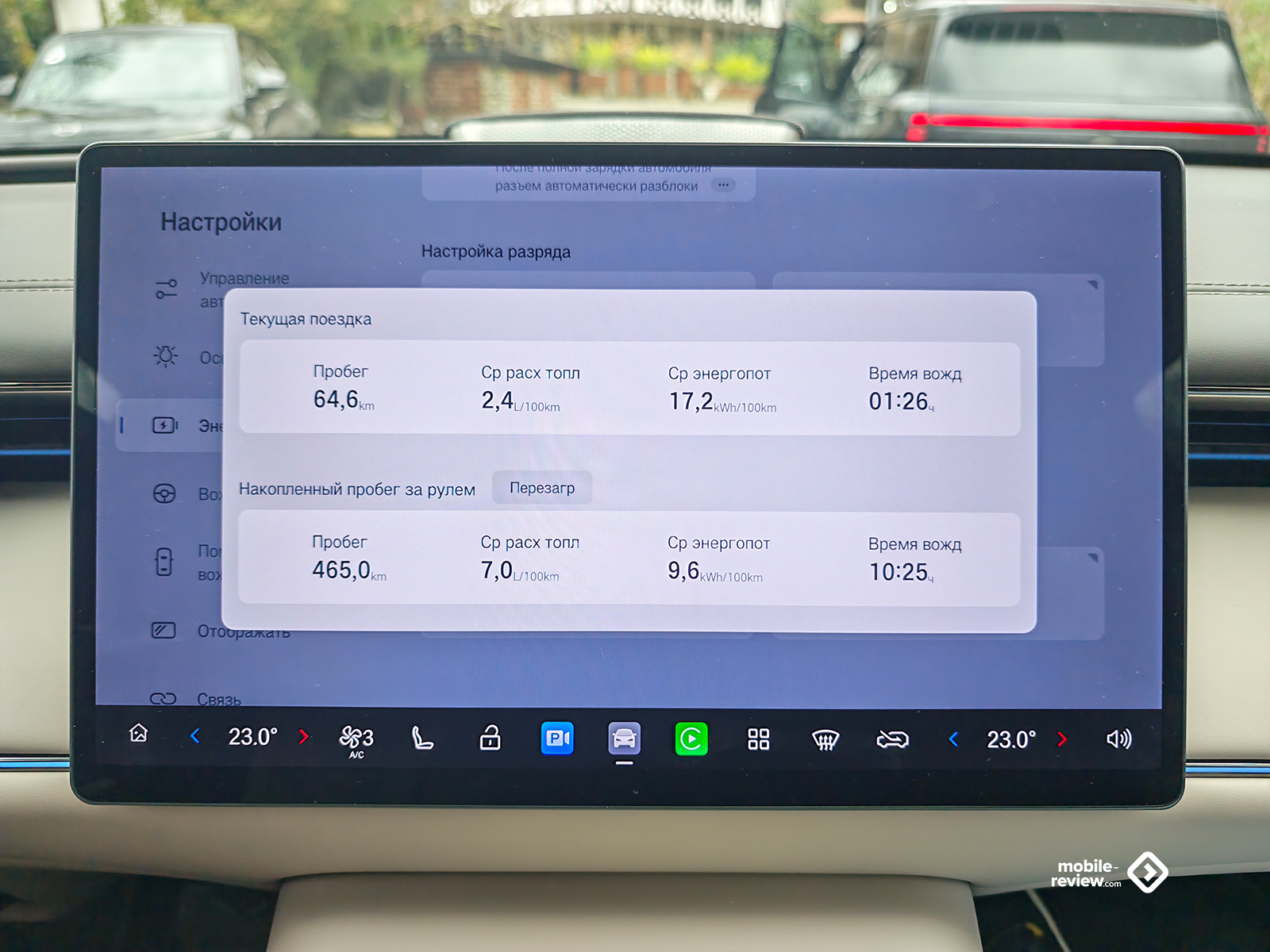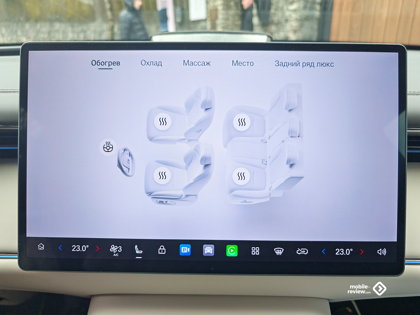 Перед водителем установлена небольшая 8.9-дюймовая цифровая приборная панель, на которую выводится вся необходимая информация, а перед глазами просто гигантский 27-дюймовый проекционный дисплей. Последний полностью подменяет приборку, так как на нем отображается масса информации, причем в крупном масштабе, наиболее удобном для восприятия. По центру же, следуя трендам, расположился 15.6-дюймовый сенсорный дисплей медиасистемы. Из странностей отмечу, что если приборная панель имеет только темную тему отображения, то мультимедиа-экран, наоборот, только светлую. Благодаря хорошо работающему датчику освещения в салоне, центральный дисплей быстро сбрасывает яркость, не ослепляя вас, даже когда вы въезжаете в тоннель, но все же есть резонанс между ним и приборкой, да и, думаю, многие предпочли бы везде иметь возможность смены тем.