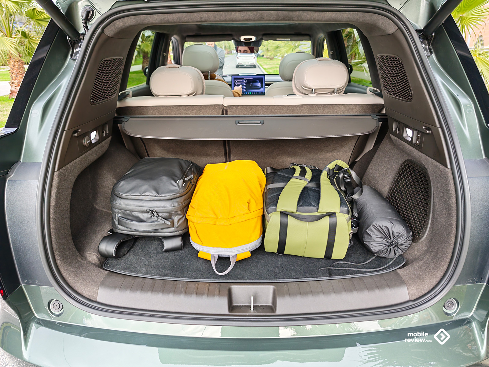 При просторном салоне и втором ряду, где даже я с ростом 187 см свободно усаживаюсь сам за собой, в автомобиле остается и весьма приличный багажник на 720 литров, который можно увеличить до 2050 литров, если сложить спинки заднего дивана. Пол в багажнике ровный, по краям стоят две яркие светодиодные лампы, а в базе идет мягкая съёмная шторка. Единственное, здесь не нашлось места под запаску, производитель предлагает в комплекте только компрессор. Дверь багажника с электроприводом и возможностью бесконтактного открытия.