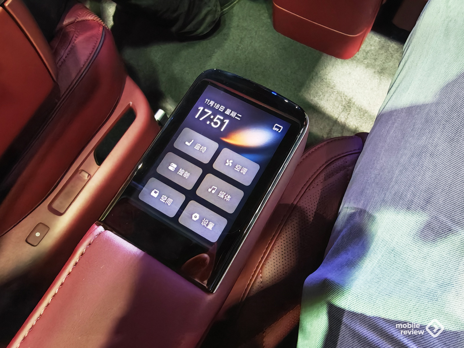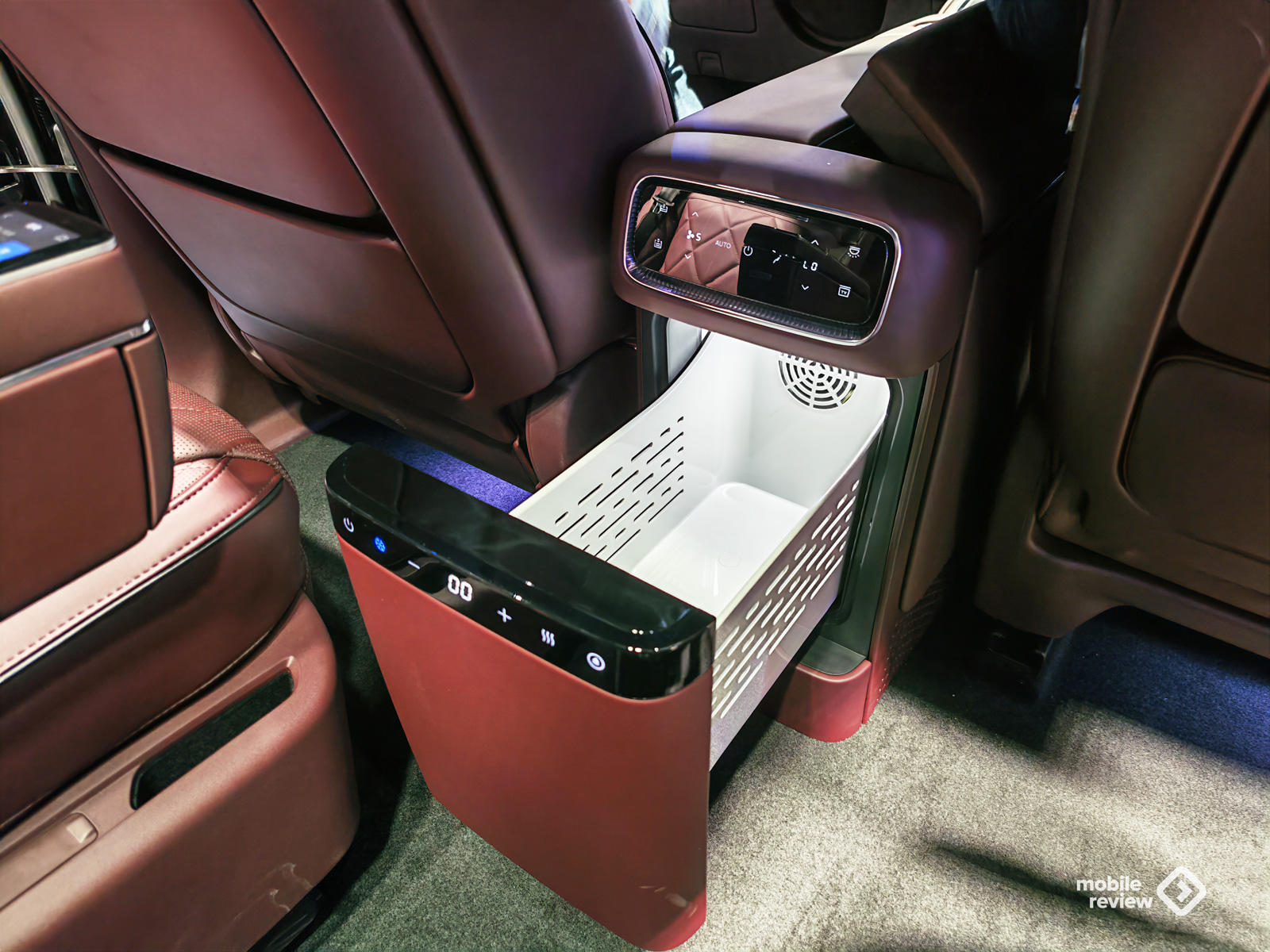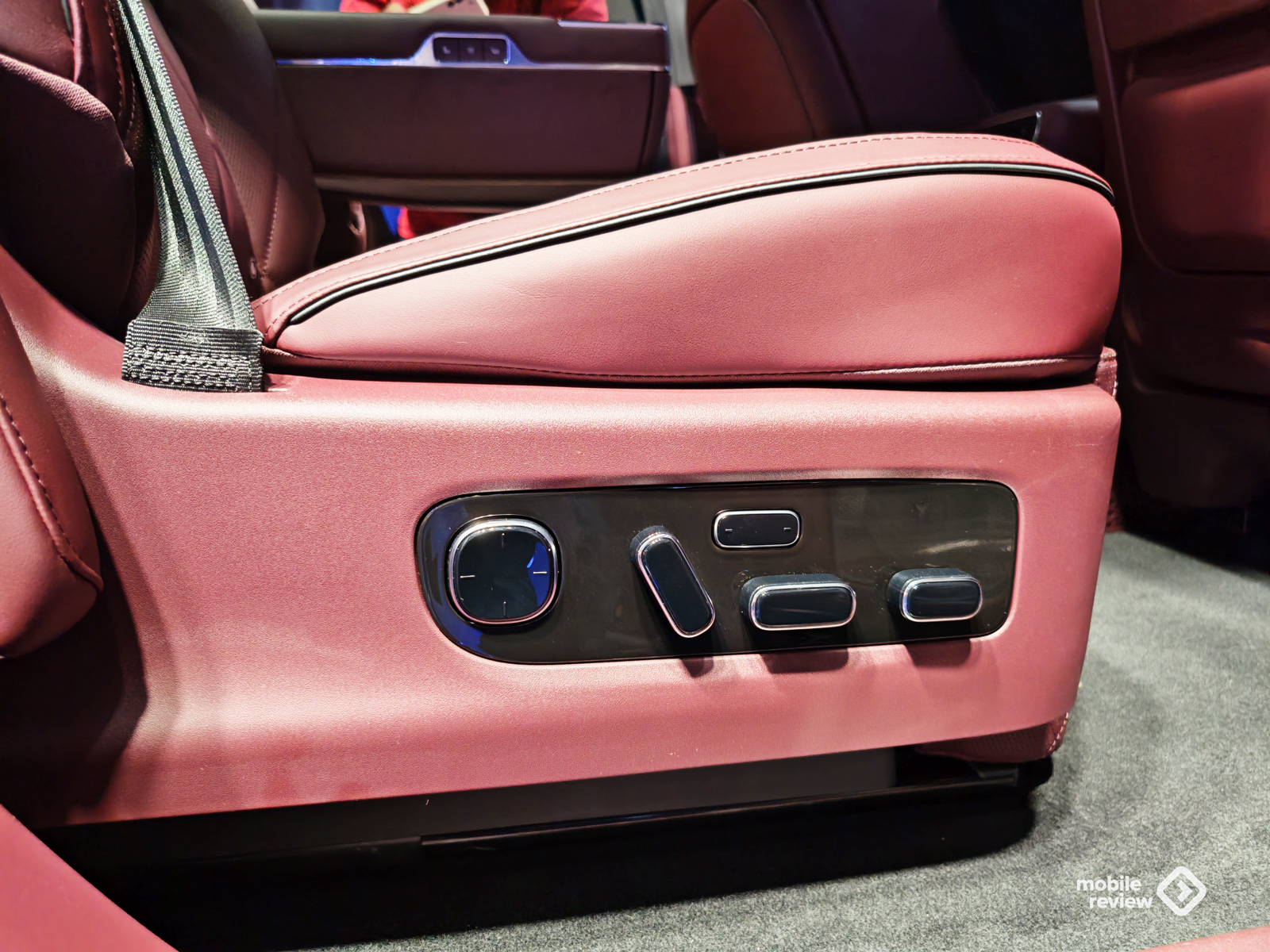Крупный кроссовер идет исключительно в шестиместном исполнении, в компоновке 2+2+2. На втором ряду нас встречают отличные капитанские кресла, которые благодаря 66 датчикам и ИИ могут автоматически подстраиваться под пассажира, обеспечивая наиболее комфортную посадку. Если же вы хотите сами отрегулировать кресло, то нет ничего проще, так как здесь вам доступен полный пакет электрорегулировок, включая регулировку поясничного подпора и регулируемую оттоманку. Для пассажиров второго ряда в подлокотники интегрированы отдельные пульты управления, представляющие собой небольшие цветные сенсорные дисплеи. Через них вы не только можете управлять настройками, включать обогрев, вентиляцию или массаж, но также взаимодействовать с мультимедиа. Интересной особенностью Taishan является интеграция динамиков в подголовники четырех передних кресел, по два на каждый, что позволяет каждому пассажиру слушать собственную музыку. Всего же в салоне автомобиля установлено 32 динамика аудиосистемы суммарной мощностью 2300 Вт и 36-канальный усилитель. Кроме этого, пассажиры второго ряда могут открыть потолочный дисплей медиасистемы диагональю 21.4 дюйма и наслаждаться просмотром любимого кино или другого визуального контента. А также здесь имеется встроенный холодильник, с автоматически выезжающим боксом, доступ к которому водитель и передний пассажир могут получить, открыв центральный подлокотник.