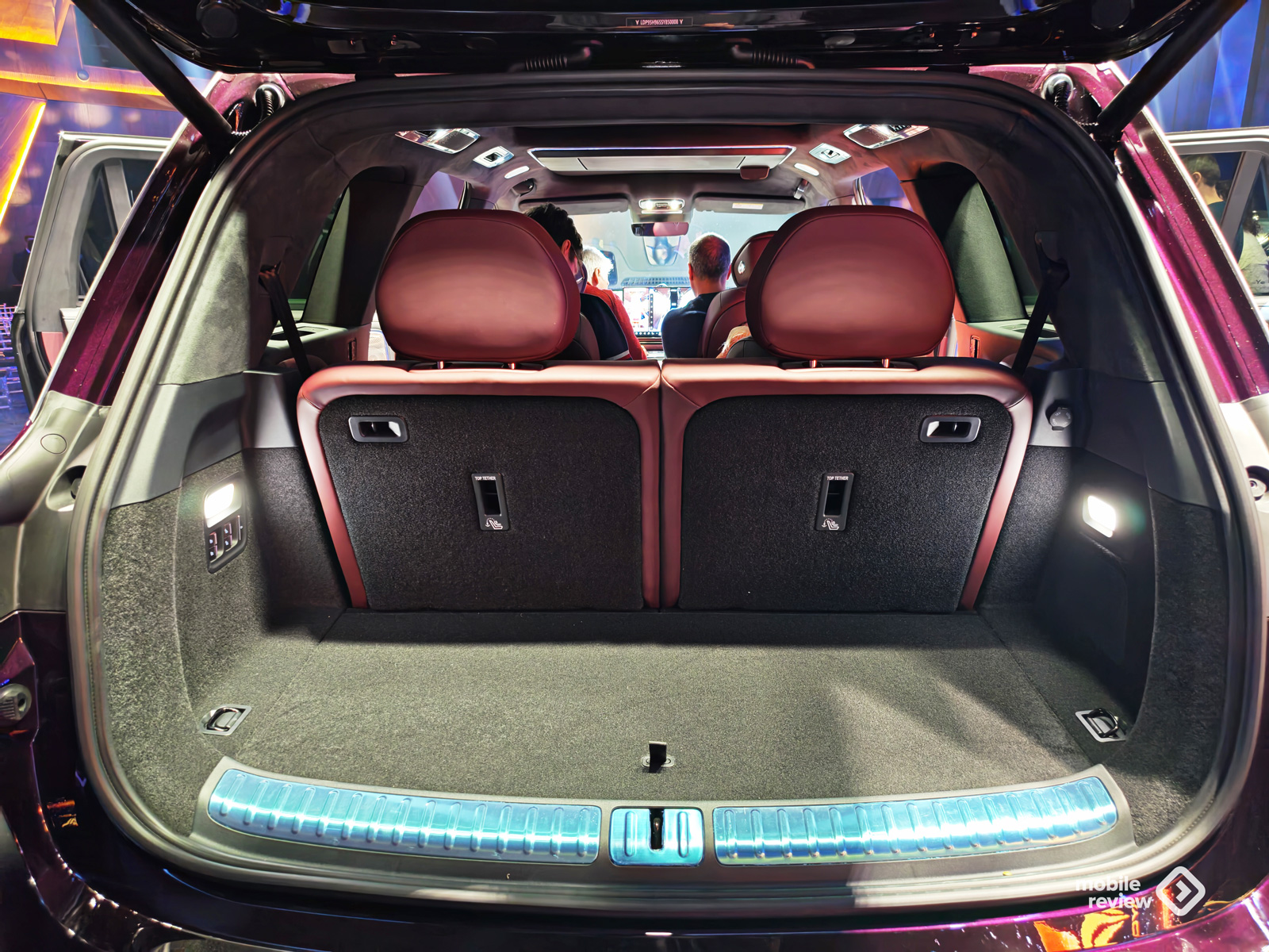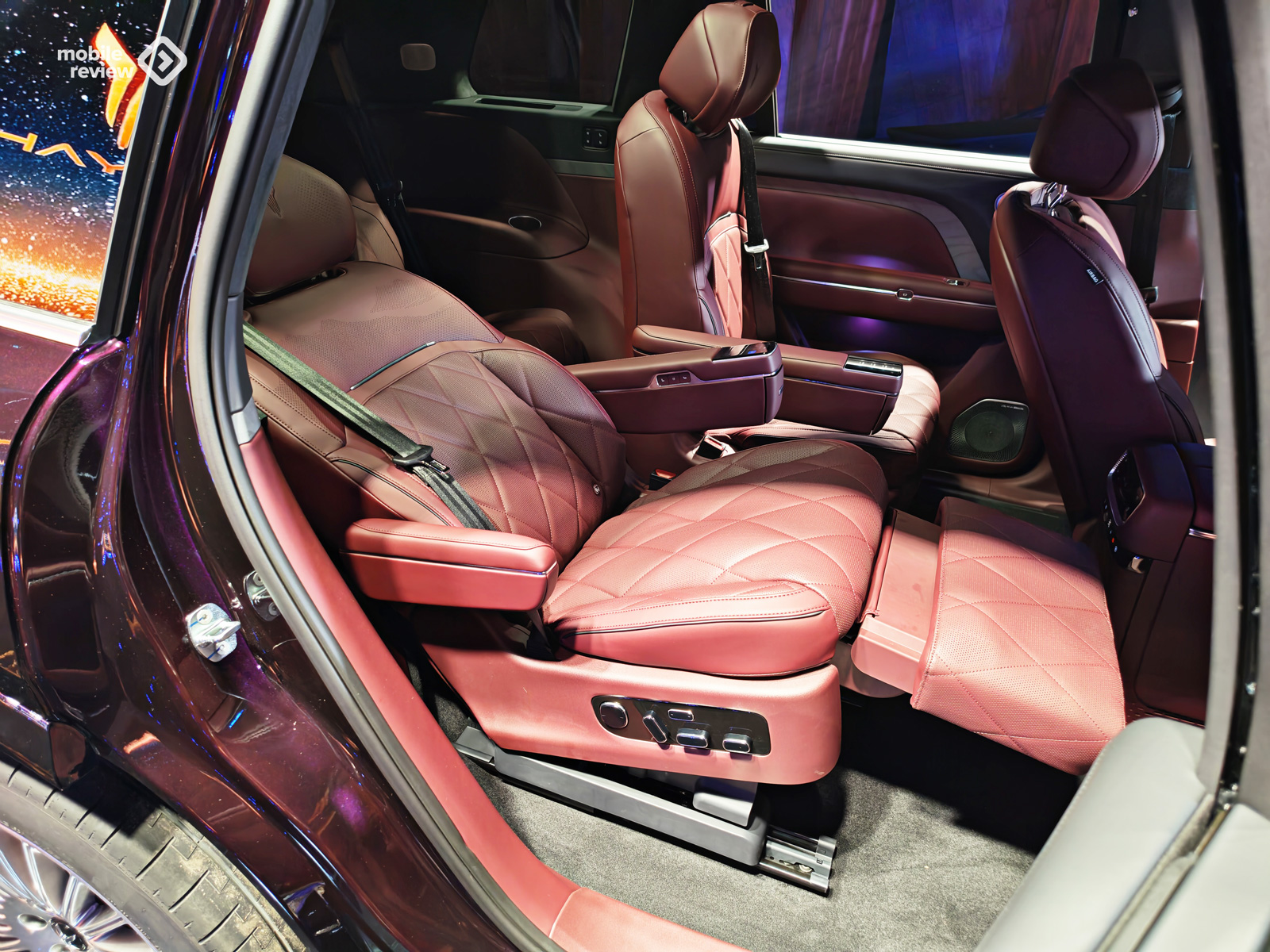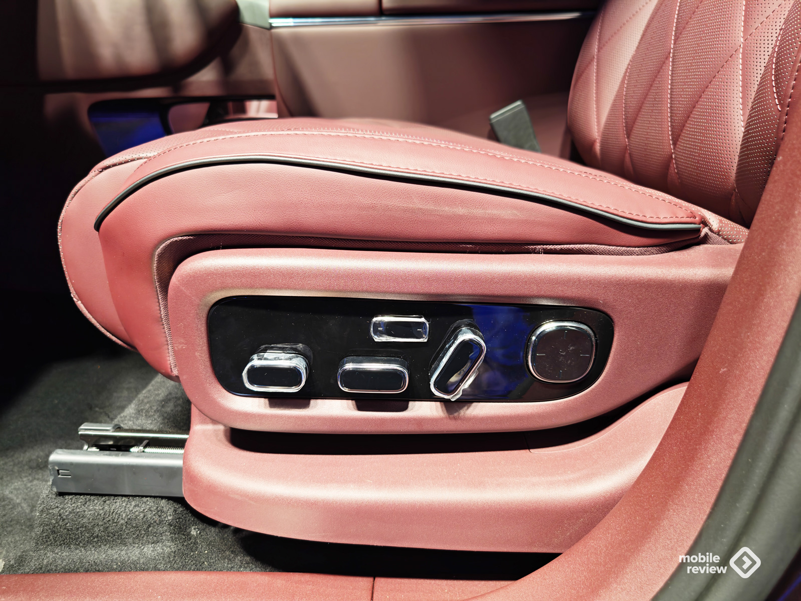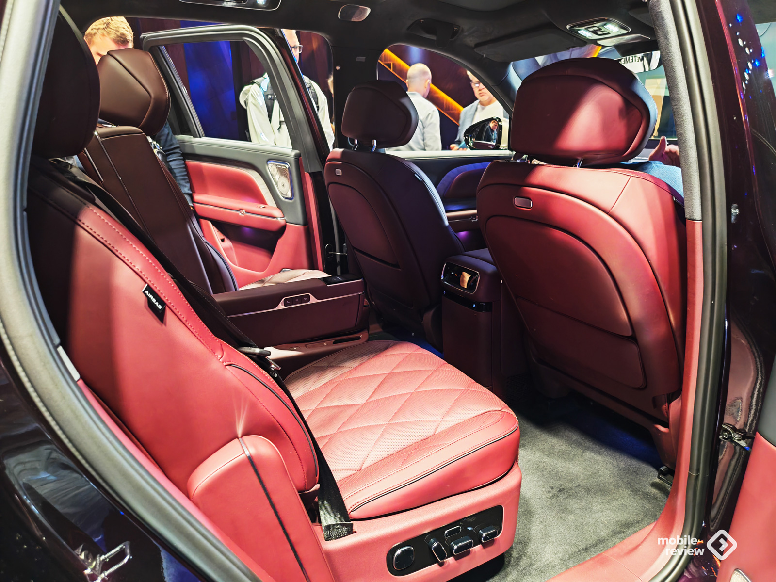 Крупный кроссовер идет исключительно в шестиместном исполнении, в компоновке 2+2+2. На втором ряду нас встречают отличные капитанские кресла, которые благодаря 66 датчикам и ИИ могут автоматически подстраиваться под пассажира, обеспечивая наиболее комфортную посадку. Если же вы хотите сами отрегулировать кресло, то нет ничего проще, так как здесь вам доступен полный пакет электрорегулировок, включая регулировку поясничного подпора и регулируемую оттоманку. Для пассажиров второго ряда в подлокотники интегрированы отдельные пульты управления, представляющие собой небольшие цветные сенсорные дисплеи. Через них вы не только можете управлять настройками, включать обогрев, вентиляцию или массаж, но также взаимодействовать с мультимедиа. Интересной особенностью Taishan является интеграция динамиков в подголовники четырех передних кресел, по два на каждый, что позволяет каждому пассажиру слушать собственную музыку. Всего же в салоне автомобиля установлено 32 динамика аудиосистемы суммарной мощностью 2300 Вт и 36-канальный усилитель. Кроме этого, пассажиры второго ряда могут открыть потолочный дисплей медиасистемы диагональю 21.4 дюйма и наслаждаться просмотром любимого кино или другого визуального контента. А также здесь имеется встроенный холодильник, с автоматически выезжающим боксом, доступ к которому водитель и передний пассажир могут получить, открыв центральный подлокотник.