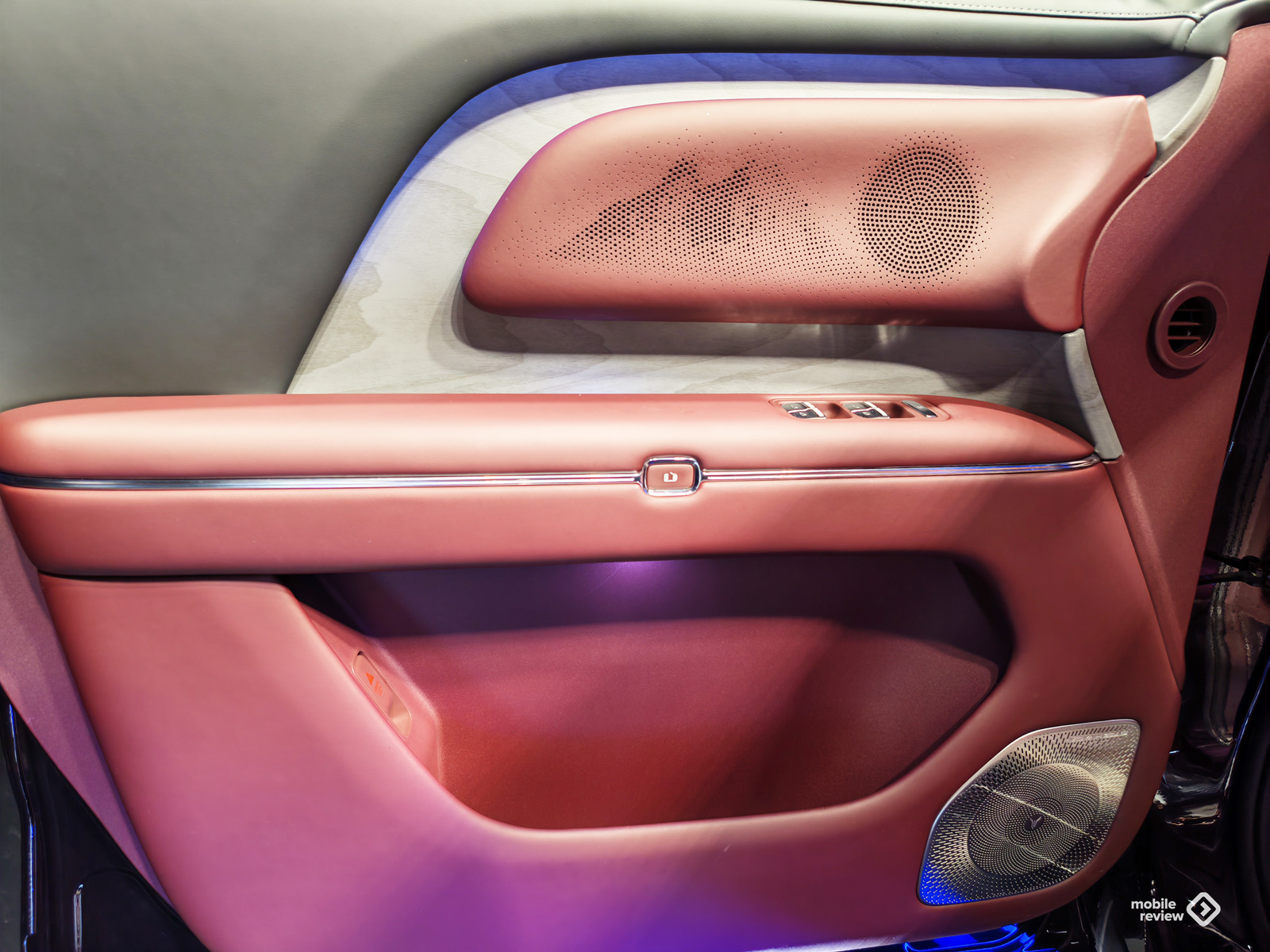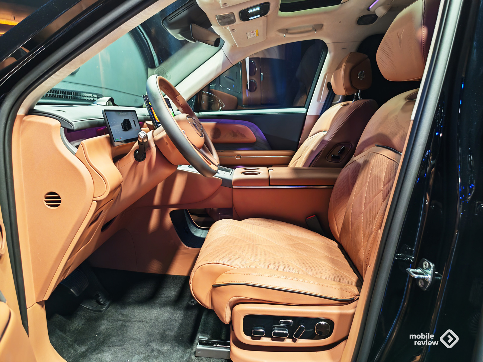 Для доступа в салон кроссовера вам достаточно лишь слегка потянуть ручку или нажать на кнопку, чтобы дверь автоматически открылась. На каждой из четырех дверей с внешней стороны располагается по два сенсора, которые распознают помеху и не откроются слишком широко, если что-то мешает. За рулем автомобиля довольно комфортно, кресла широкие, с правильным профилем и большим набором электрорегулировок. Цифровая приборная панель и дисплей медиасистемы здесь раздельные, по последней моде, а в Китае переднему пассажиру будет доступен ещё и съемный планшет, который будет синхронизироваться с автомобилем, а при отключении сможет работать автономно. По материалам все на очень хорошем уровне, практически везде нас встречает податливый пластик, детали, обтянутые тактильно приятной кожей, и аккуратные декоративные элементы.