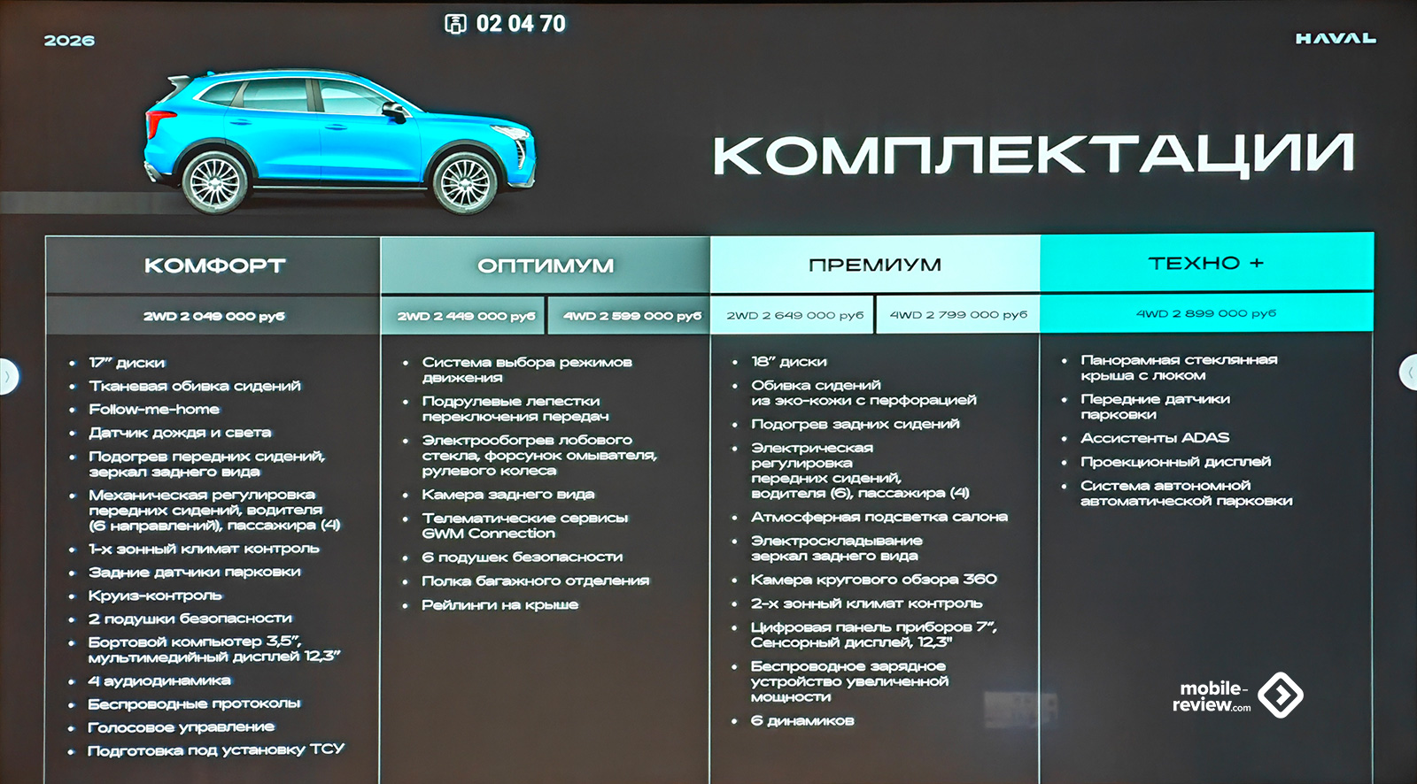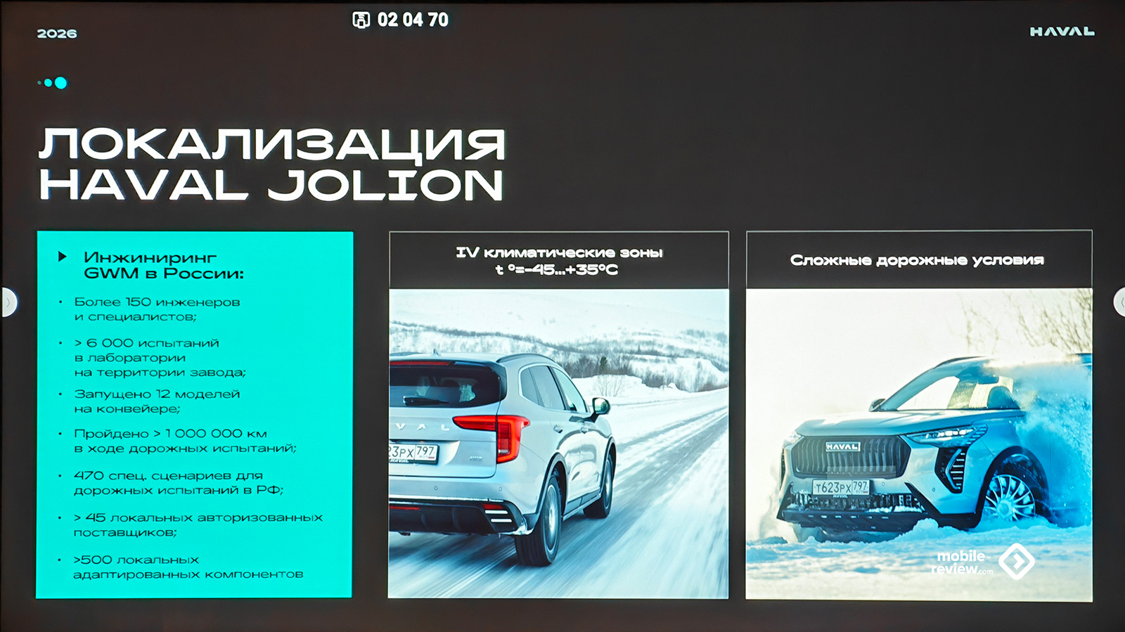 Как и прежде Haval Jolion адаптирован к нашим условиям эксплуатации. Кузов имеет антикоррозийную обработку, бачок омывателя увеличен до 4,5 литров, установлен аккумулятор увеличенную емкость, а также в автомобиле имеется полный зимний пакет. Кроме этого модель тестировали в суровых условиях российских регионов, а в собираемых у нас автомобилях используется более 500 локализованных компонентов.