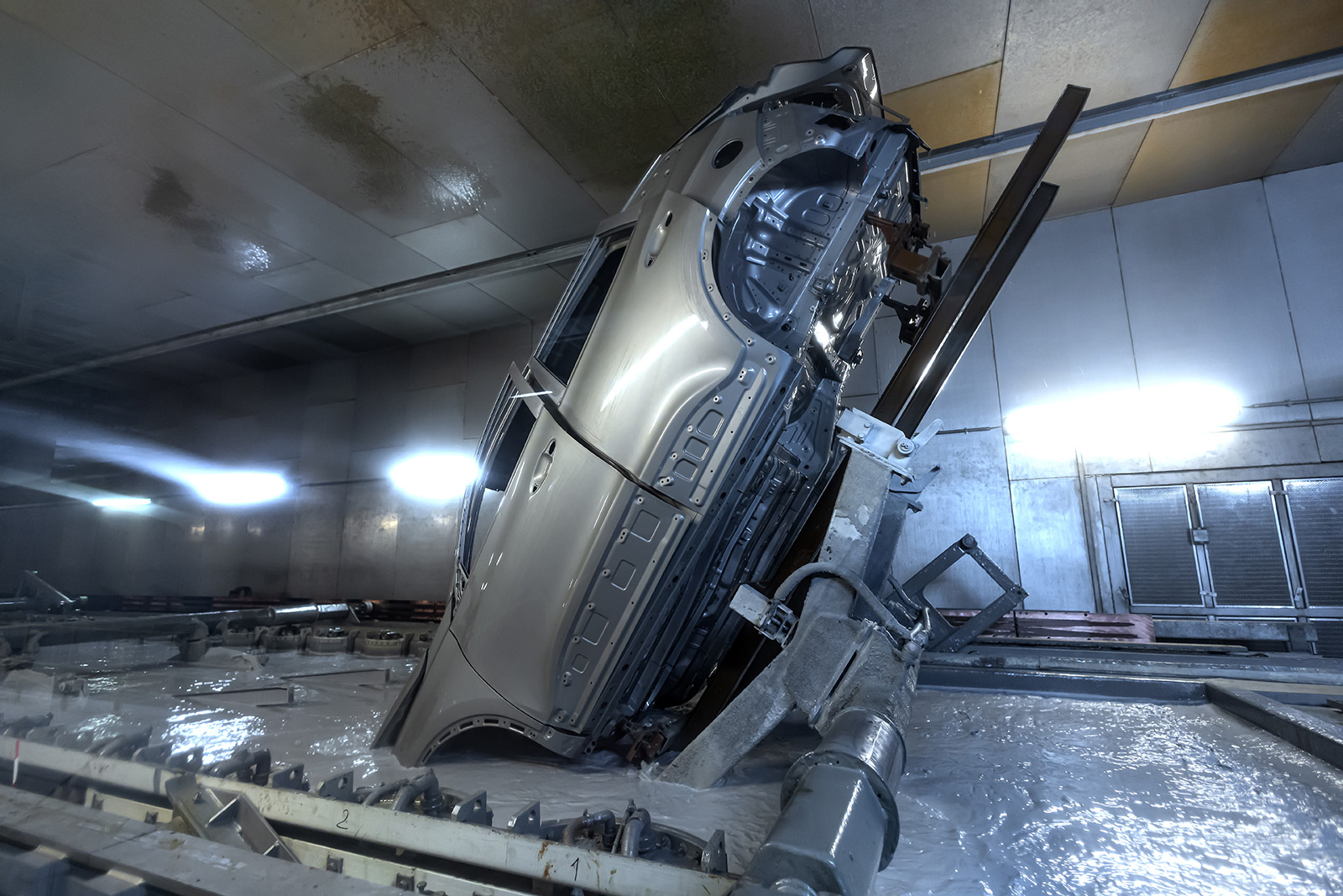 На первом этапе, в лакокрасочном цеху, кузов будущего автомобиля Tenet проходит линию предварительной обработки, включающую обезжиривание и фосфатирование методом полного погружения. Далее происходит нанесение катафорезного грунта. Интересно, что на предприятии применяется технология RoDip (Rotational Dip Coating), где в процессе обработки кузов вращается в ванне, а это позволяет катафорезному покрытию проникать во все скрытые и труднодоступные полости.