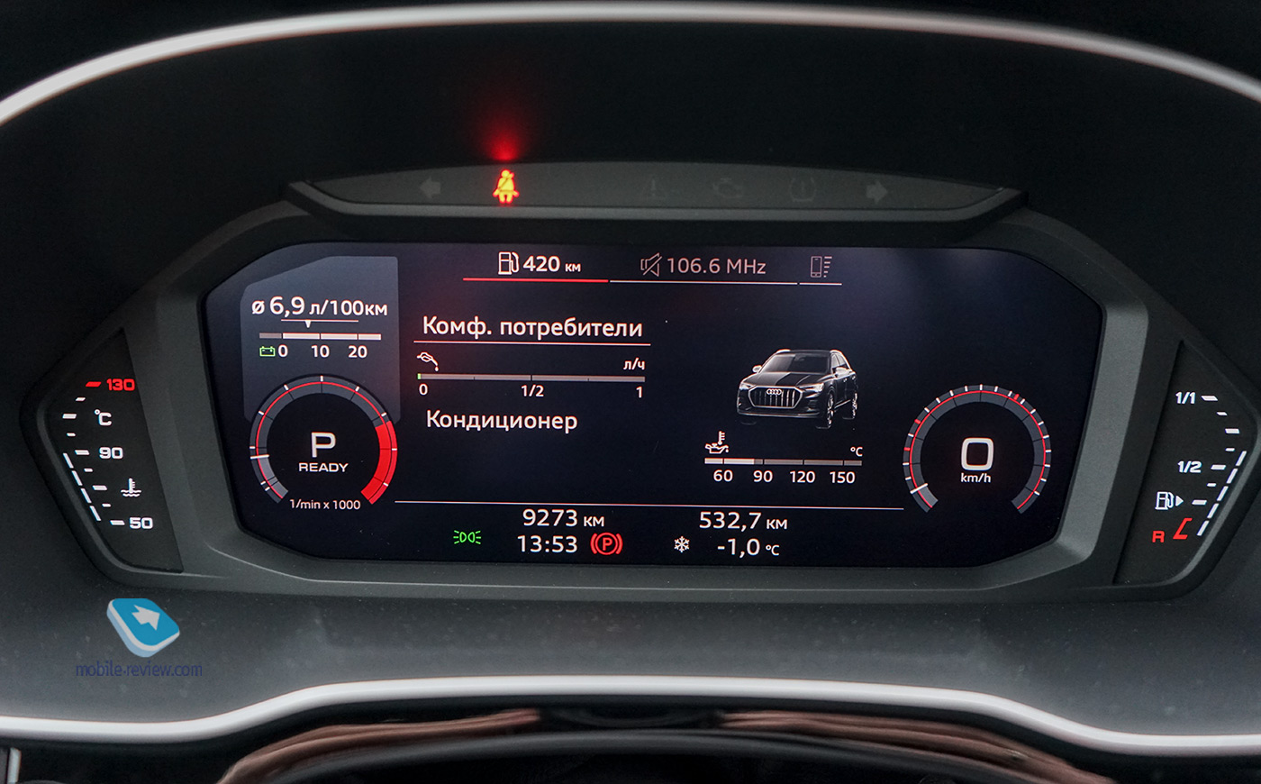 Новая медиасистема Audi перекочевала в Q3 из флагманских моделей, но по пути лишилась второго экрана, а также, что более печально, 8.8” (или 10.1” для версии MMI Navigation plus) сенсорный дисплей остался без обратной связи. Если мы берем простую версию автомобиля, как была у нас на тесте, то здесь медиасистема MMI Radio plus имеет только ряд стандартных функций, которые доступны сейчас во всех современных автомобилях. Единственное, огорчает, что в базе нет поддержки Android Auto и Apple CarPlay, они появляются только в MMI Navigation plus, в которой также идет еще и штатная навигация. Виртуальная приборная панель Audi virtual cockpit с экраном 12.3” (базовая виртуальная панель приборов 10.25”) доступна за доплату 13 400 рублей, но раскрывается она, конечно, в связке с MMI Navigation plus, когда на нее можно вывести удобные карты, причем еще и растянуть их на весь экран. На виртуальной панели вам доступно три варианта оформления приборов, информация бортового компьютера, списки вызовов и музыка/радио. Управлять всеми данными предлагается с помощью роликов и кнопок на руле, то есть вам не надо даже отпускать руль для каких-то действий, что, конечно, удобно.