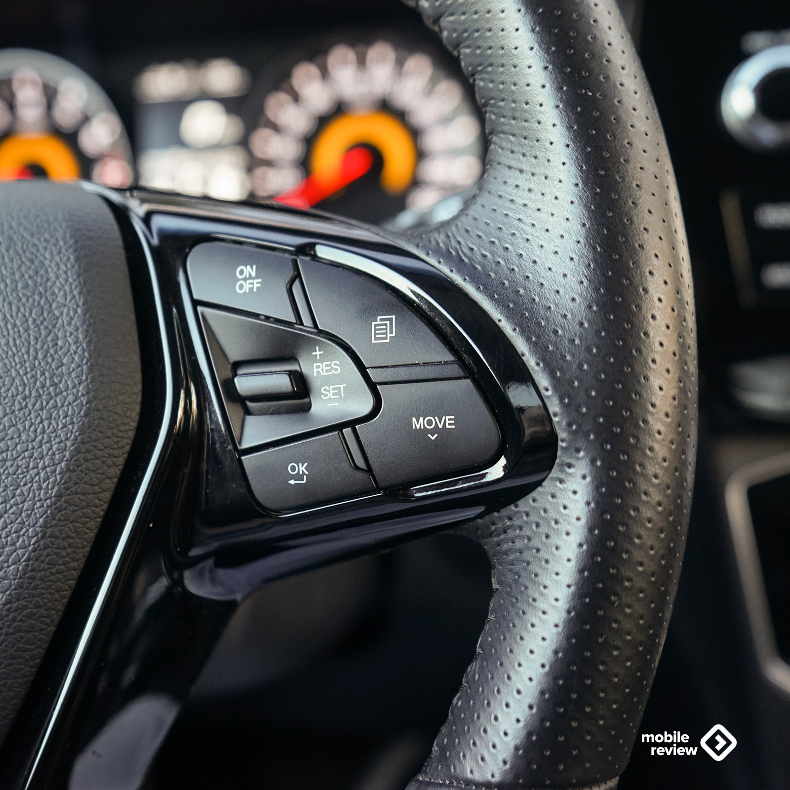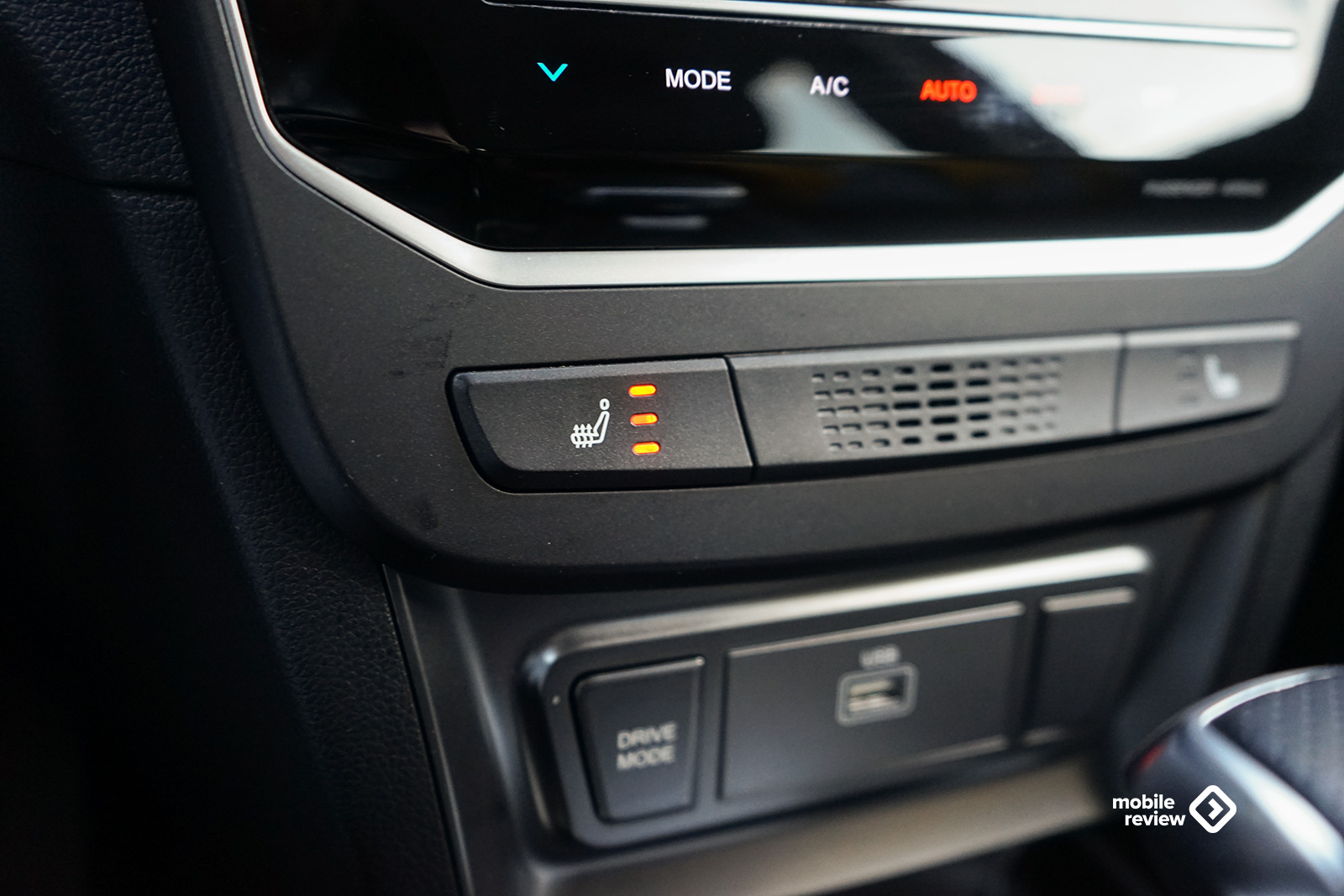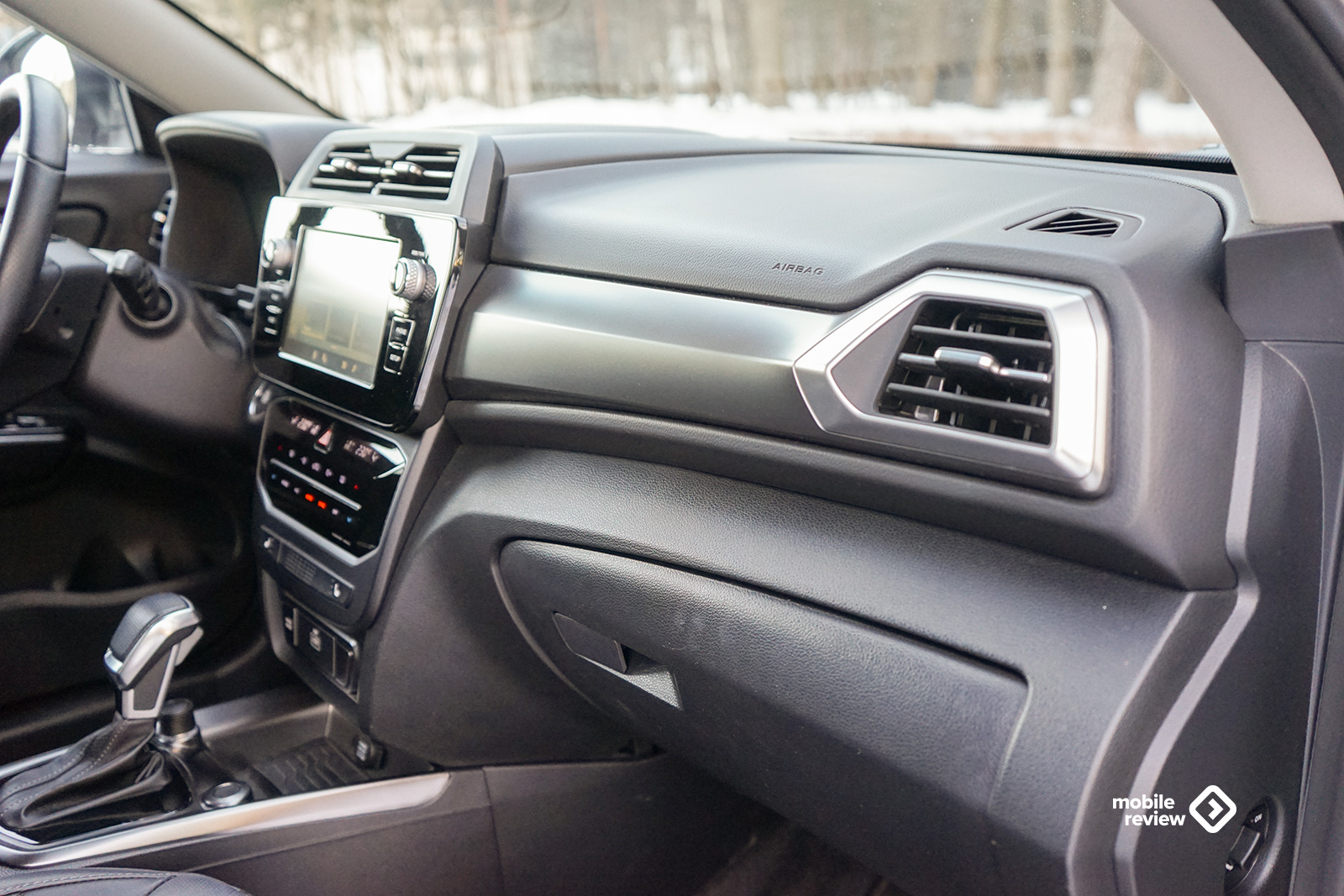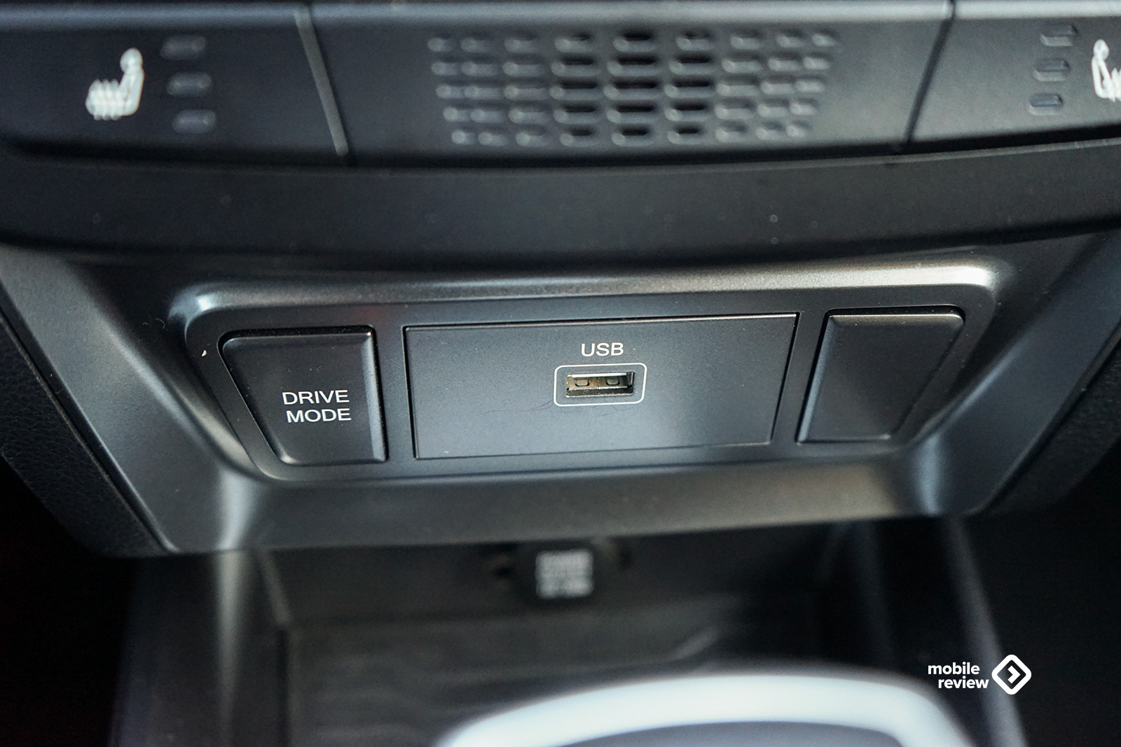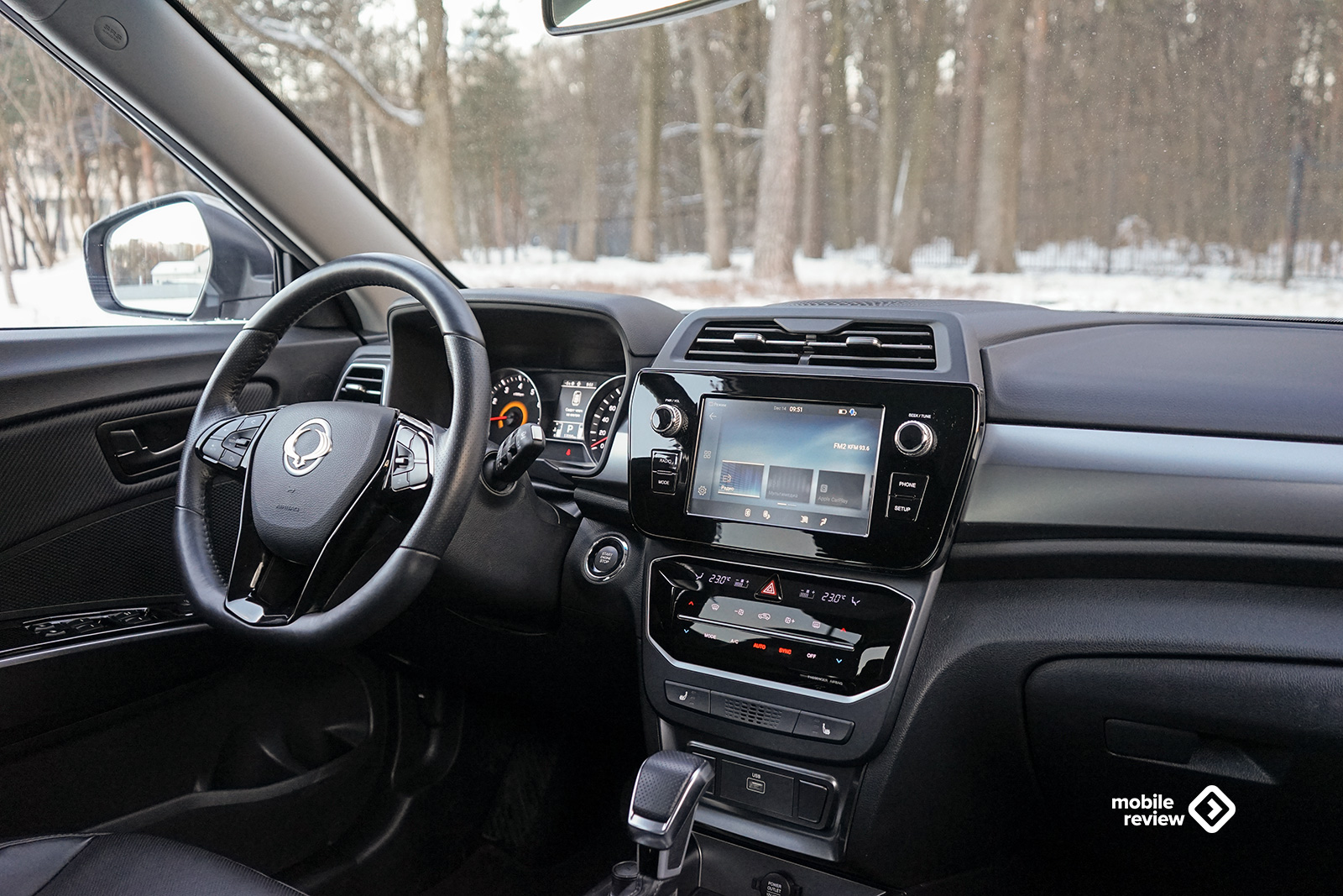Если дизайн экстерьера у KGM Tivoli ещё вполне неплох для 2025 года, то вот от интерьера попахивает нафталином, хотя консерваторам будет в самый раз. Так, в салоне нас встречает прямая передняя панель с несколькими ярусами и простенькими переходами. По центру как отдельный элемент, каковым он и является, так как в младшей комплектации его нет, установлен блок мультимедиа с небольшим 8-дюймовым дисплеем и огромными глянцевыми “ушами”, на которых есть несколько физических кнопок и две ручки. Ниже интегрирован крупный блок двухзонного климат-контроля с собственными экранчиками, но сенсорными клавишами. Приборная панель, прикрытая крупным козырьком и утопленная в консоль, аналоговая, с крупной разметкой, белой подсветкой и монохромным дисплеем по центру. Центральный тоннель здесь низкий, но вот рычаг АКПП, наоборот, высокий. Плюс по салону тут и там в хаотичном порядке разбросаны физические кнопки, будто их ставили в последний момент. Так, кнопка обогрева рулевого колеса находится с левой стороны за рулем и не видна с места водителя. Клавиши трехуровневого обогрева передних сидений смещены ниже комфортного уровня на передней панели, а кнопка смены режимов движения так и вовсе установлена почти на самом полу. Ещё в автомобиле спереди нет нормальной ниши, в которую бы поместился современный смартфон, а единственный USB-A находится высоковато и не в самом удобном месте.