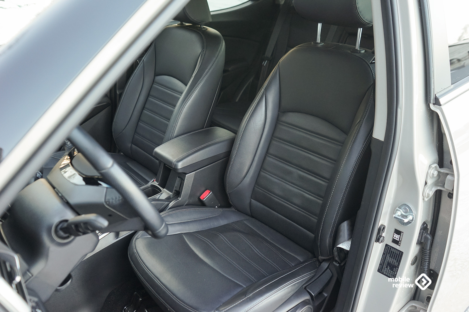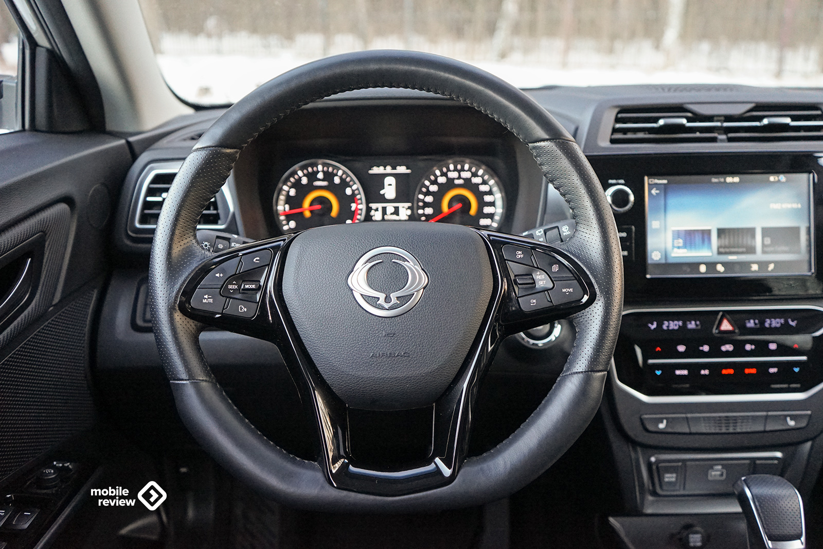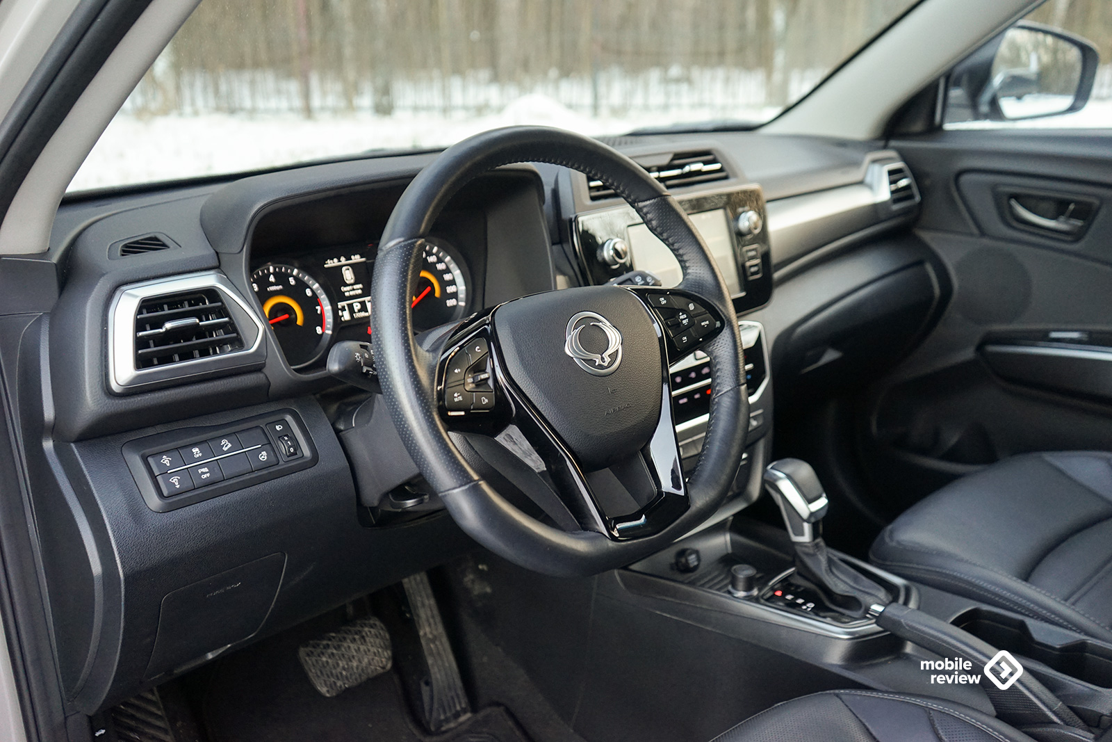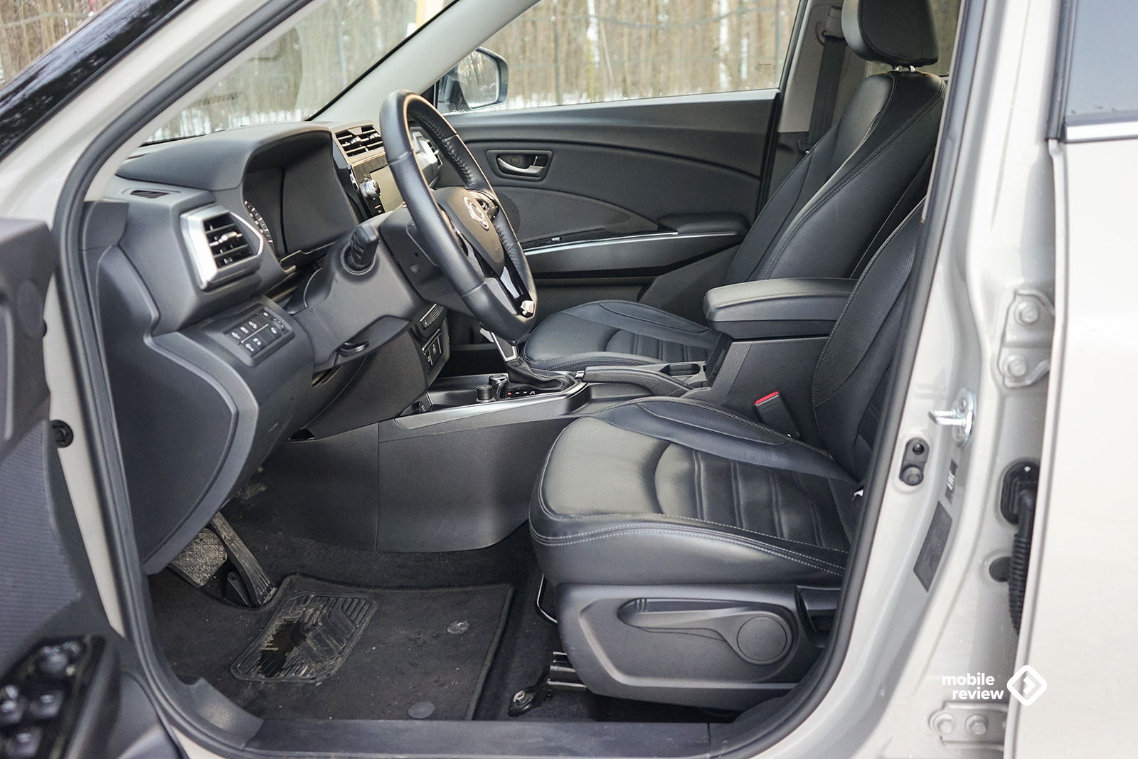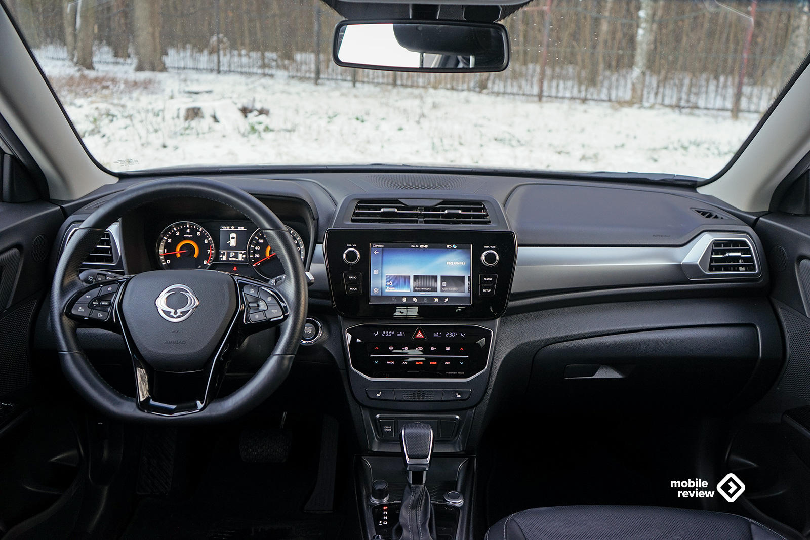 Посадка за рулем городского кроссовера удобная, кресла в меру жесткие, с выраженной боковой поддержкой и правильным профилем. Рулевая колонка в автомобиле регулируется как по высоте, так и по вылету, но последнего чуть-чуть не хватает рослым водителям. Регулировки кресла здесь исключительно механические, что немного обескураживает, если вспомнить цену автомобиля. По обзорности к Tivoli вопросов особо нет, стойки достаточно тонкие и не перекрывают обзор, отставленные боковые зеркала средние по размеру, да и через салонное зеркало все неплохо видно.