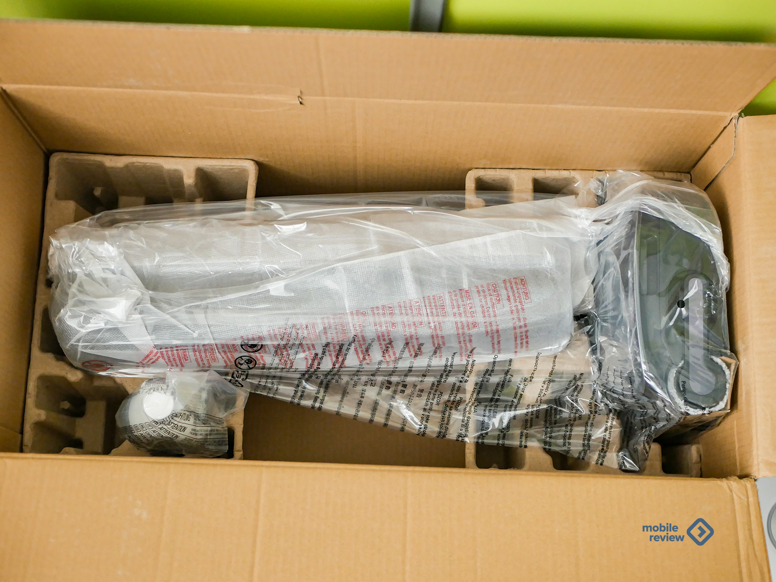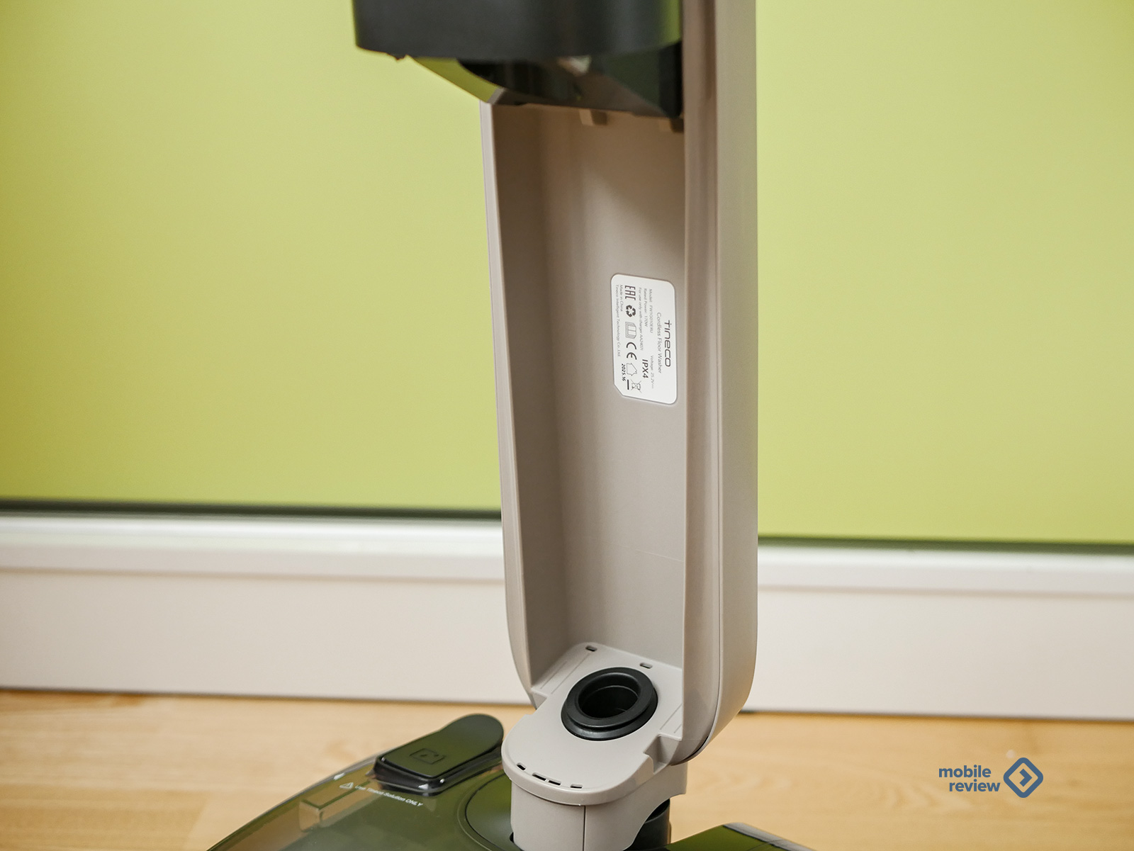 Ну и, наконец, сам Tineco iFLOOR Y5 Stretch. В коробке он лежит в разобранном виде: отдельно корпус, отдельно ручка. Ручка бледно-бежевая, пластик приятный на ощупь, без заусенцев и люфтов. Крепится на защелку просто и надежно. Именно благодаря съемной конструкции все упаковано так плотно и компактно.
