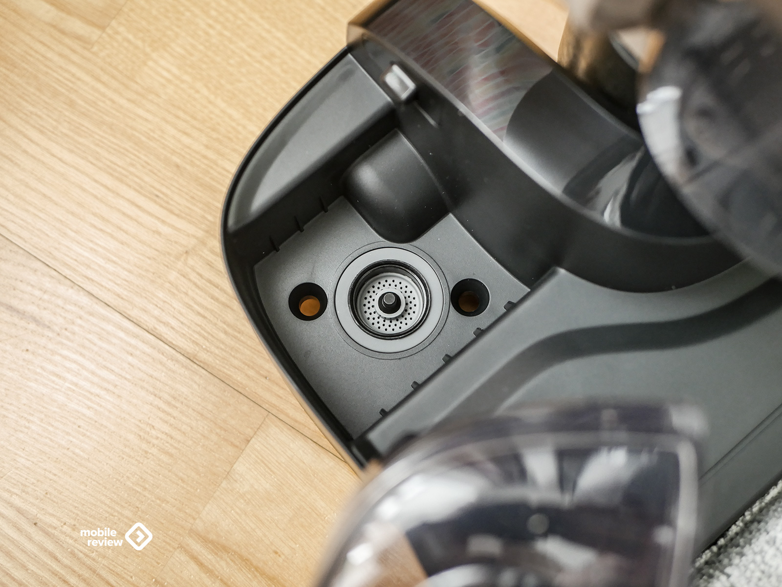 Теперь про контейнер с чистой водой. Вот тут самое интересное. Он находится не где-то в середине корпуса, как это обычно бывает, а внизу, прямо рядом с роликовой щеткой. С непривычки кажется странным, но только до первого использования. Зачем это сделано? Во-первых, вес. Когда бак висит посередине, пылесос становится тяжелее в управлении, его приходится удерживать в равновесии. Здесь же центр тяжести смещен вниз, корпус разгружается. Во-вторых, давление. Бак с водой прижимает щетку к полу, и она лучше контактирует с поверхностью. Мелочь, а эффективность уборки растет.