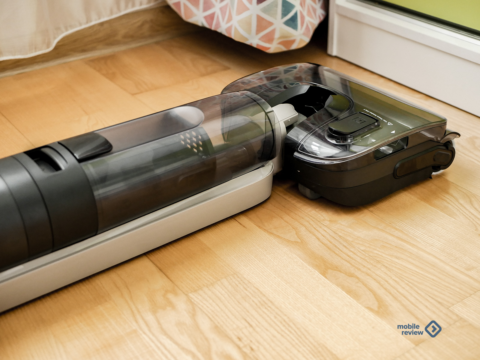 Гигиена, кстати, тут проработана до мелочей. Двухбаковая система: один бак со свежей водой, второй — для грязной. Они не пересекаются, вы всегда моете пол чистой водой, а не тем «киселем», который только что собрали. Объем баков серьезный: 1 литр чистой, 0,8 литра грязной. Этого хватает на полноценную уборку двушки или трешки без дозаправки. И визуально понятно, когда что сливать.