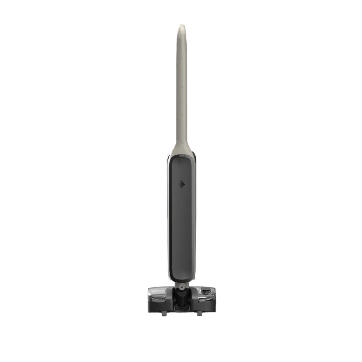 Корпус почти целиком пластиковый, но это не тот пластик, который через месяц покроется паутиной царапин и начнет подозрительно поскрипывать. Здесь материал плотный, приятный на ощупь. Матовые поверхности дополнены глянцевыми вставками ровно настолько, чтобы не выглядеть скучно, но и не превращать пылесос в полировальную машину для отпечатков пальцев. Верхняя часть черная, сдержанная, пыль на ней незаметна. Нижняя зона, где крепится бак для грязной воды, глянцевая. Контейнер для чистой воды полностью прозрачный. И это не просто дизайнерский свист, а чистая прагматика: видишь уровень воды без лишних телодвижений. Залил, глянул, поехал.