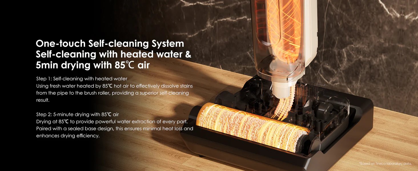 Теперь про самое приятное. Самоочистка One-Touch. После уборки вы ставите пылесос на базу, нажимаете одну кнопку, и все. Серьезно, все. Машина сама промывает щетку горячей водой, пропаривает внутренние трубки и потом пять минут сушит все горячим воздухом 85 градусов. Никакого запаха мокрой тряпки, никакой плесени, никаких попыток отодрать шерсть пальцами. Валик выходит чистый, пушистый и сухой.
