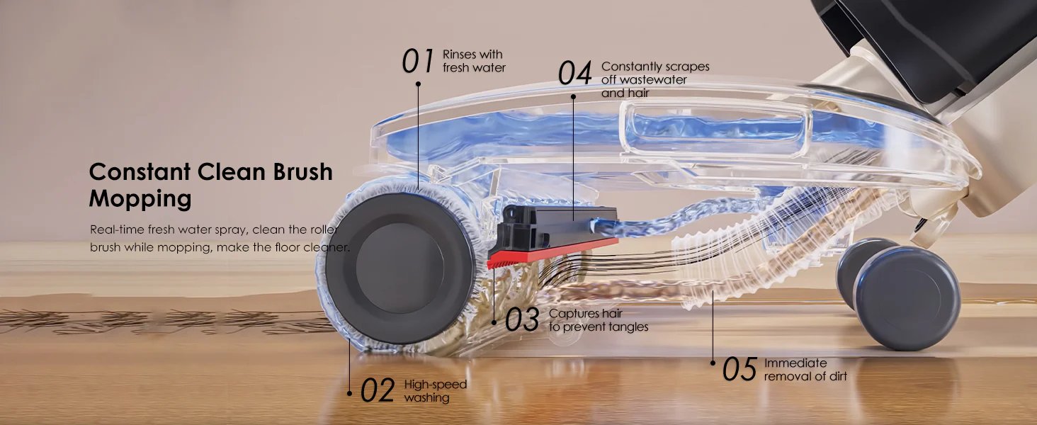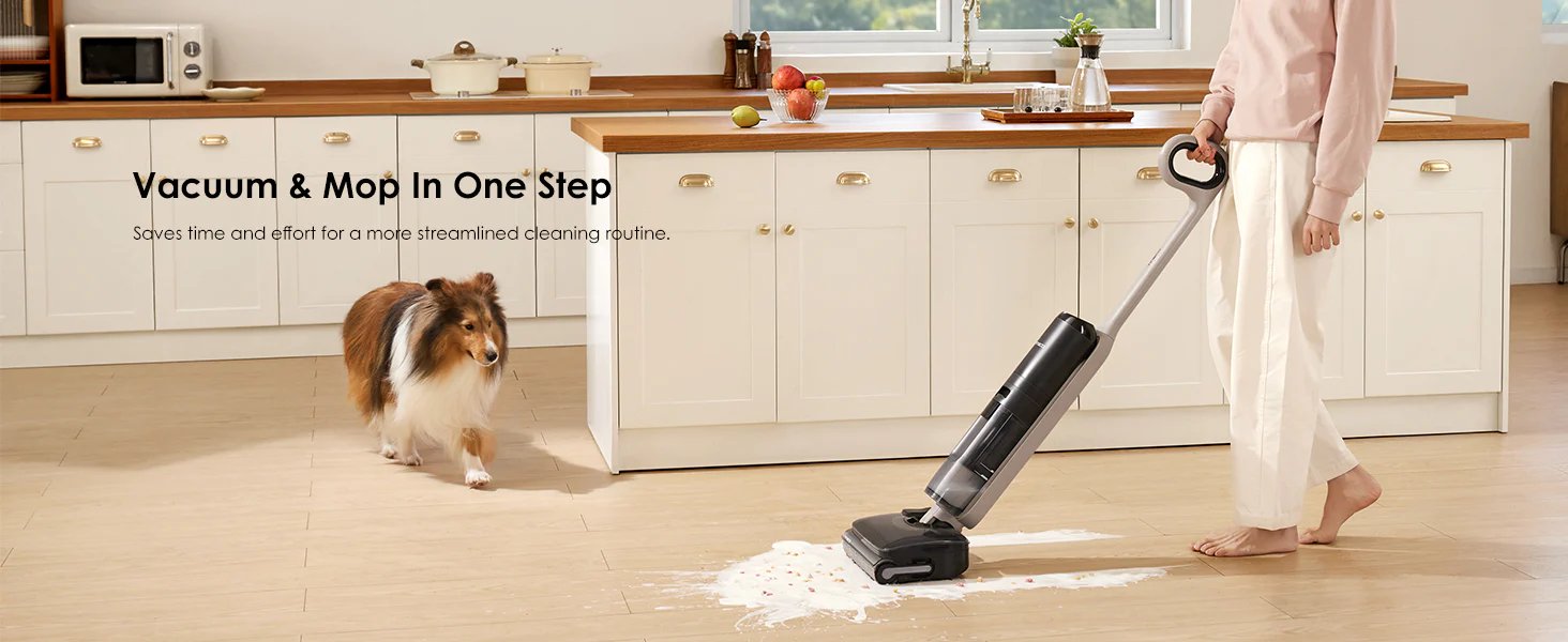Первое и самое очевидное: он делает два дела сразу. Пылесосит и моет за один проход. Звучит как база, но в жизни это экономит час жизни каждый день. Собрать сухой мусор, тут же протереть пол чистой водой — и никаких «сначала веник, потом швабра, потом отжать, потом перелить». И да, липкий сок от апельсина или раздавленный виноград он переваривает без вопросов.