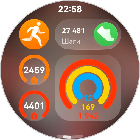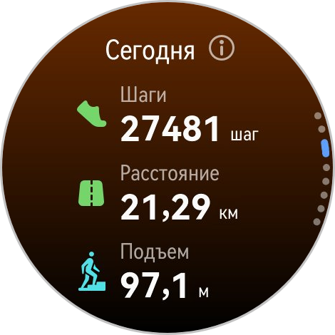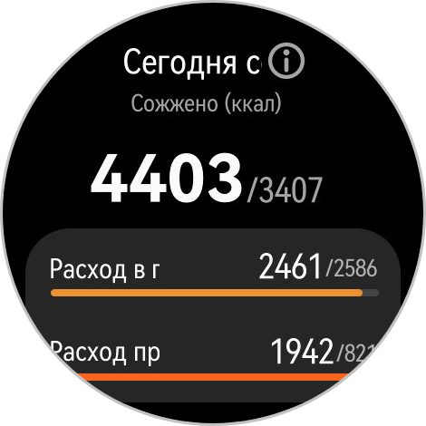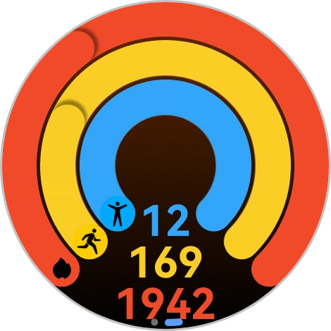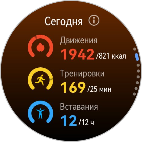 Наконец, обычный подсчет вашей активности — тут показывается, сколько вы прошли, рисуются круги. Красный круг — это расход калорий при нагрузке, оранжевый — физическая активность, голубой — часы активности, когда вы не были в состоянии покоя.