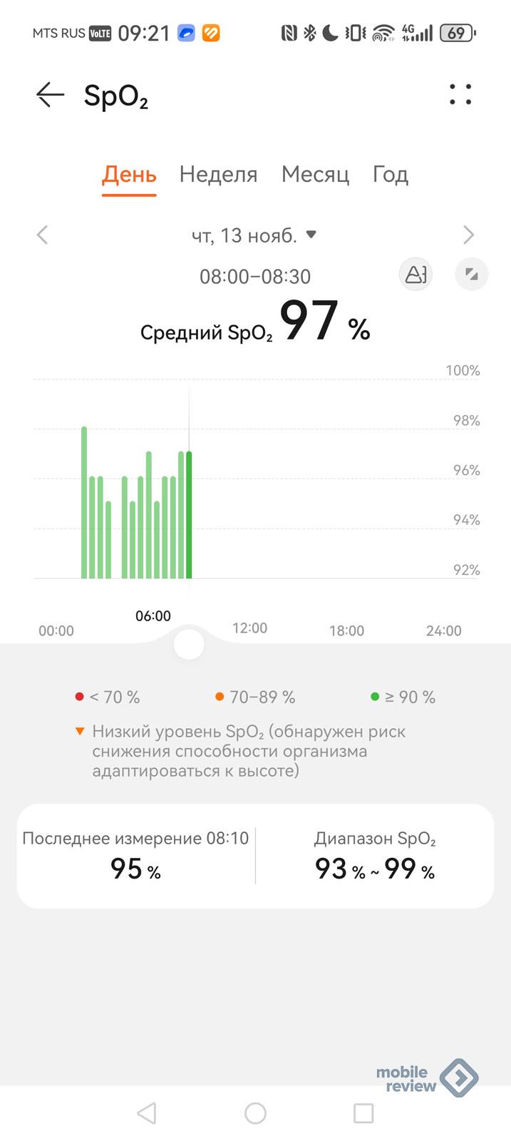 Качество измерения напрямую зависит от плотности обхвата запястья, если часы немного провисли (например, вы вылезли из горной речки), то показания начнут привирать в нижнюю сторону. У меня они падали ниже 90%, и я должен был чувствовать себя плохо, но этого не было. На смартфоне можно посмотреть показания более подробно и в деталях. Ровно так же, как для всех других показателей.