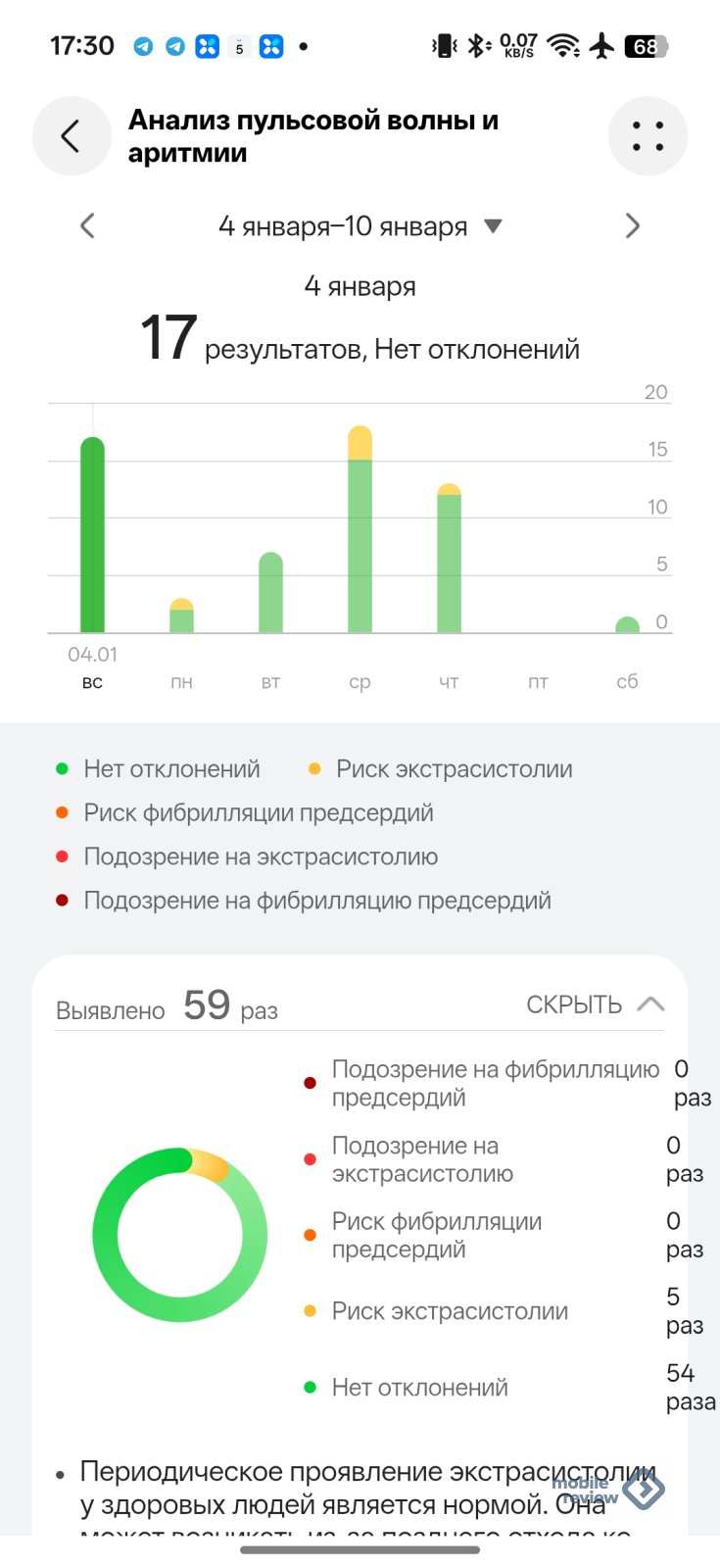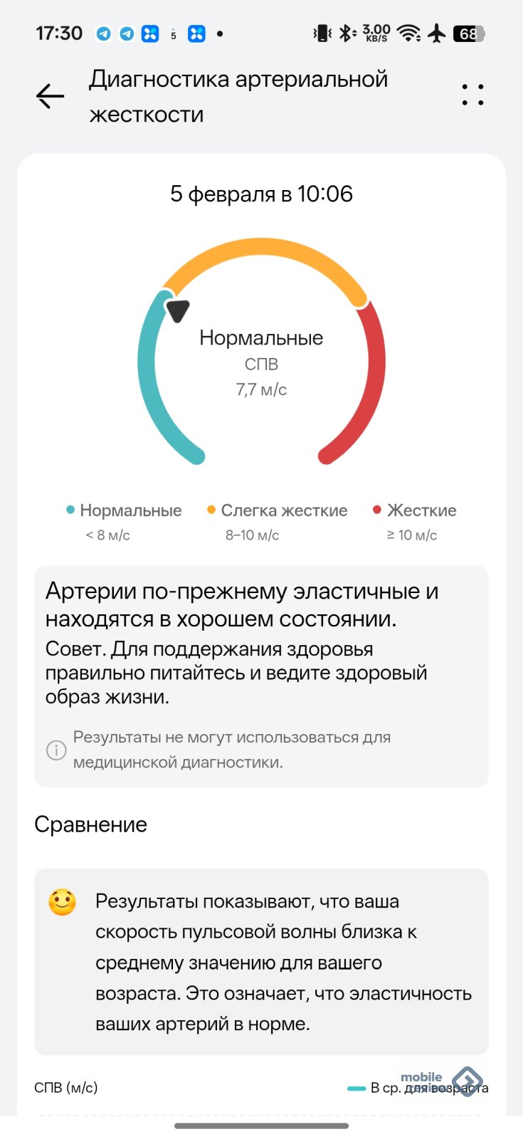 В часах есть все датчики и сенсоры, чтобы удовлетворить любопытство пользователя. Помимо стандартного пульса, замеров сна и кислорода в крови часы умеют измерять аритмию (и даже научно предлагают сделать это спустя полчаса после тренировки, объясняя тем, что это наилучшее время), также можно замерять температуру, ЭКГ и даже жесткость артерий. Для ЭКГ и жесткости артерий надо прижимать палец к кнопке на корпусе часов, которая играет роль электрода.