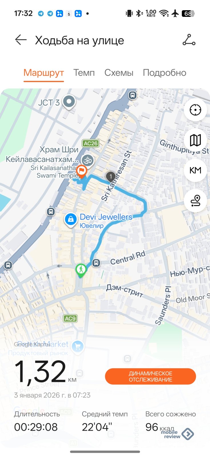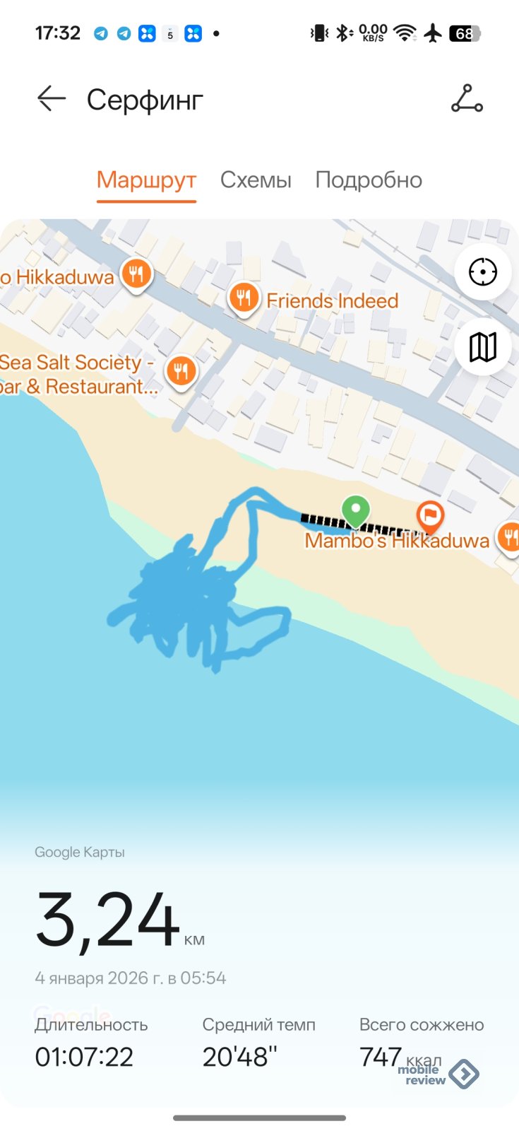 В остальном все супер. Особенно понравилось, что для видов спорта на открытом воздухе есть функция GPS. В приложении потом можно посмотреть карту перемещений. Также карта в схематичном виде показывается на экране тренировки. Например, на фото ниже — мои перемещения за час катания на серфинге. Выглядит забавно, но такой спорт: доплыл, поймал волну, скатился, поплыл обратно.