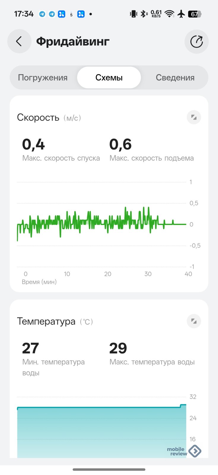 Часы показывают глубину, температуру воды, а также есть рабочий компас (я им пользовался, отлично работает) и скорость погружения и подъема. Последнее, к слову, очень полезно. Изучая данные погружений, я лучше понял, с какой предельной скоростью могу погружаться, чтобы потом не ходить с заложенными ушами.