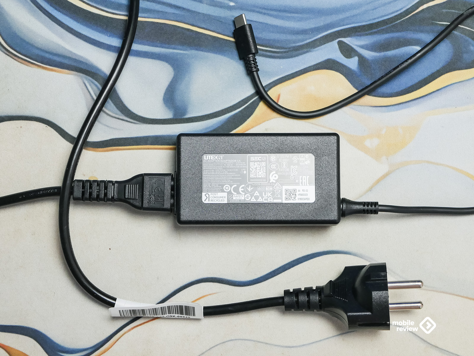 В комплекте идет адаптер LiteOn PA-1650-58 на 65 Вт. Он не самый компактный, толстый, классический, как у старых ноутбуков, хотя обычно современные ARM-устройства комплектуются маленькими USB-C зарядками, похожими на зарядники для смартфонов. Думаю, это стоит учитывать, если часто берете устройство в поездки.