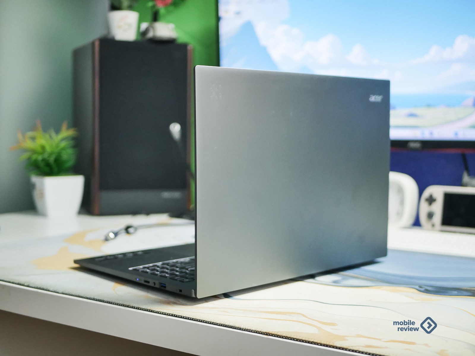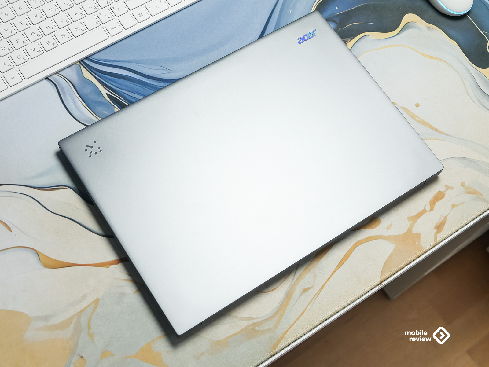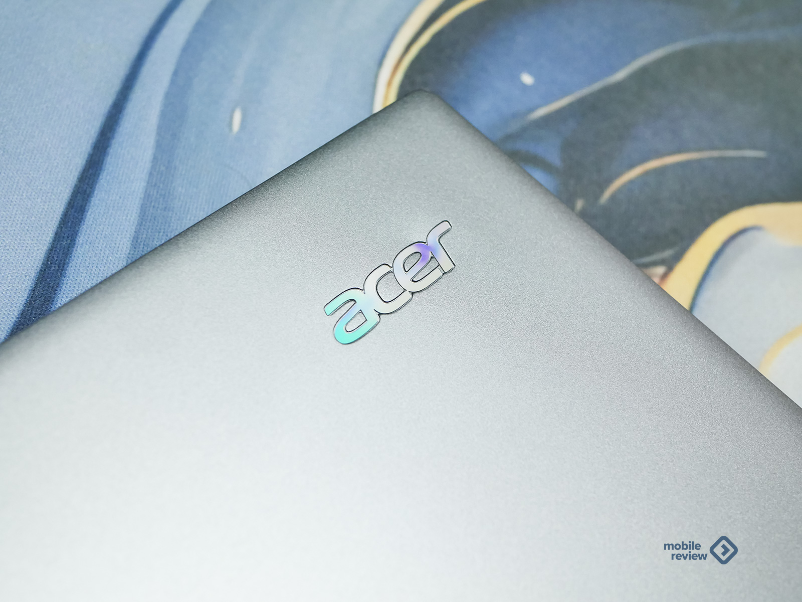 На верхней крышке с правой стороны выгравирована надпись Acer — она ловит свет и слегка переливается, создавая аккуратный визуальный акцент. Слева — оригинальный логотип в виде группы кружков (складываются в буквы AI), тоже выгравированных и красиво играющих на свету. Выглядит это просто, но со вкусом, без лишнего пафоса.