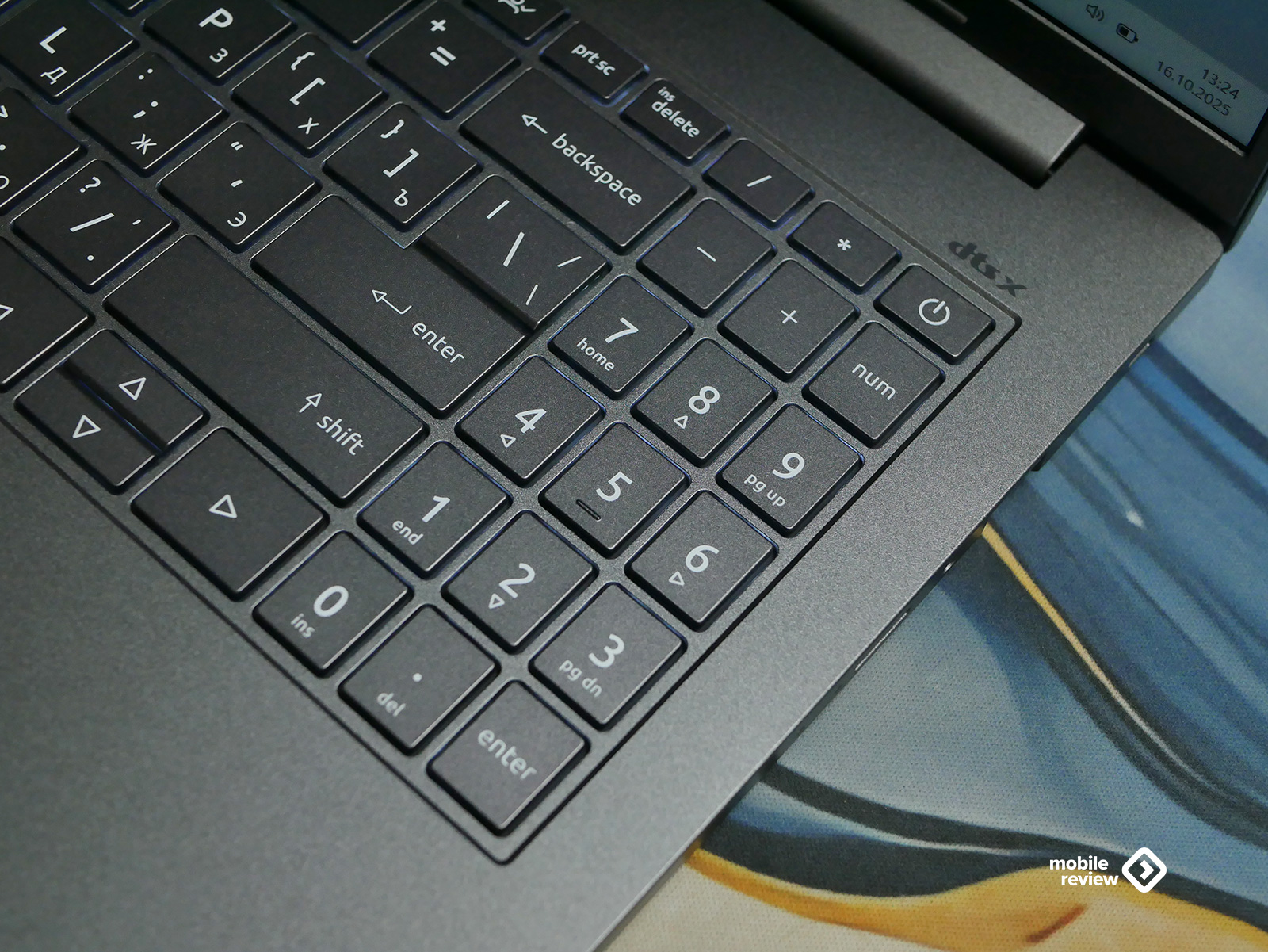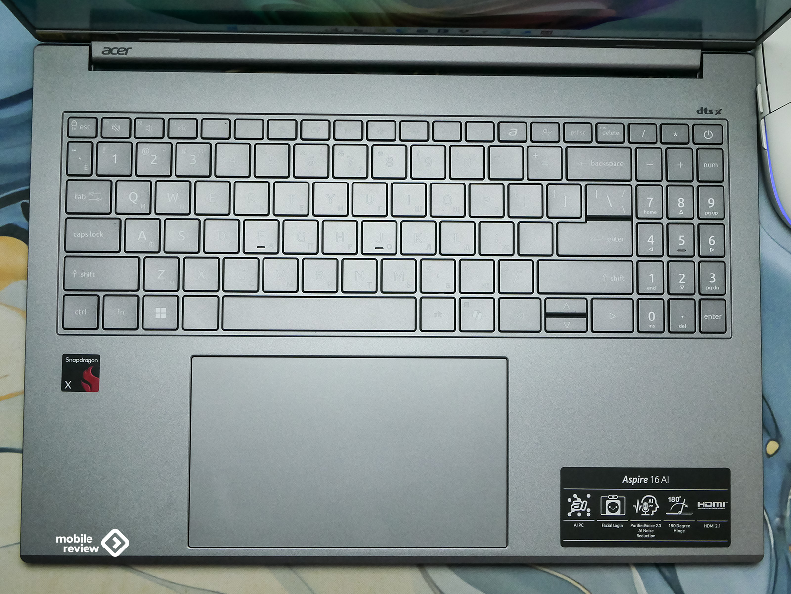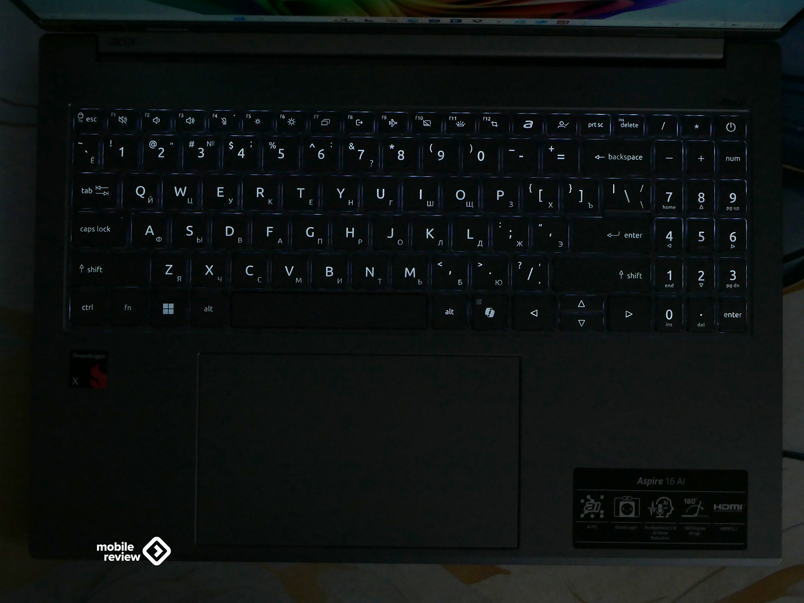 Клавиатура у Acer Aspire 16 AI без сюрпризов, в классическом стиле. С правой стороны есть полноценный цифровой блок, хотя он немного ужат по ширине. В целом все выглядит аккуратно и сбалансированно.