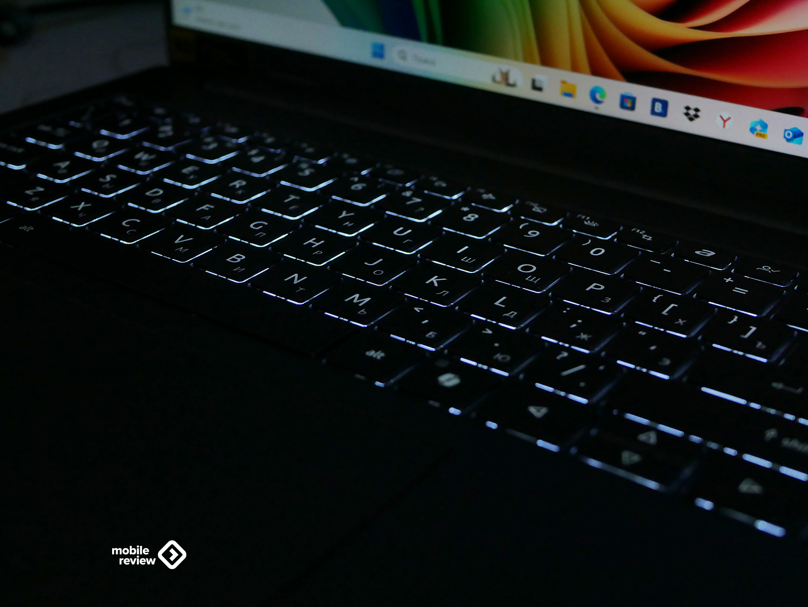 Подсветка клавиатуры двухуровневая. Она не слишком яркая, но ночью или в затемненной комнате этого вполне хватает. Днем подсветку практически не видно, но это и не критично. В верхнем ряду функциональных клавиш есть интересная кнопка с буквой «А» — она открывает фирменное приложение Acer Sense. Думаю, это удобно, когда нужно быстро добраться до системных настроек или информации о состоянии устройства.
