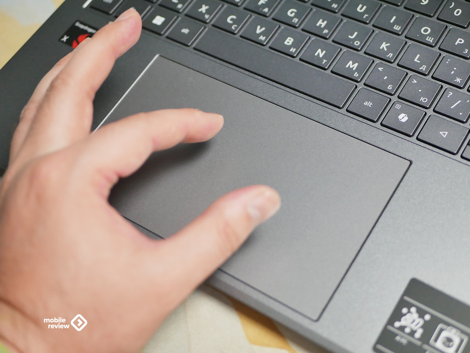Тачпад здесь просто огромный — занимает почти треть нижней панели. Его размеры впечатляют: 150 на 90 мм. Поверхность пластиковая, гладкая и приятная на ощупь, палец скользит без сопротивления. Работает точно, жесты обрабатываются корректно. Под тачпадом спрятаны две привычные кнопки — левая и правая, срабатывают примерно на половине глубины панели.