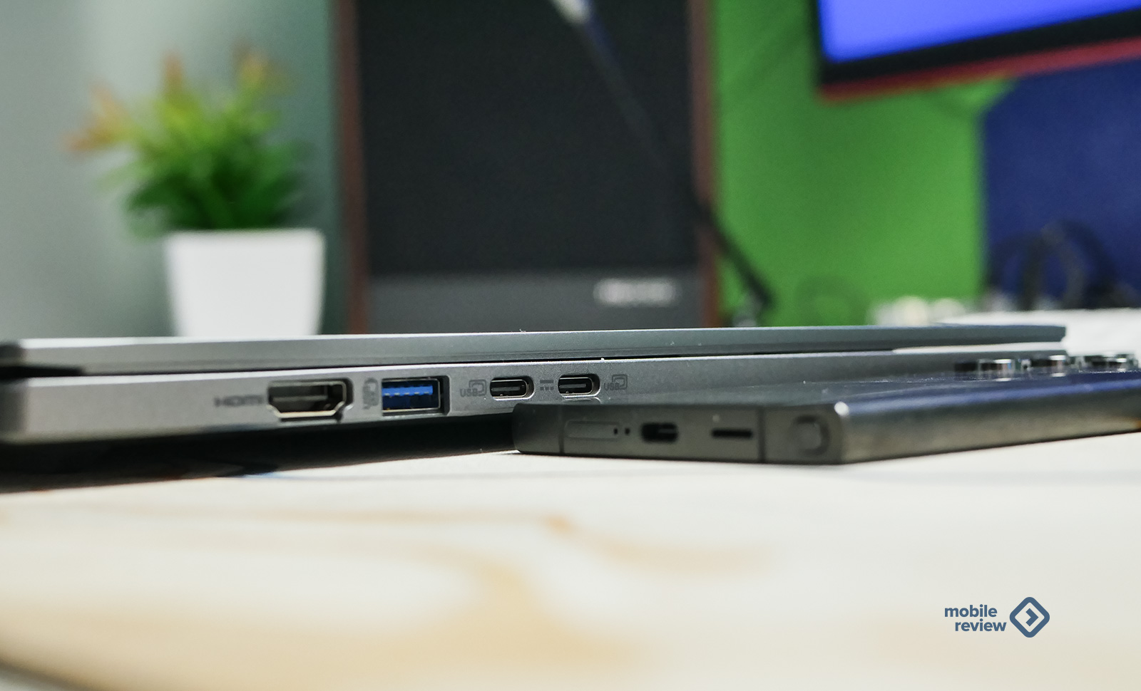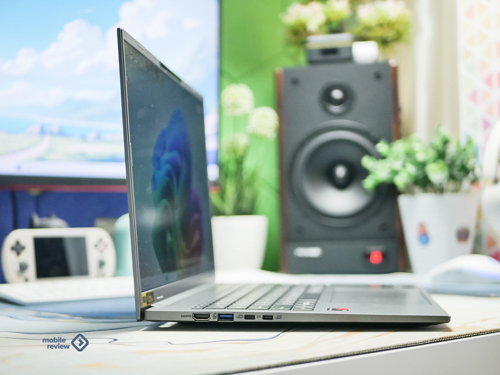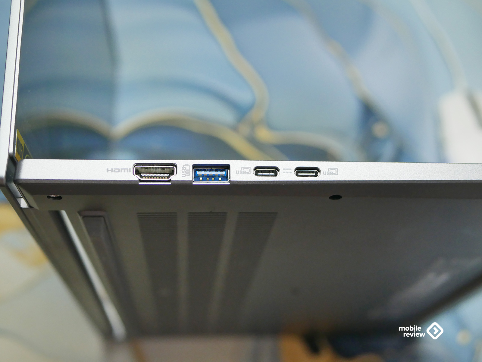 На левой стороне — все самое нужное для работы. Здесь есть классический HDMI версии 2.1, который спокойно тянет даже 8K-разрешение, дальше идет привычный USB Type-A 3.2 — куда без него, ведь флешки и старые аксессуары все еще живы. Чуть правее расположились два USB Type-C версии 4.0 — это уже универсальные бойцы. Через них можно подключать внешние мониторы или заряжать ноутбук. Думаю, многим понравится, что устройство можно питать даже от обычного зарядника для смартфона на 65 Вт — удобно, если вы часто в разъездах.