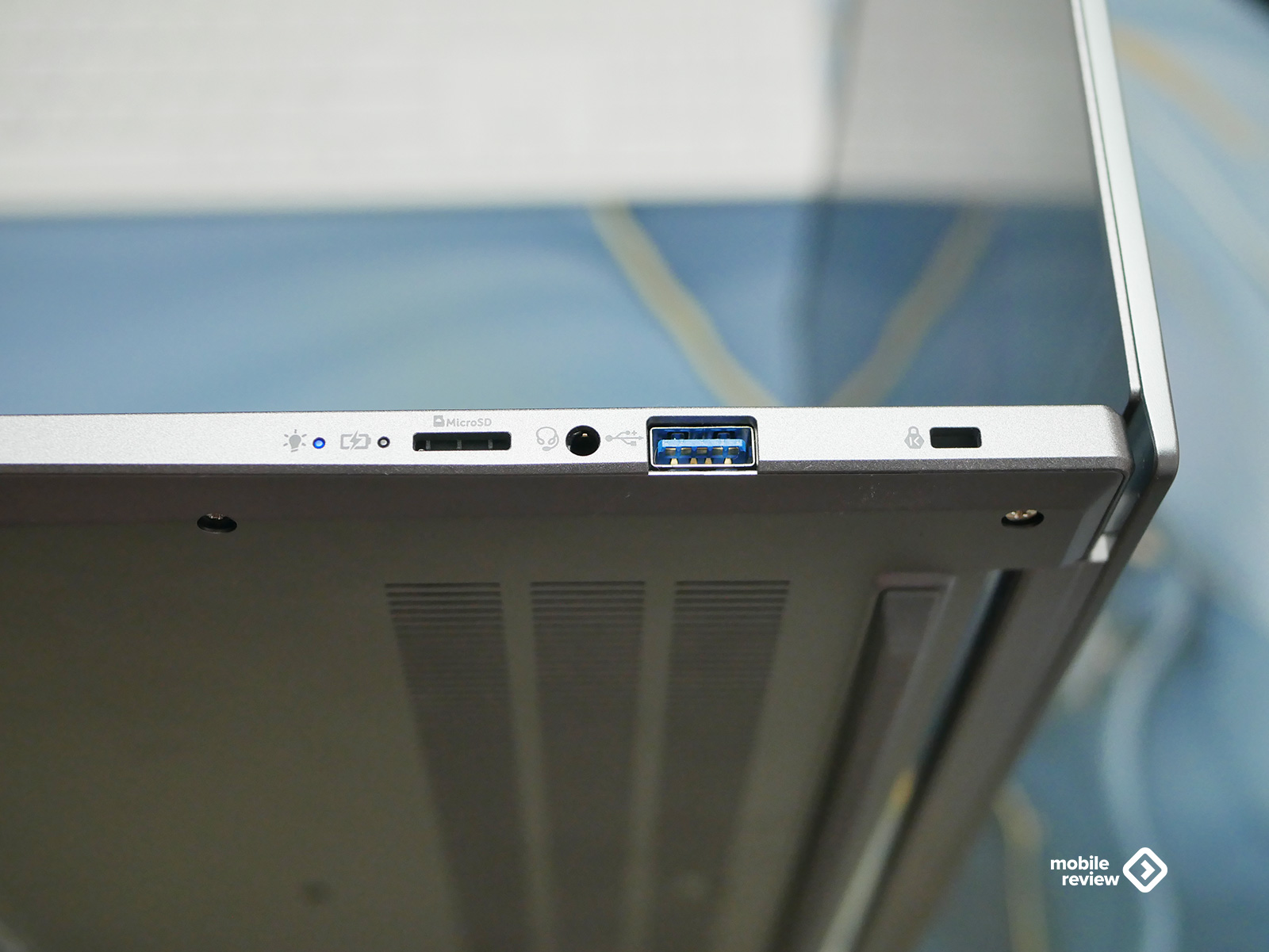 Правая сторона тоже не пустует. Здесь находится замок Kensington для безопасности, еще один USB Type-A 3.2, стандартный 3,5-мм аудиоразъем для наушников или гарнитуры, слот для microSD-карт и пара индикаторов состояния.
