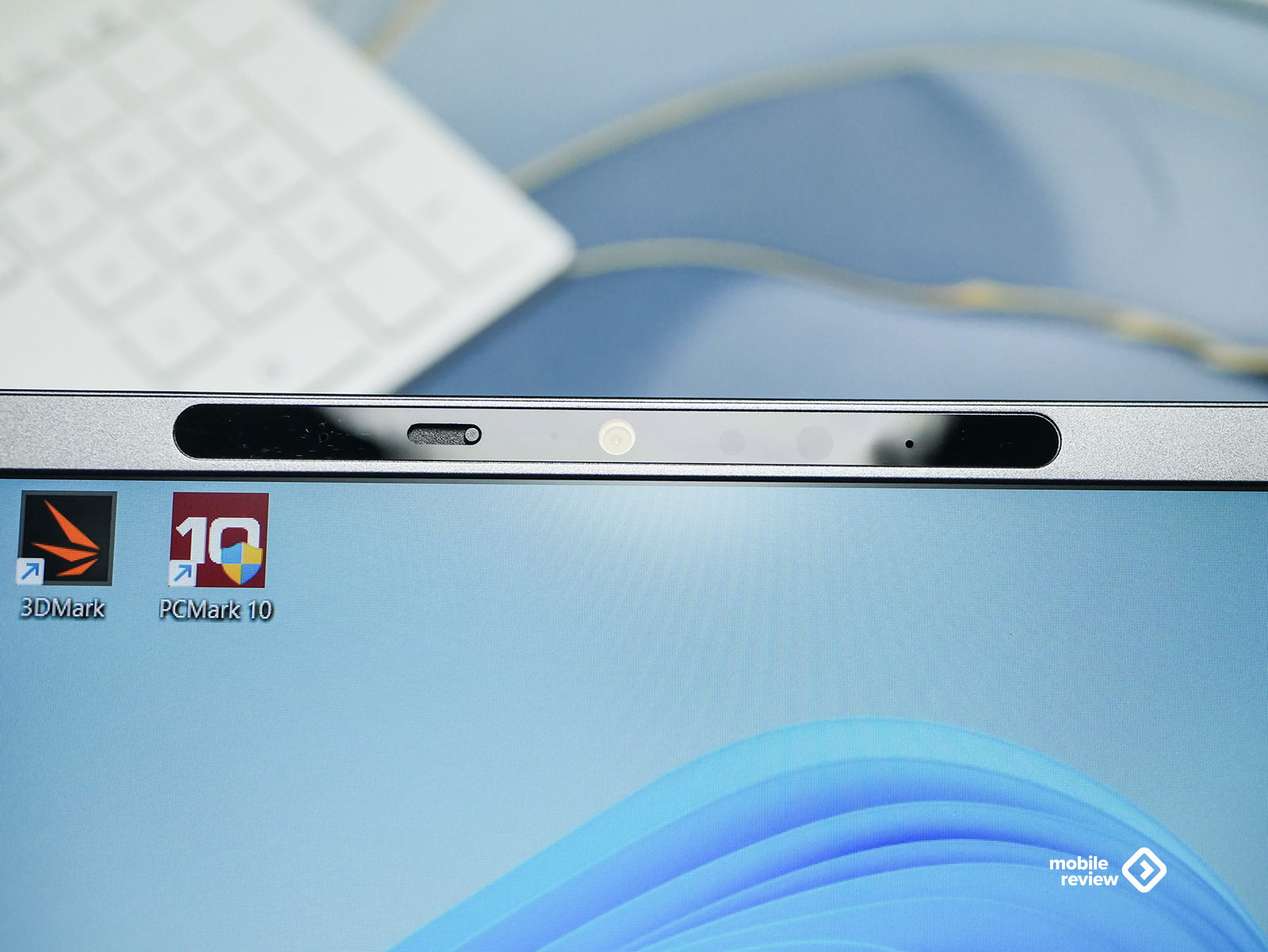 Если поднять крышку, сверху можно заметить веб-камеру со шторкой приватности — мелочь, а приятно. Рядом расположены микрофон и индикатор активности камеры. Тут же встроена система распознавания лица Windows Hello, так что ноутбук можно разблокировать буквально взглядом. Удобно и даже слегка футуристично — особенно когда срабатывает мгновенно.