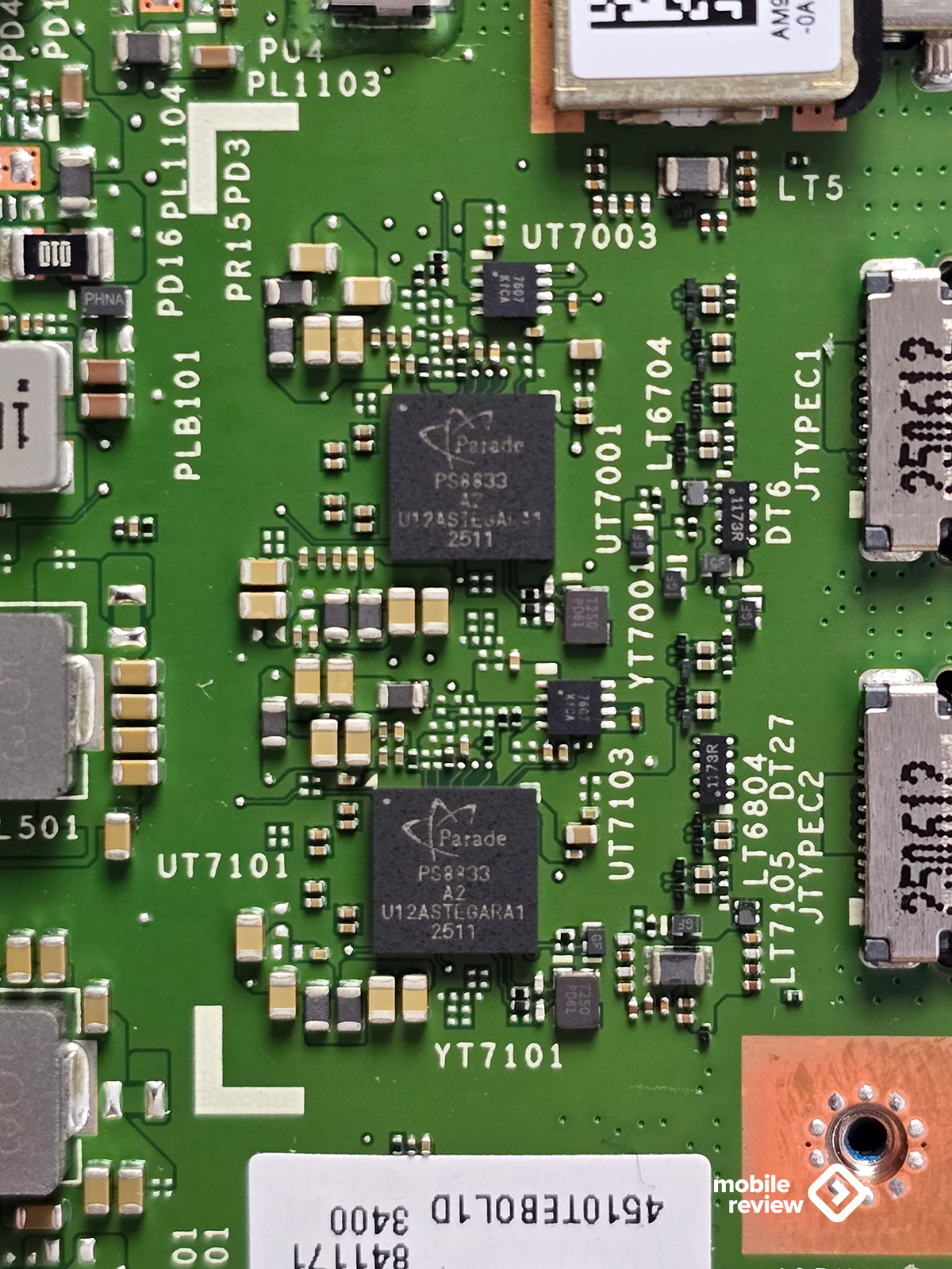 Что касается отдельных компонентов, здесь стоит отметить несколько интересных микросхем. ENE KB9022G — мультиконтроллер, который управляет различными периферийными функциями устройства. Parade PS185HDM отвечает за передачу видеосигналов HDMI, конвертируя и корректируя их тайминги. Winbond W25Q512NW — это NOR Flash-память, где хранится код системы. И еще один важный компонент — Parade PS8833, высокопроизводительный ретаймер для интерфейсных сигналов USB4.
