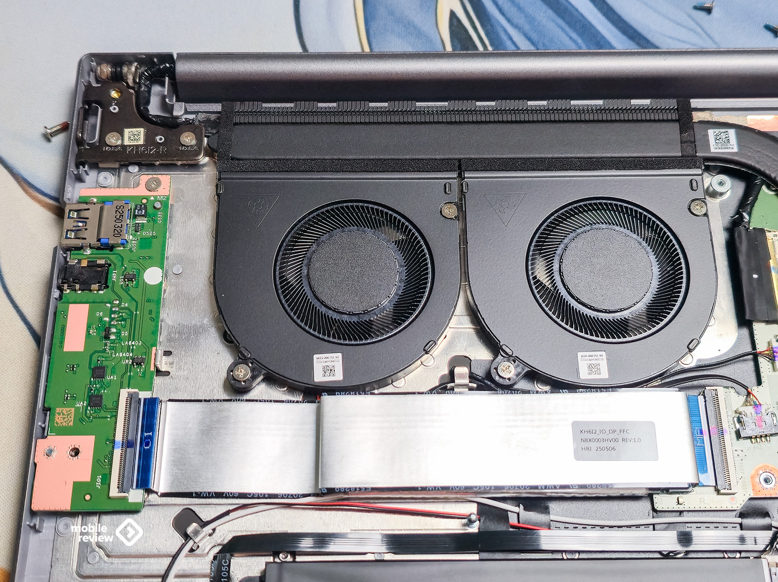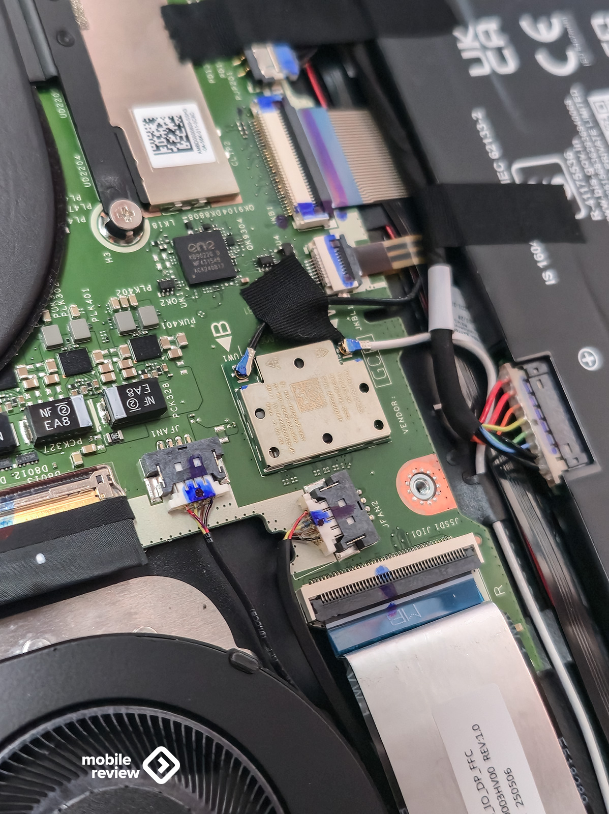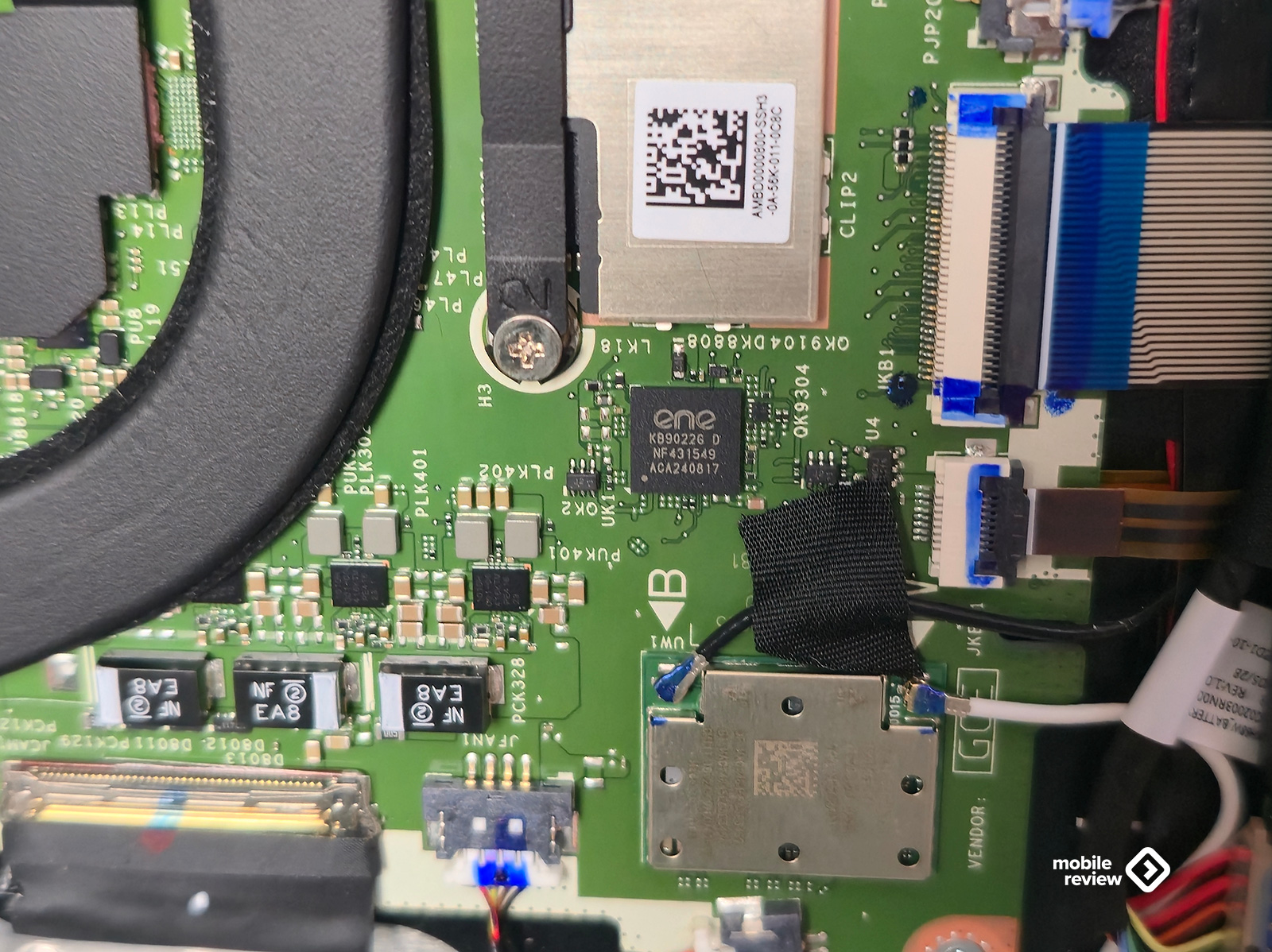 Материнская плата в Acer Aspire 16 AI довольно компактная и расположена в правой верхней части корпуса. Чтобы сделать корпус тонким и компактным, вентиляторы сместили в левую сторону, а интерфейсы слева соединены с материнской платой через шлейф. Из-за этого шлейфа накопитель SSD оказывается под ним, и чтобы его вынуть, придется сначала аккуратно снять шлейф. Думаю, это типичный компромисс для тонких ультрабуков: компактность требует нестандартной компоновки.