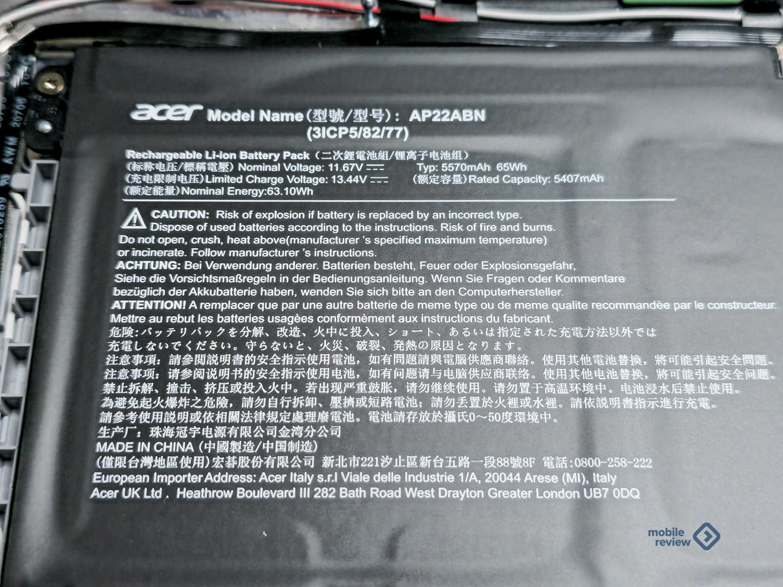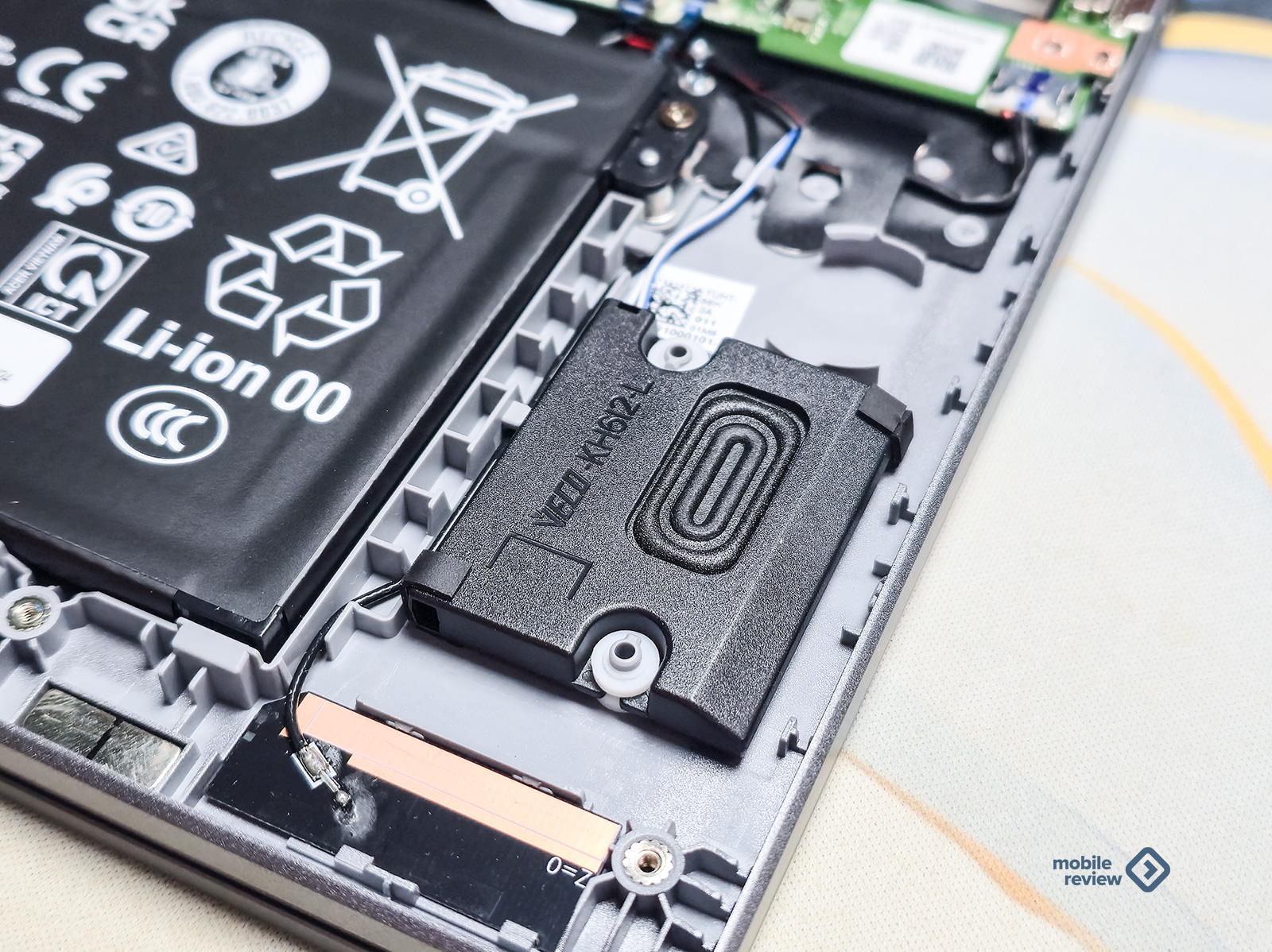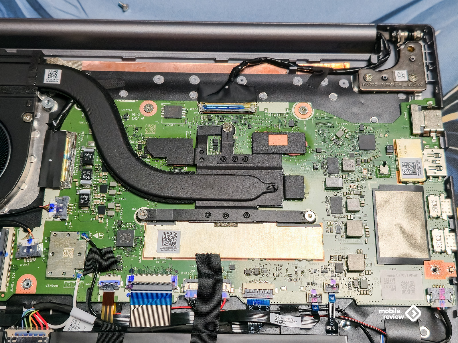 Материнская плата в Acer Aspire 16 AI довольно компактная и расположена в правой верхней части корпуса. Чтобы сделать корпус тонким и компактным, вентиляторы сместили в левую сторону, а интерфейсы слева соединены с материнской платой через шлейф. Из-за этого шлейфа накопитель SSD оказывается под ним, и чтобы его вынуть, придется сначала аккуратно снять шлейф. Думаю, это типичный компромисс для тонких ультрабуков: компактность требует нестандартной компоновки.
