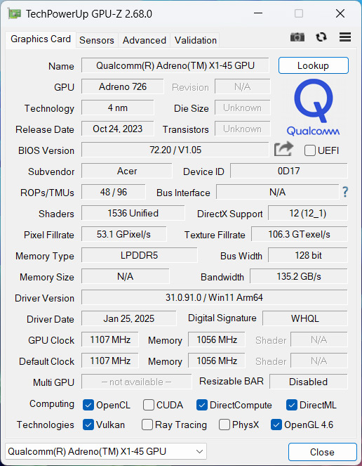 Все это я плавно подвожу к тому, что у нас на обзоре оказался ультрабук Acer Aspire 16 AI. И вот тут самое интересное — он работает на платформе ARM. Внутри установлен процессор Qualcomm Snapdragon X — свежий чип, представленный в январе 2025 года. Думаю, это вполне серьезная заявка со стороны Qualcomm на то, чтобы закрепиться в мире ноутбуков. Процессор выполнен по современному 4-нм техпроцессу и оснащен восемью ядрами ARMv9, которые разгоняются до 3,0 ГГц. Есть восемь потоков, а за графику отвечает встроенное решение Qualcomm Adreno X1-45. В общем, все по-взрослому — не смартфонный уровень, а реально полноценное железо для ноутбука. Подробнее о нем расскажу чуть дальше.