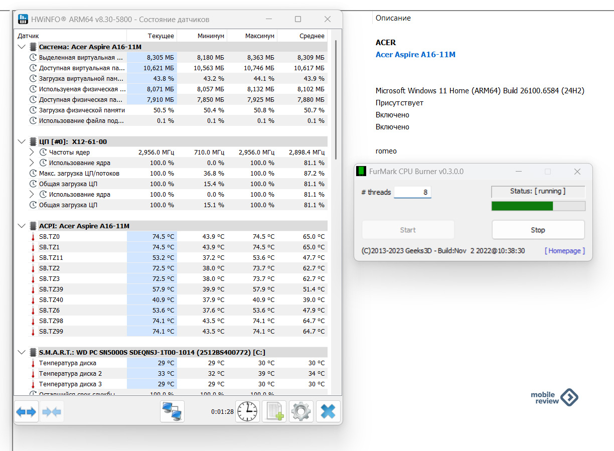 Мне кажется, самое время поговорить об автономной работе, потому что здесь ARM-платформа показывает себя интереснее большинства классических ноутбуков. Конечно, многое зависит от нагрузки и выбранного режима работы. На сайте производителя указано до 28 часов автономности, но, честно говоря, такую цифру можно получить только при минимальной яркости экрана и практически полном отсутствии нагрузки. То есть фактически в реальной жизни такой режим мало кому нужен.