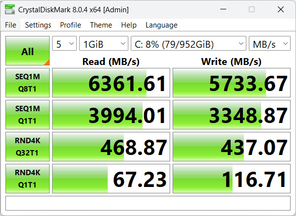 Накопитель — классический SSD формата M.2 2280 PCIe Gen4 x4 от Western Digital, модель SN50000S SDEQNSJ-1T00-1024 объемом 1 ТБ. Скорости чтения и записи достигают 6300 и 5700 МБ/с соответственно, что очень хорошо для повседневной работы и хранения больших объемов данных. Такой SSD обеспечивает не только быструю загрузку системы, но и комфортную работу с файлами и программами.