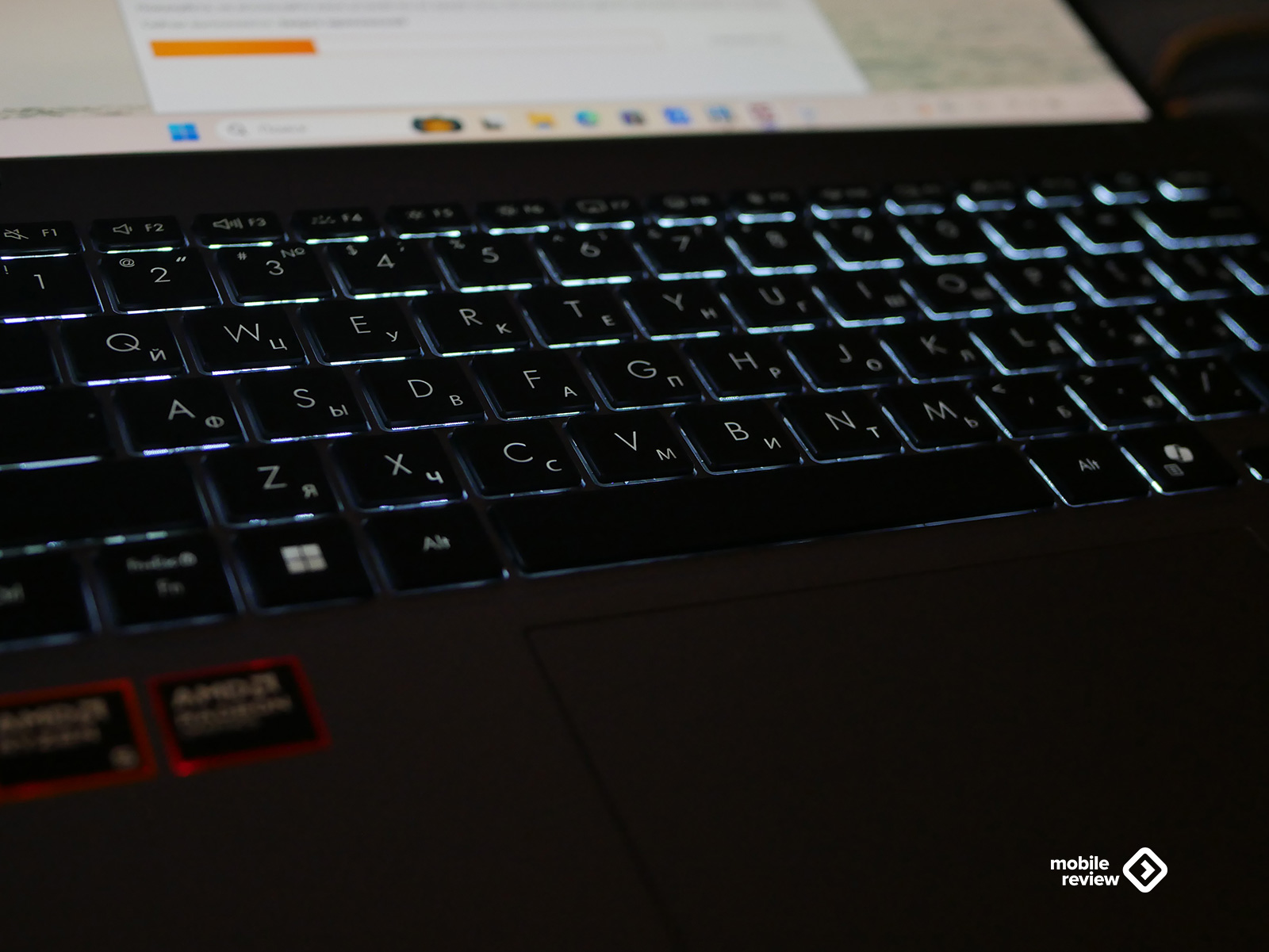 Ход кнопок — примерно 1.1 мм. Набирать текст вполне удобно. Работа с клавиатурой немного отличается от MacBook или ноутбуков Huawei. Что-то среднее между ними. Набор достаточно тихий, кнопки не клацают.