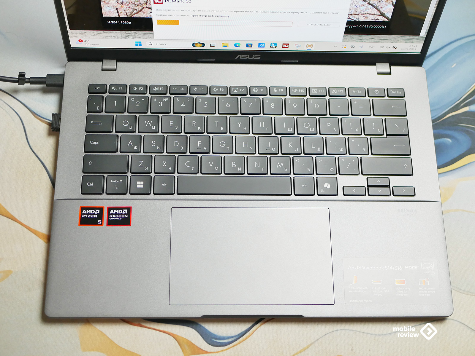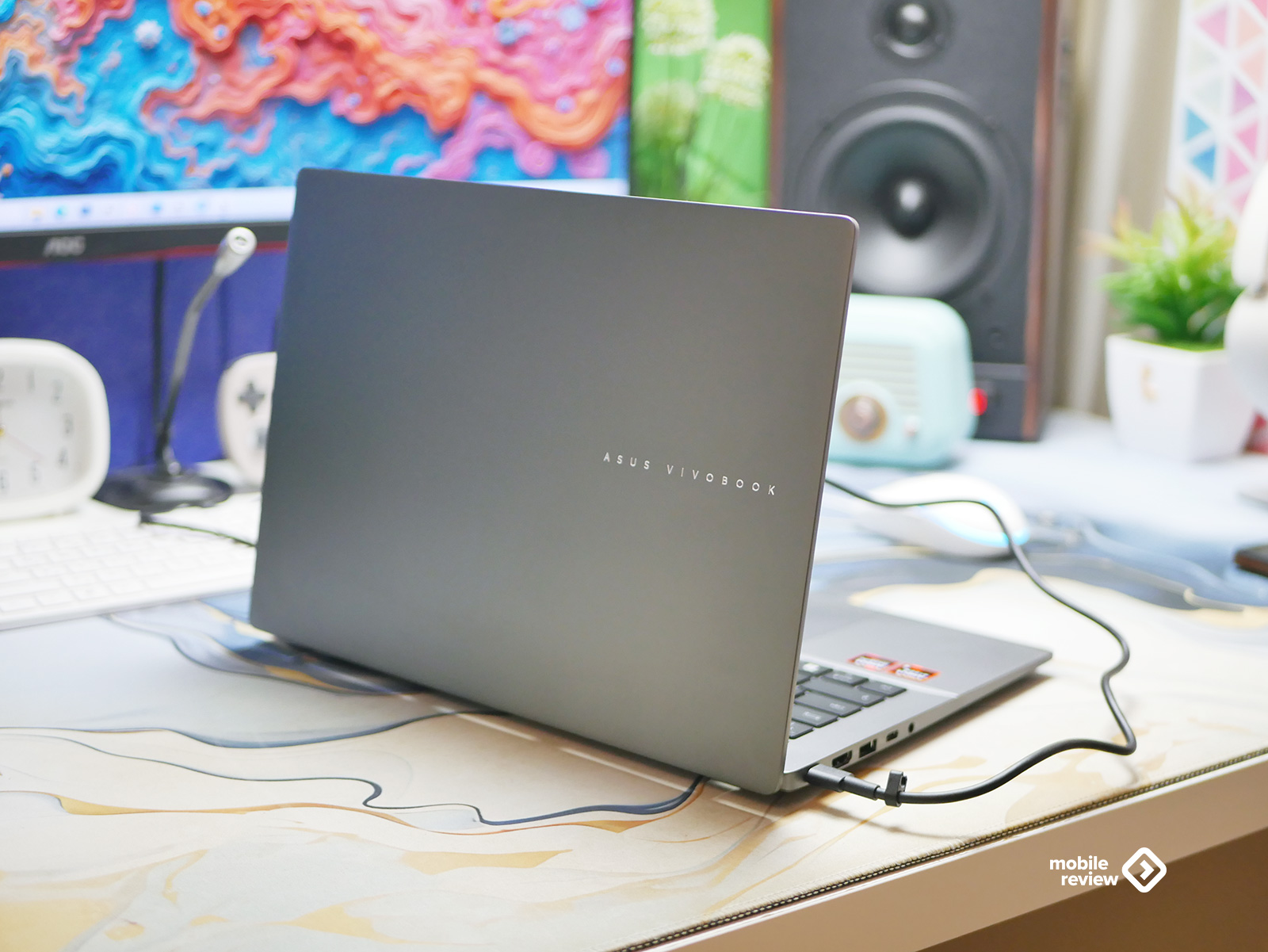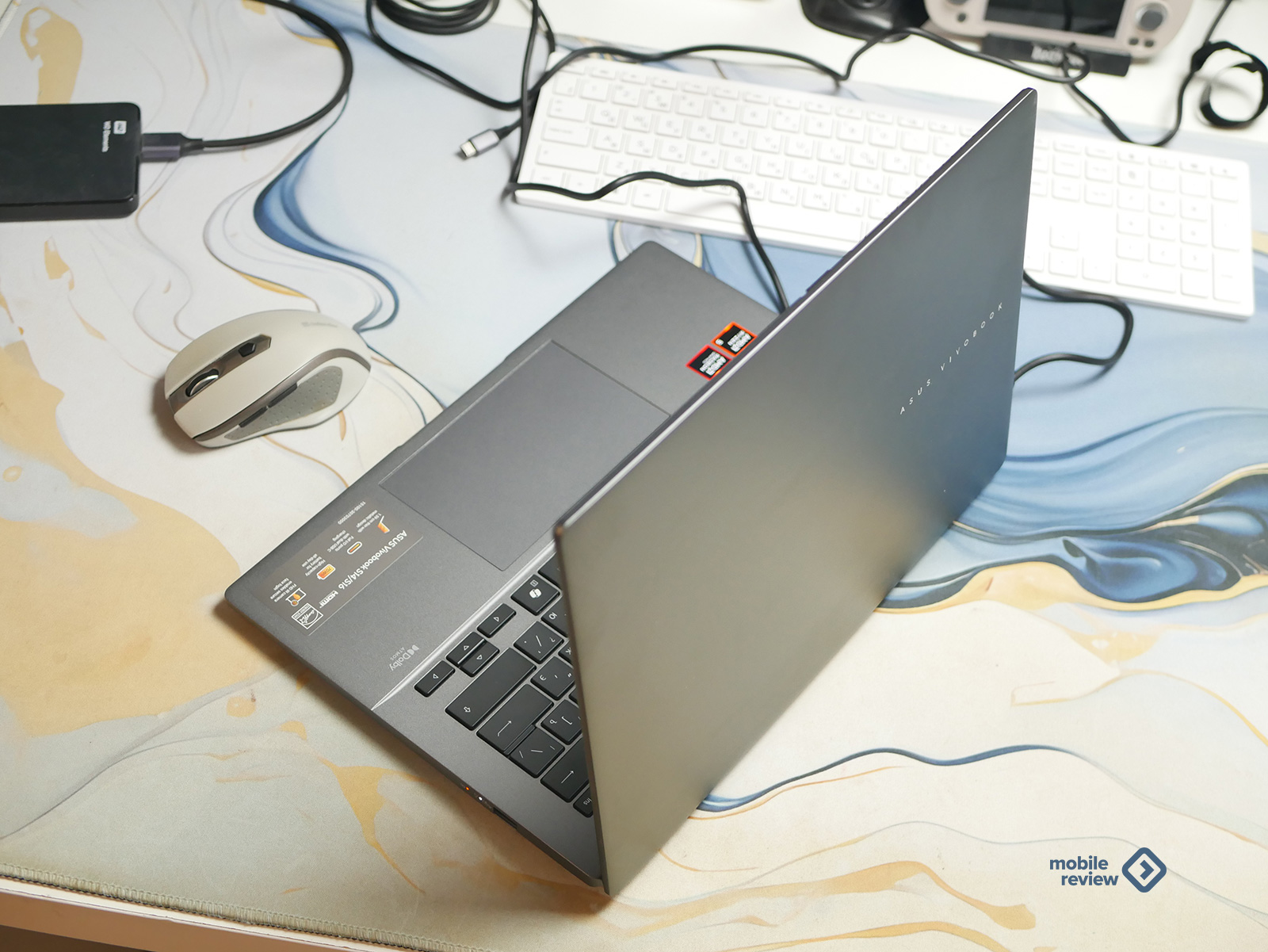 Дизайн тут минималистичный, но без намека на скуку. Верхняя крышка металлическая, с ненавязчивой гравировкой ASUS VIVOBOOK. Забавно, но под разными углами освещения эта надпись как будто играет гранями — мелочь, а приятно. Нижняя часть тоже металлическая, а вот остальная «оболочка» — из такого интересного пористого пластика: на ощупь материал очень приятный, прочный, и, что особенно радует, на нем почти не видны отпечатки пальцев. Хотя, конечно, со временем царапины и потертости неизбежны — с любым гаджетом так.